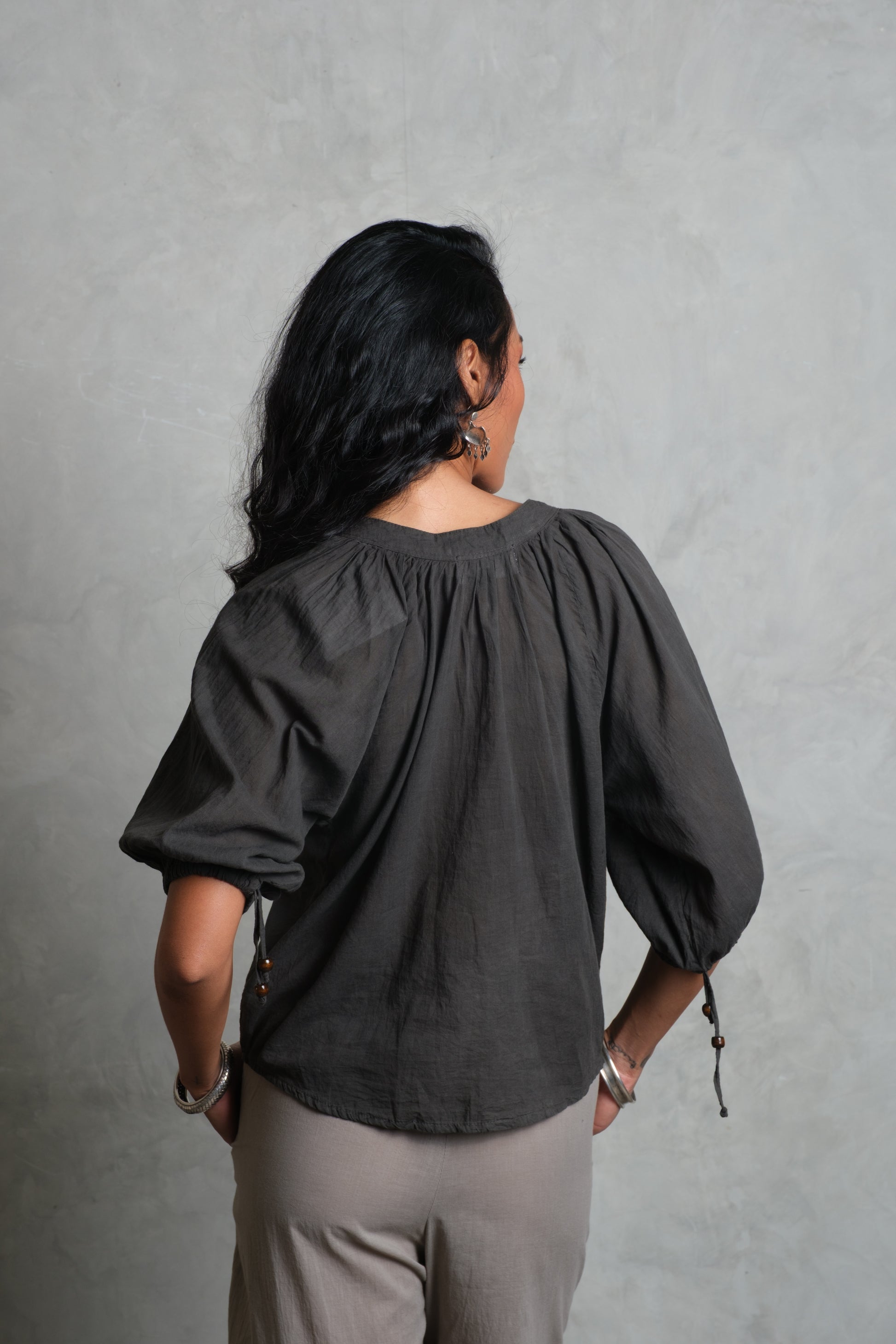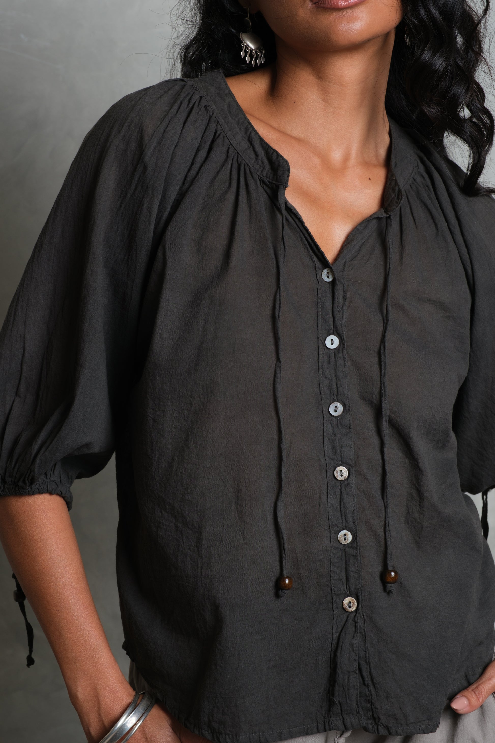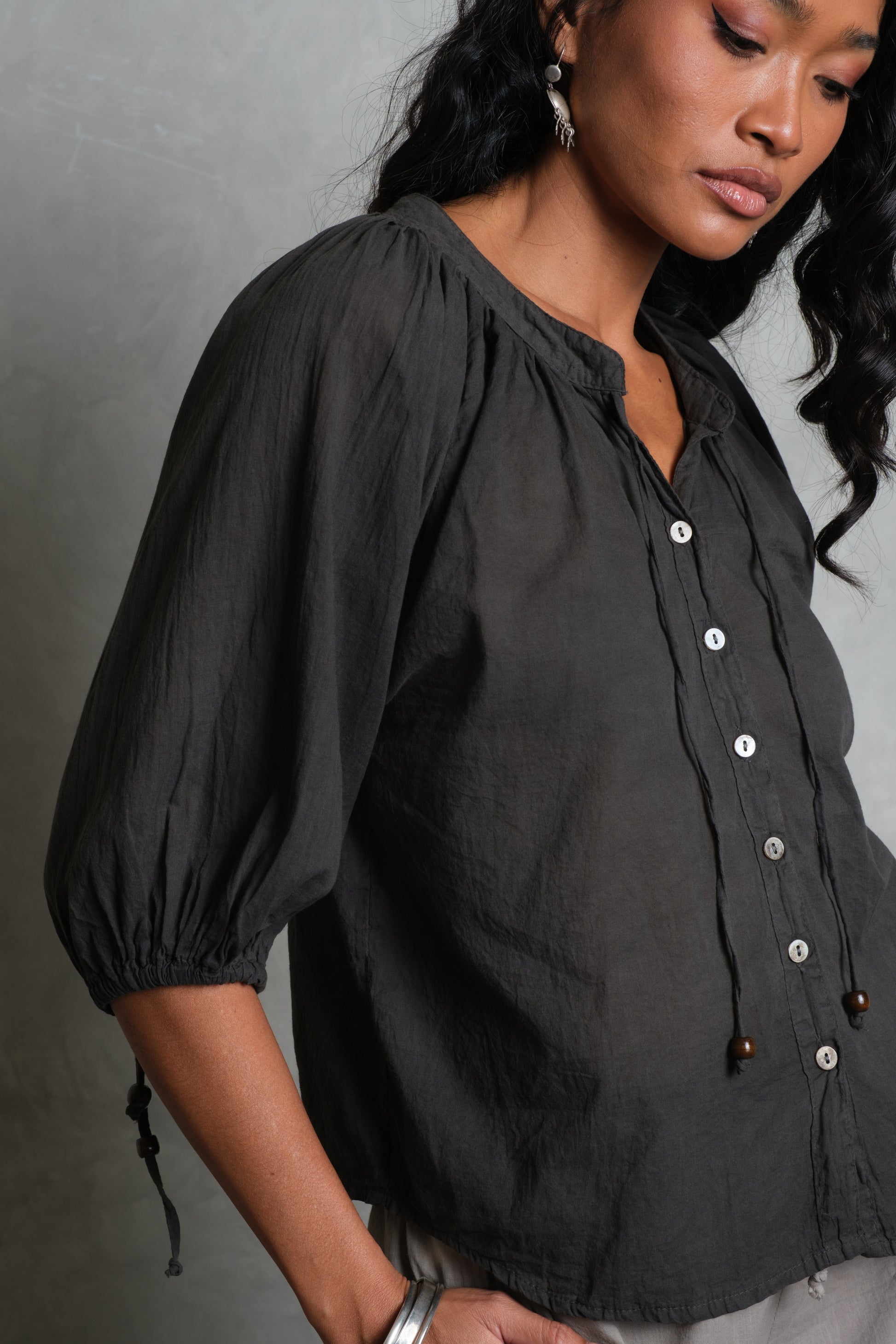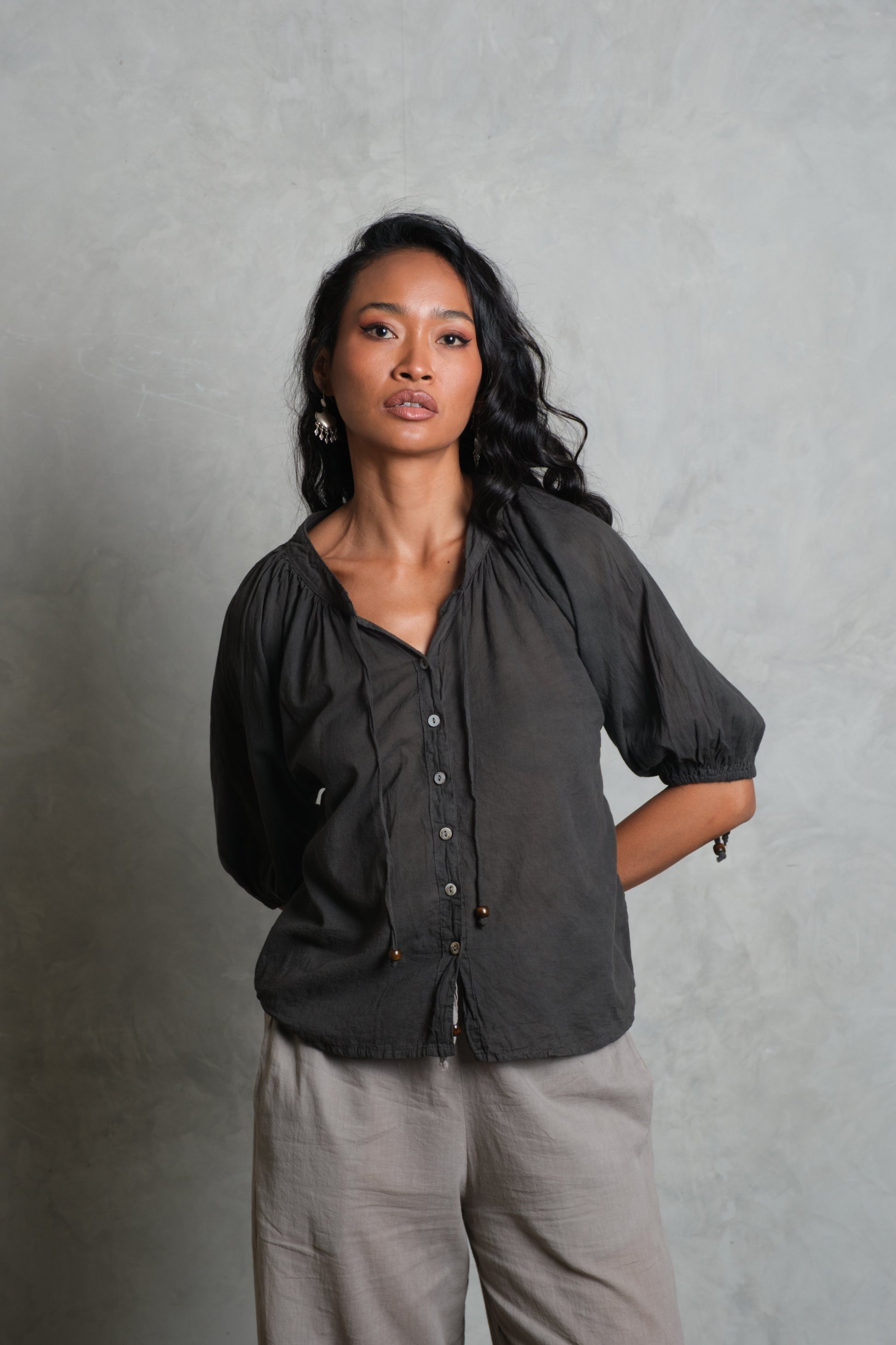 The AKASHA Top is a lightweight, relaxed piece designed for effortless wear. Cut with a softly gathered neckline and button-down front, it features gentle volume through the sleeves that taper with subtle ties at the cuff. A drawstring neckline finished with wooden bead details adds a bohemian touch, while the airy cotton fabric makes it perfect for layering or wearing on its own. Timeless and versatile, the AKASHA balances ease with quiet elegance.