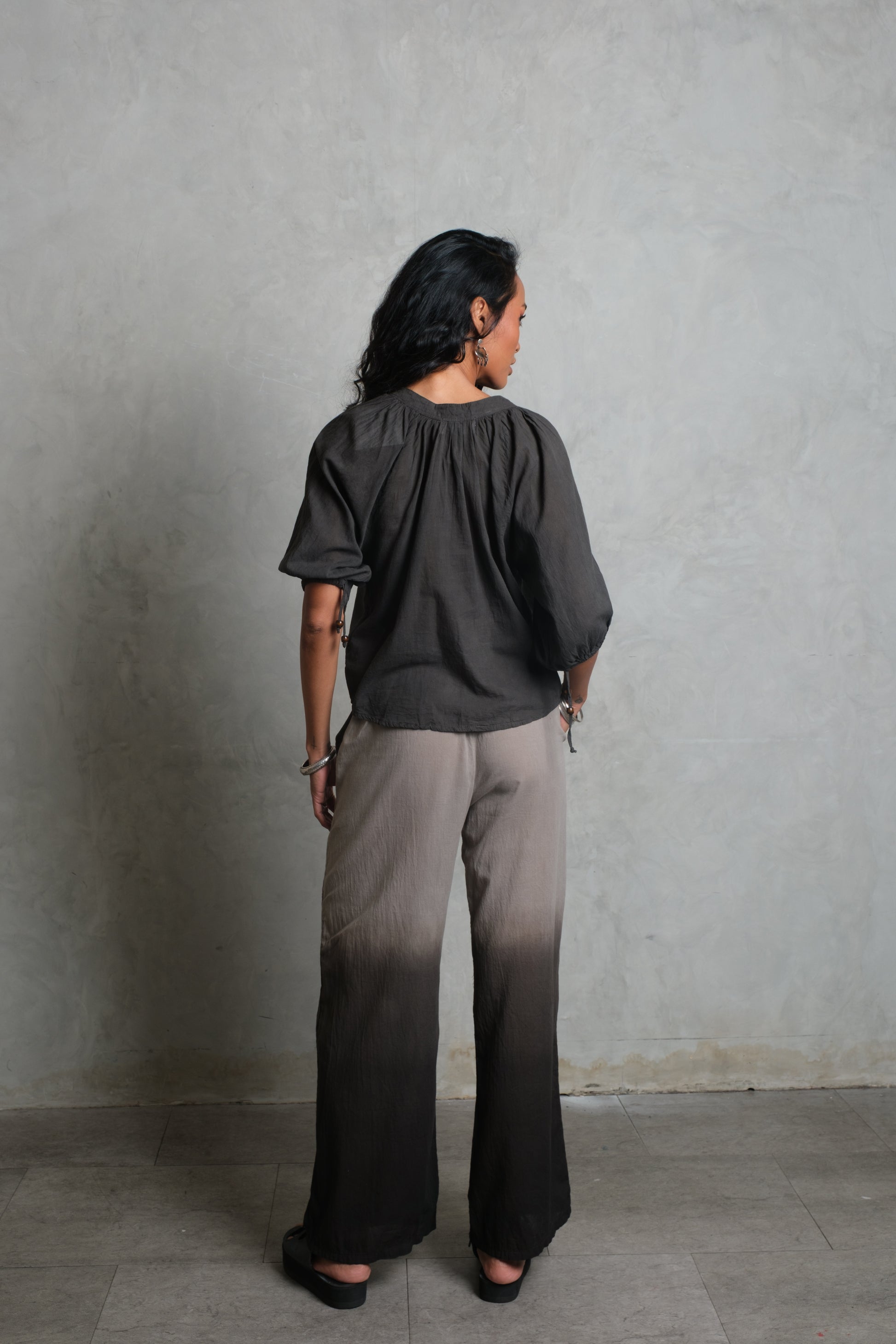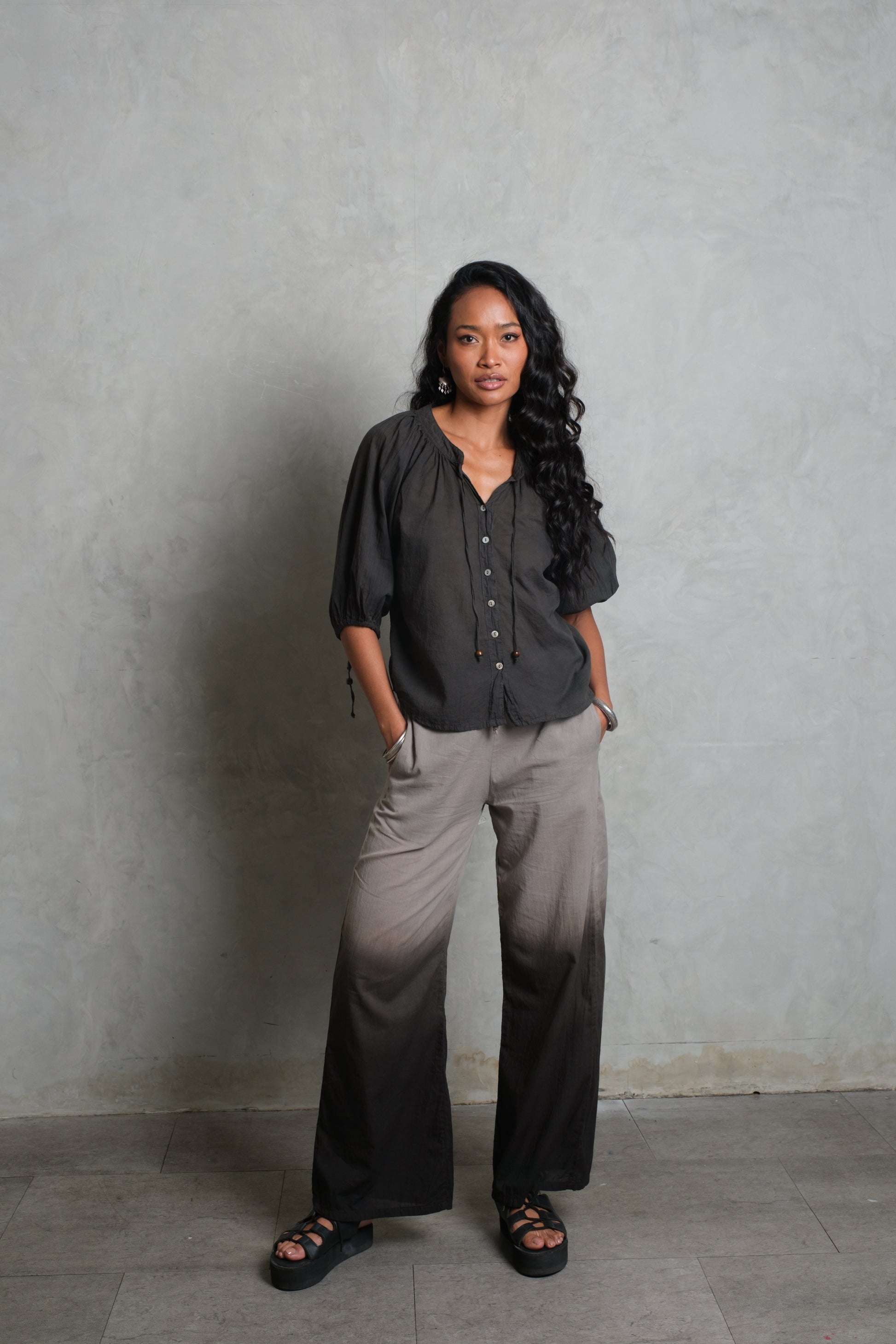 The AKASHA Top is crafted from organic cotton sourced from northern India, a region renowned for its rich textile heritage. In southern Bali, cottage-industry artisans cut and sew each piece with care, preserving traditional methods of handcraft. The fabric is then naturally dyed in northern Bali using pigments derived from plants, creating soft, living tones that make every top unique.