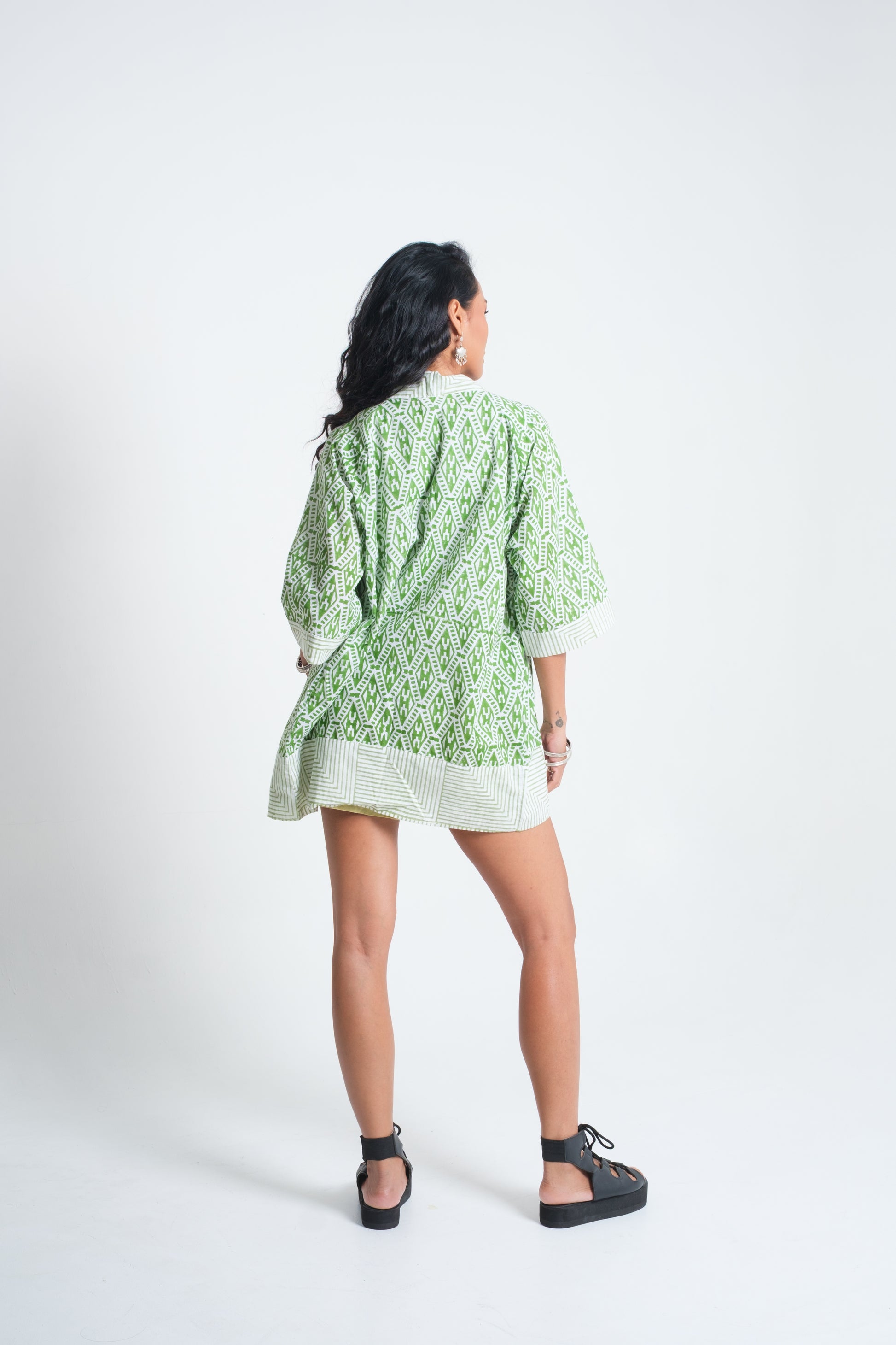 The ALCHEMY Kimono by iL Bohémien is a free-spirited statement piece, crafted from organic cotton and finished with traditional hand block printing. Designed with a relaxed open-front cut, wide three-quarter sleeves, and a self-tie belt, it balances ease with shape. Two distinct prints are combined — a bold pattern for the base and a contrasting motif for the borders — showcasing artisanal precision and a love for detail. Available in Flame, a vibrant red that radiates energy, and Emerald, a fresh green that embodies balance and renewal. Lightweight and versatile, the ALCHEMY Kimono moves effortlessly from island days to soulful evenings, carrying the true spirit of bohemian living.