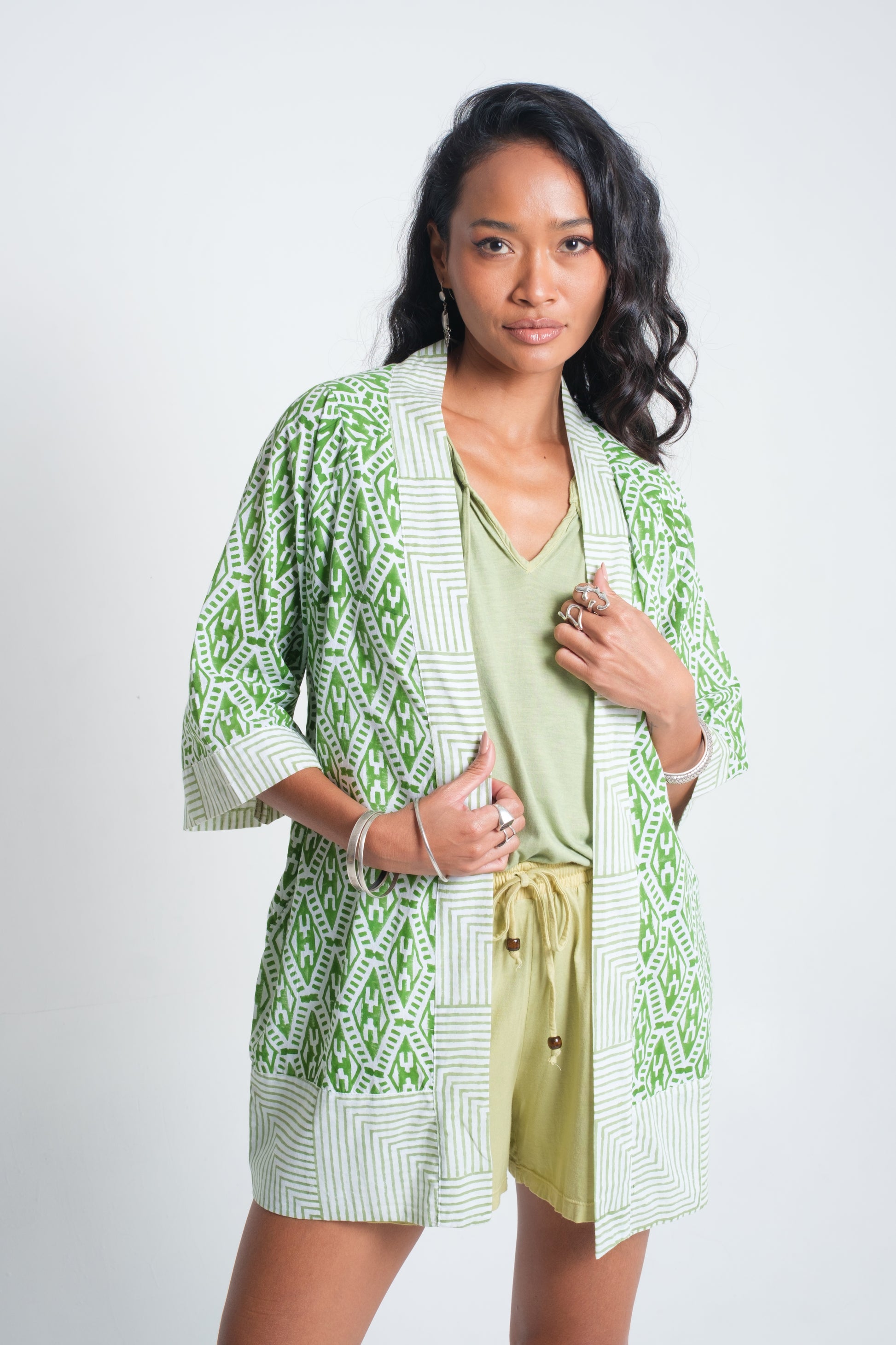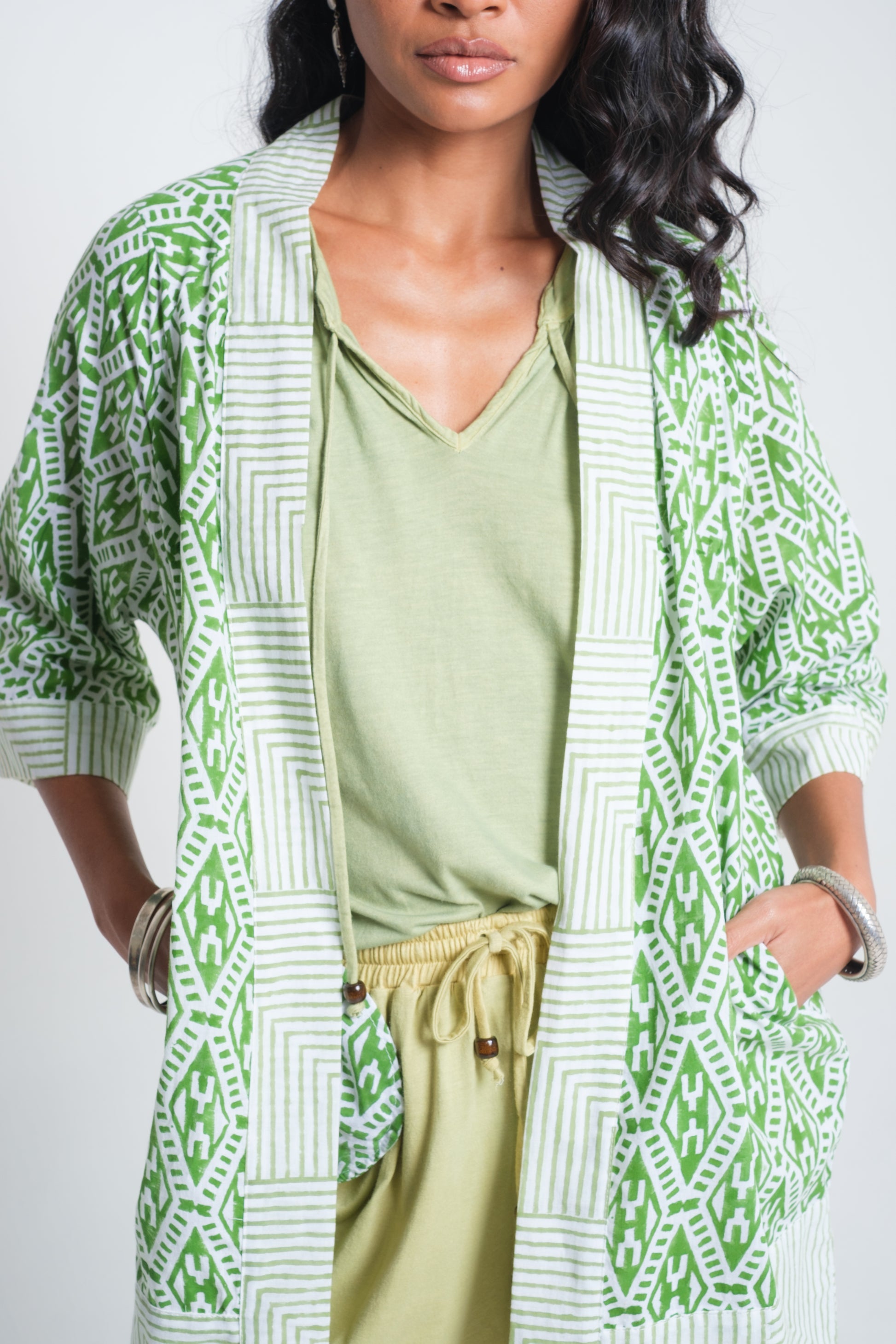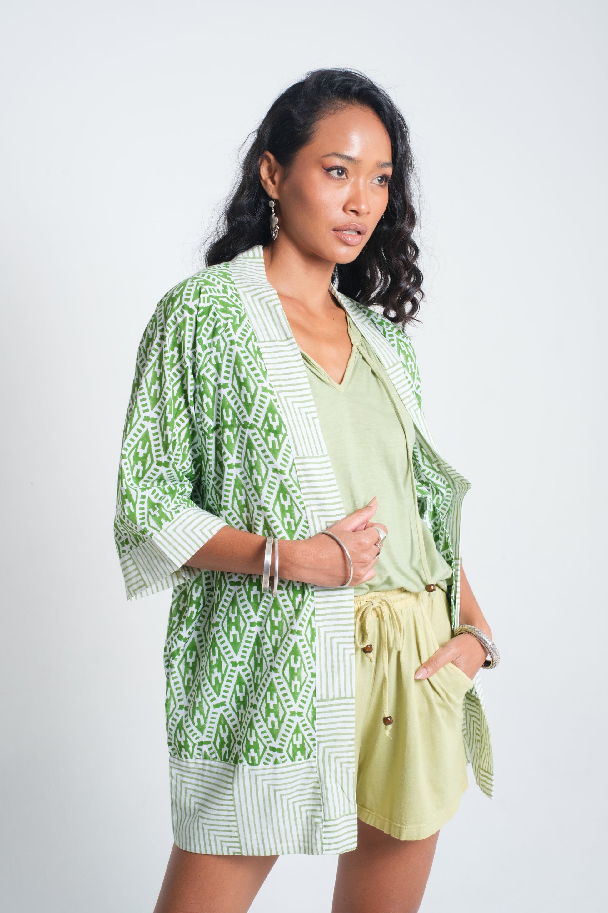 The ALCHEMY Kimono begins with organic cotton sourced in Jaipur, India, where the fabric is hand block-printed by master artisans using age-old techniques passed down through generations. Each length of cloth is carefully pressed with carved wooden blocks to achieve its bold, layered patterns. The printed fabric then travels to Bali, where our artisans cut and sew each kimono with care, shaping it into a garment that carries both the heritage of Jaipur’s craft and the spirit of Bali’s handwork. Every piece is finished with subtle variations, making it truly one of a kind.