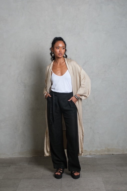 The AMINA Pants are crafted from French linen, chosen for its breathable softness and refined drape. Each pair is cut and sewn by cottage-industry artisans in southern Bali, where traditional craftsmanship shapes the design. The fabric is naturally dyed in northern Bali using plant-based pigments, a slow process that gives depth and character to every garment. Entirely handcrafted, the AMINA Pants embody the timeless elegance and unique artistry of Bali.