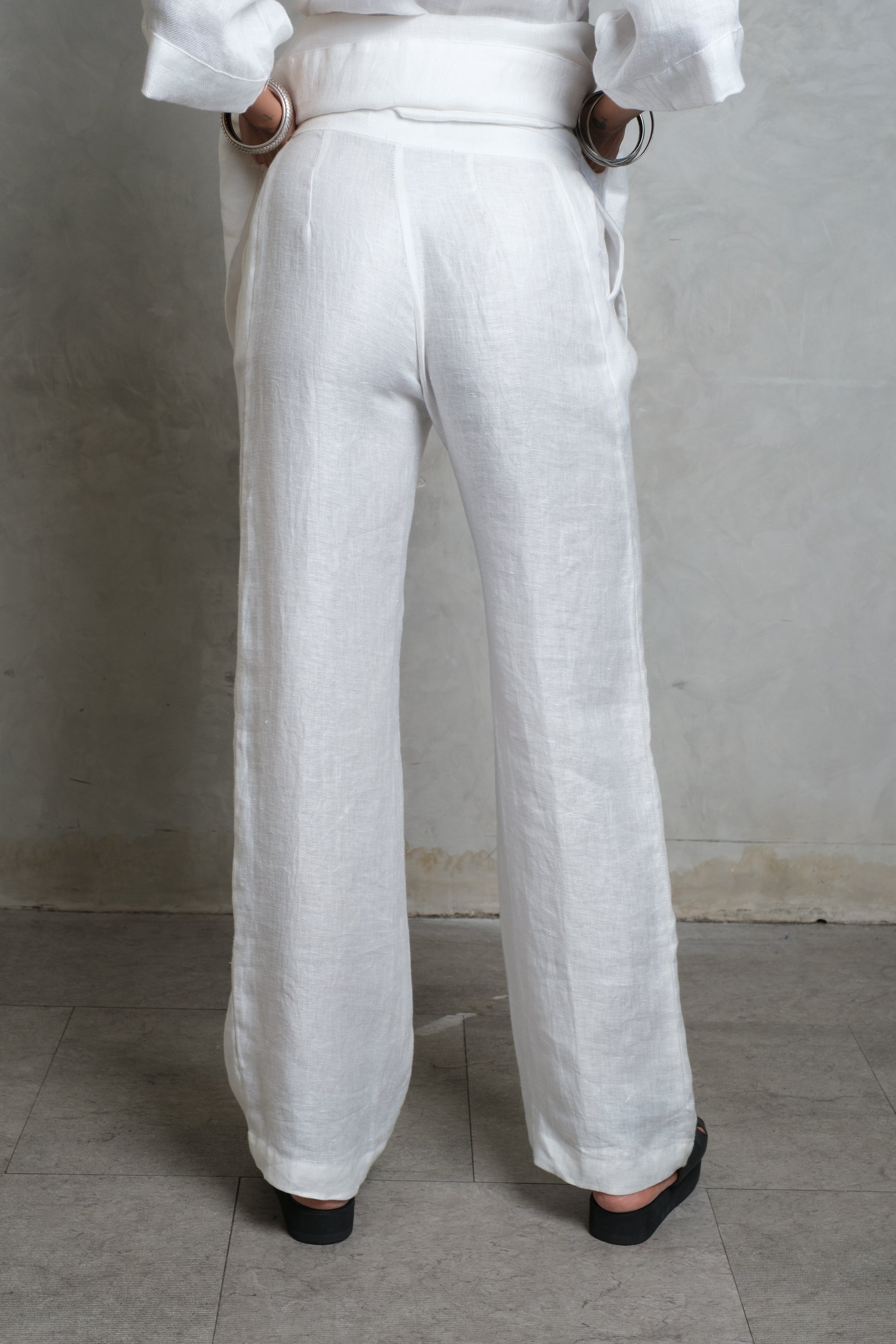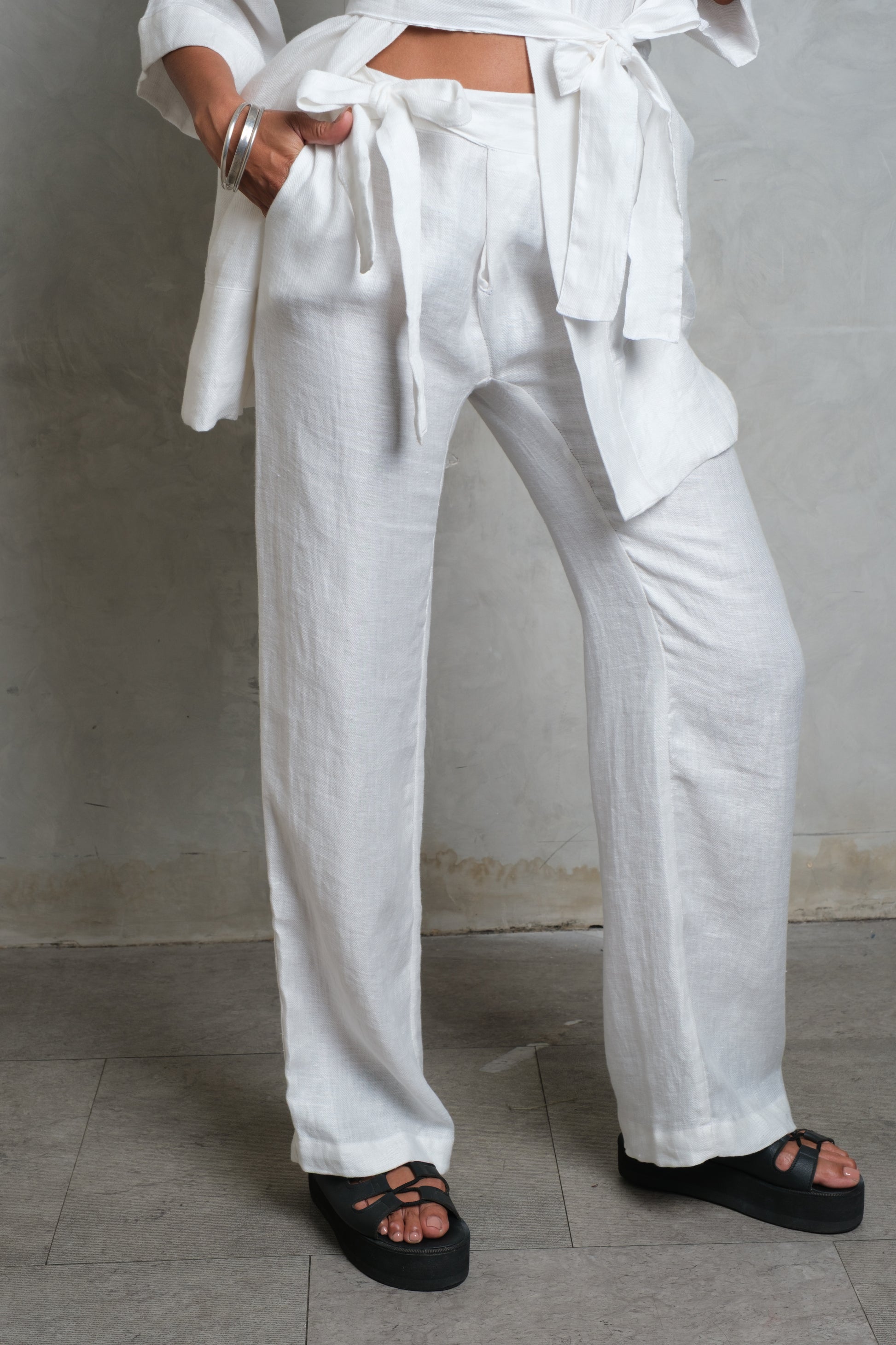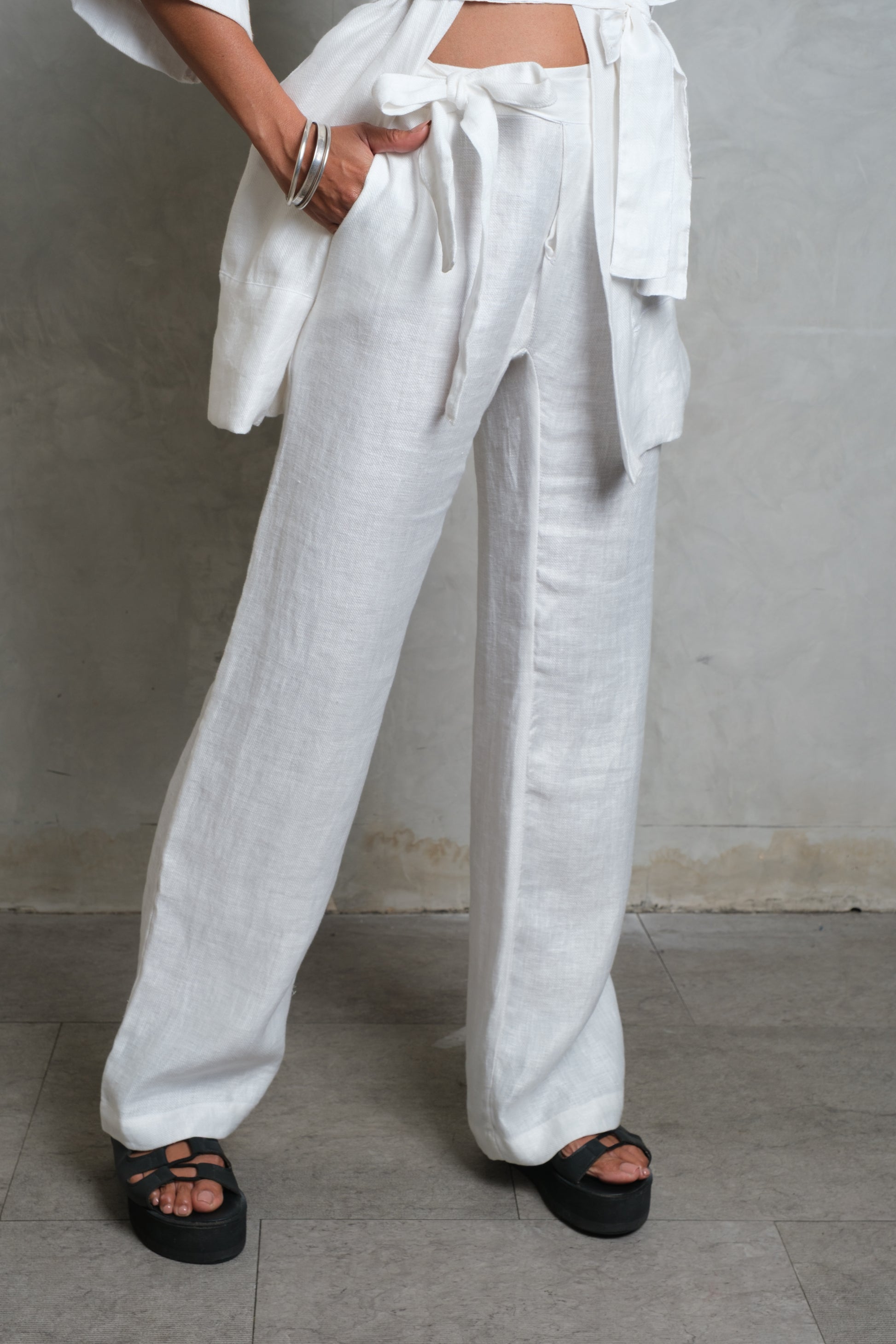 The AMINA Pants are cut from French linen with a refined, narrow silhouette that lengthens the leg. Designed with a built-in belt tie that wraps across the waist and secures at the front in a bow, they bring both elegance and ease to everyday dressing. Offered in pure Snow White or naturally dyed Apache Black, the AMINA reflects MALA’s philosophy of understated sophistication — timeless, versatile, and effortlessly stylish.