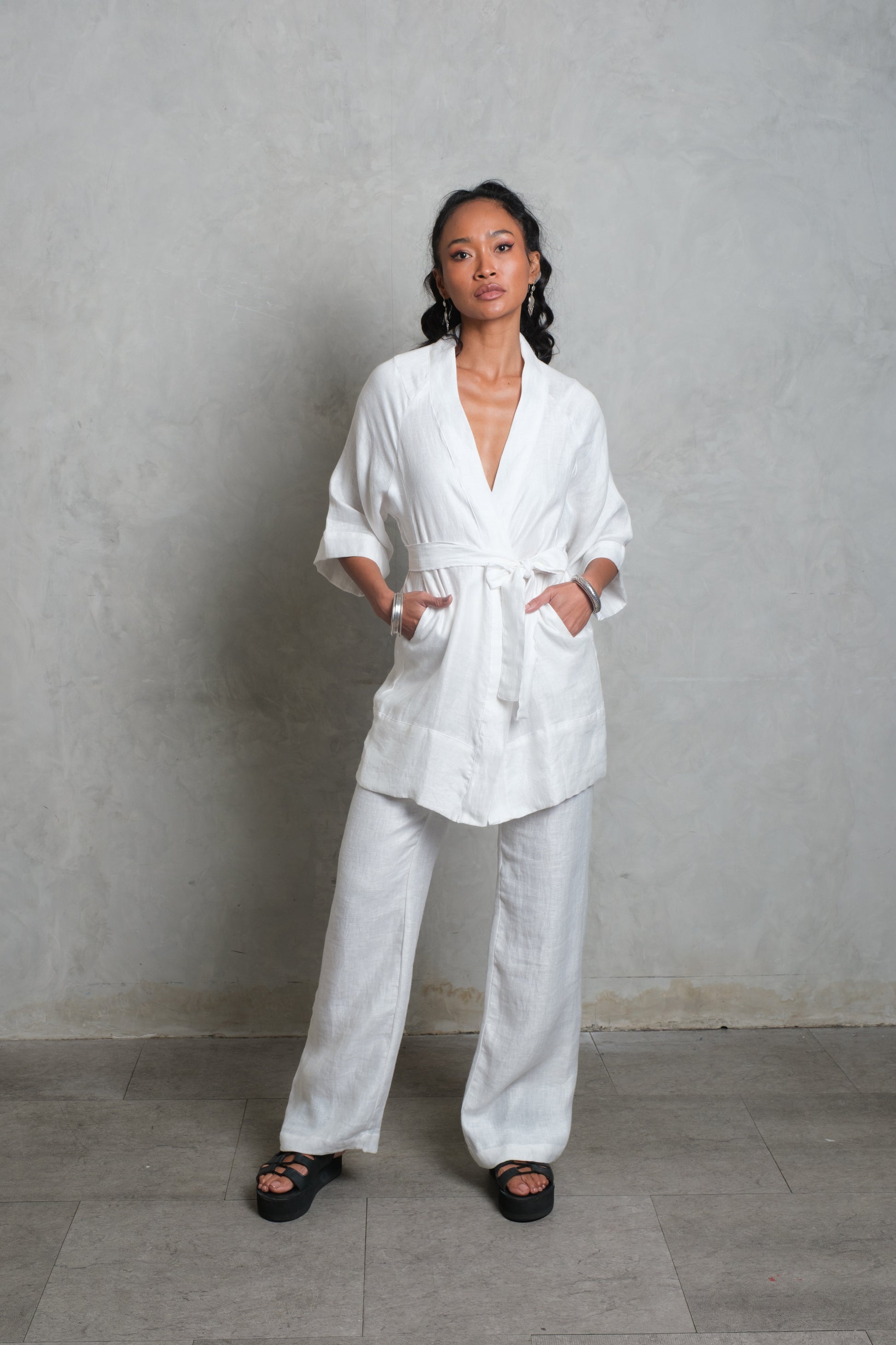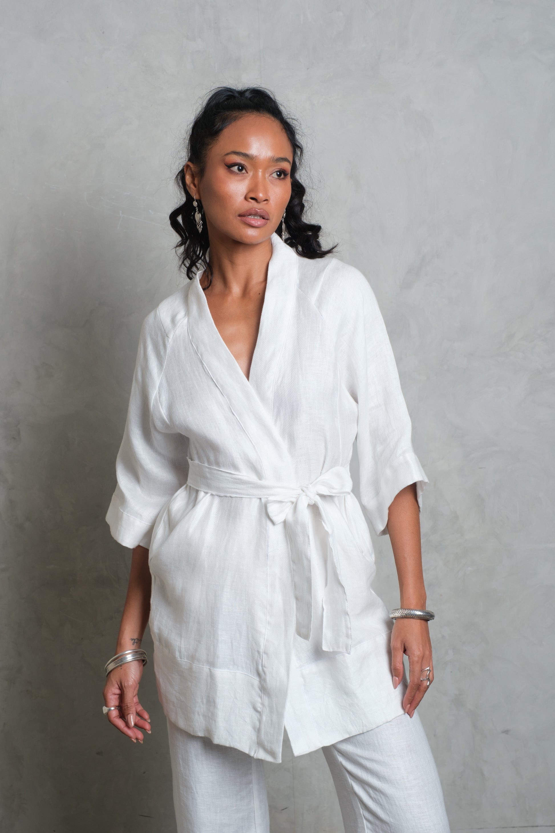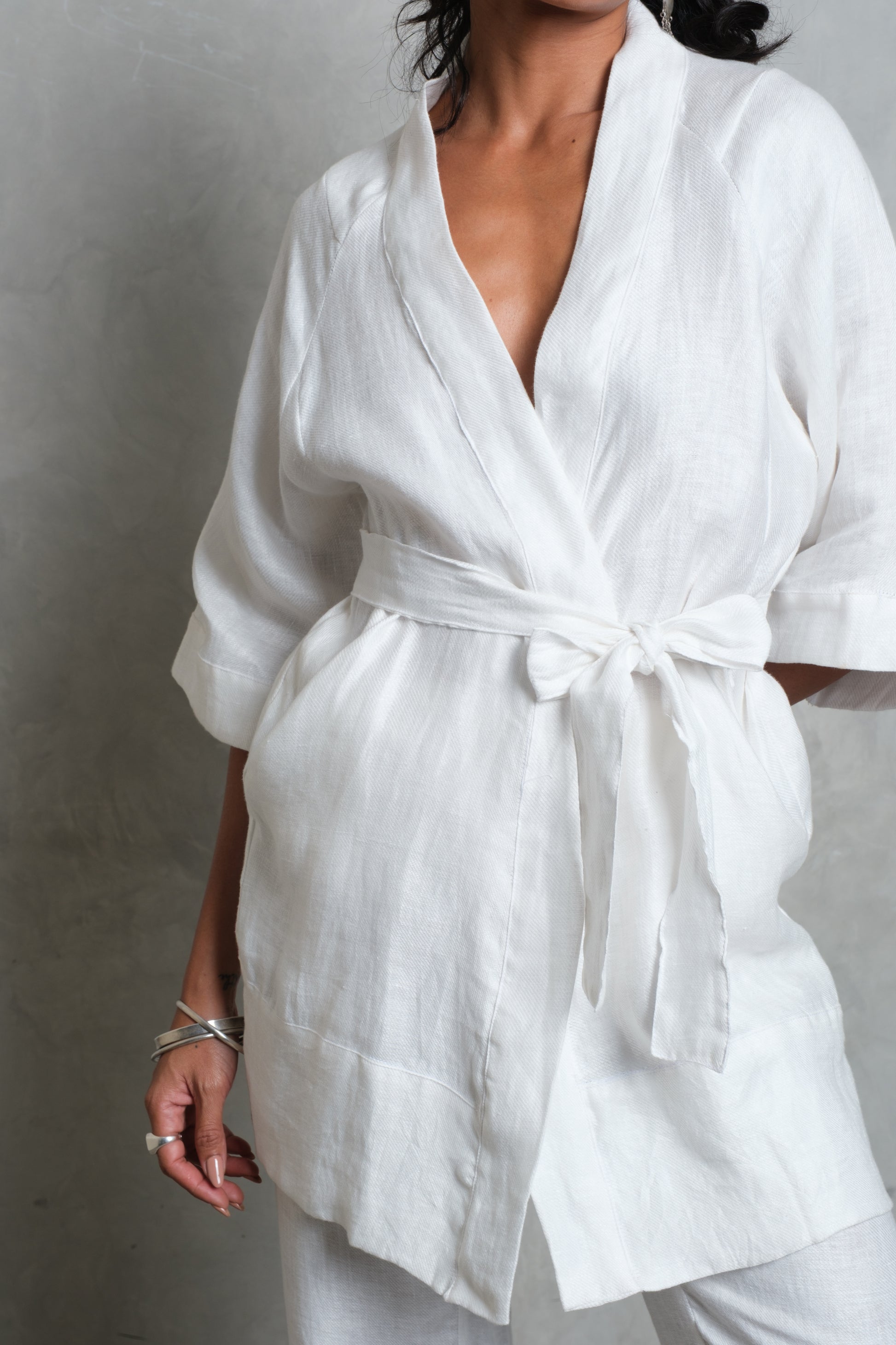 The CANANG Kimono is a timeless piece, cut from pure linen for a naturally breathable and elegant drape. Designed with a wrap front and a self-tie belt, it offers both structure and flow, allowing it to be worn loose or cinched at the waist. Three-quarter sleeves add ease and balance, while the clean finish keeps the look effortlessly refined. Lightweight and versatile, the CANANG is equally suited for layering over relaxed separates or styled as a statement on its own.
