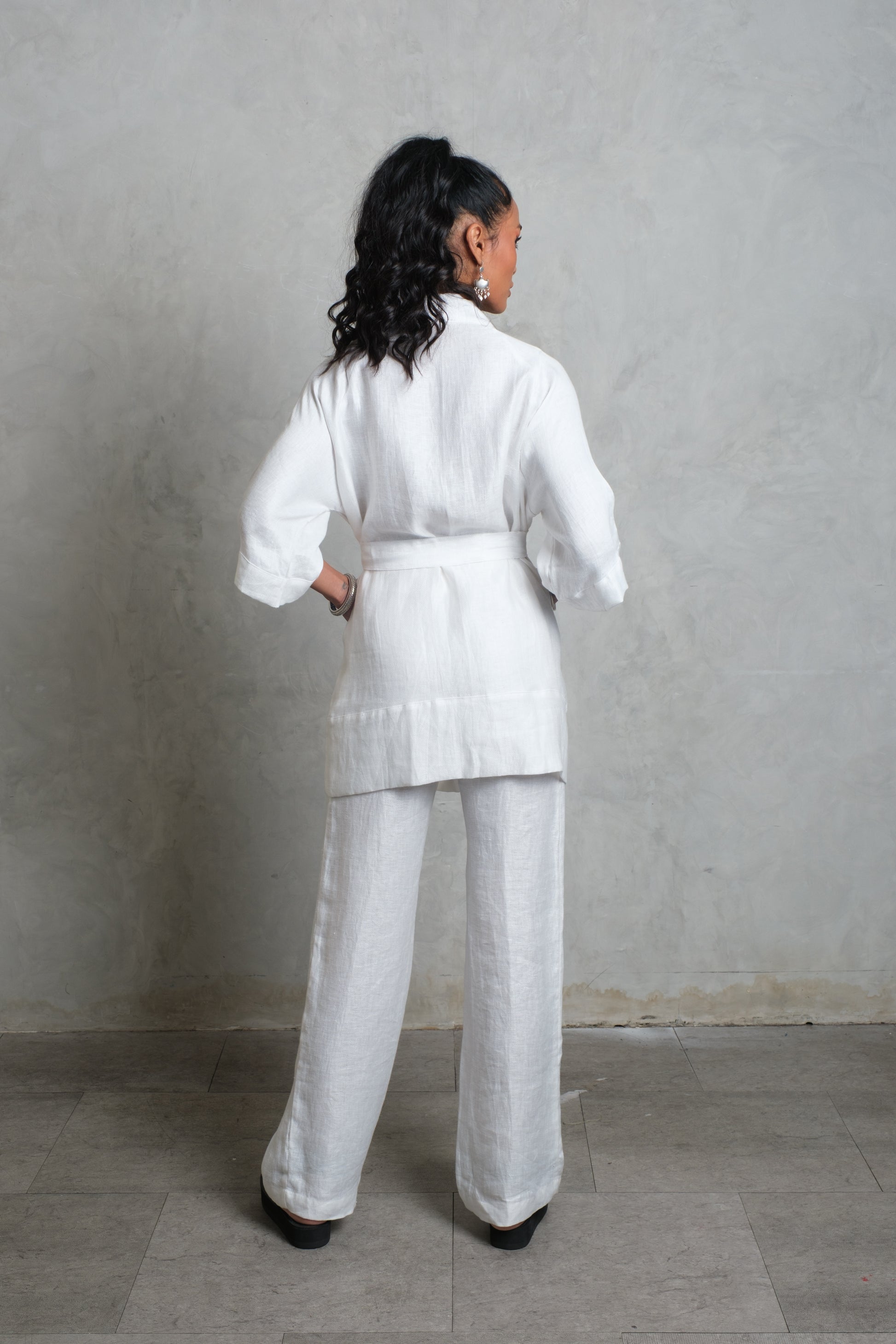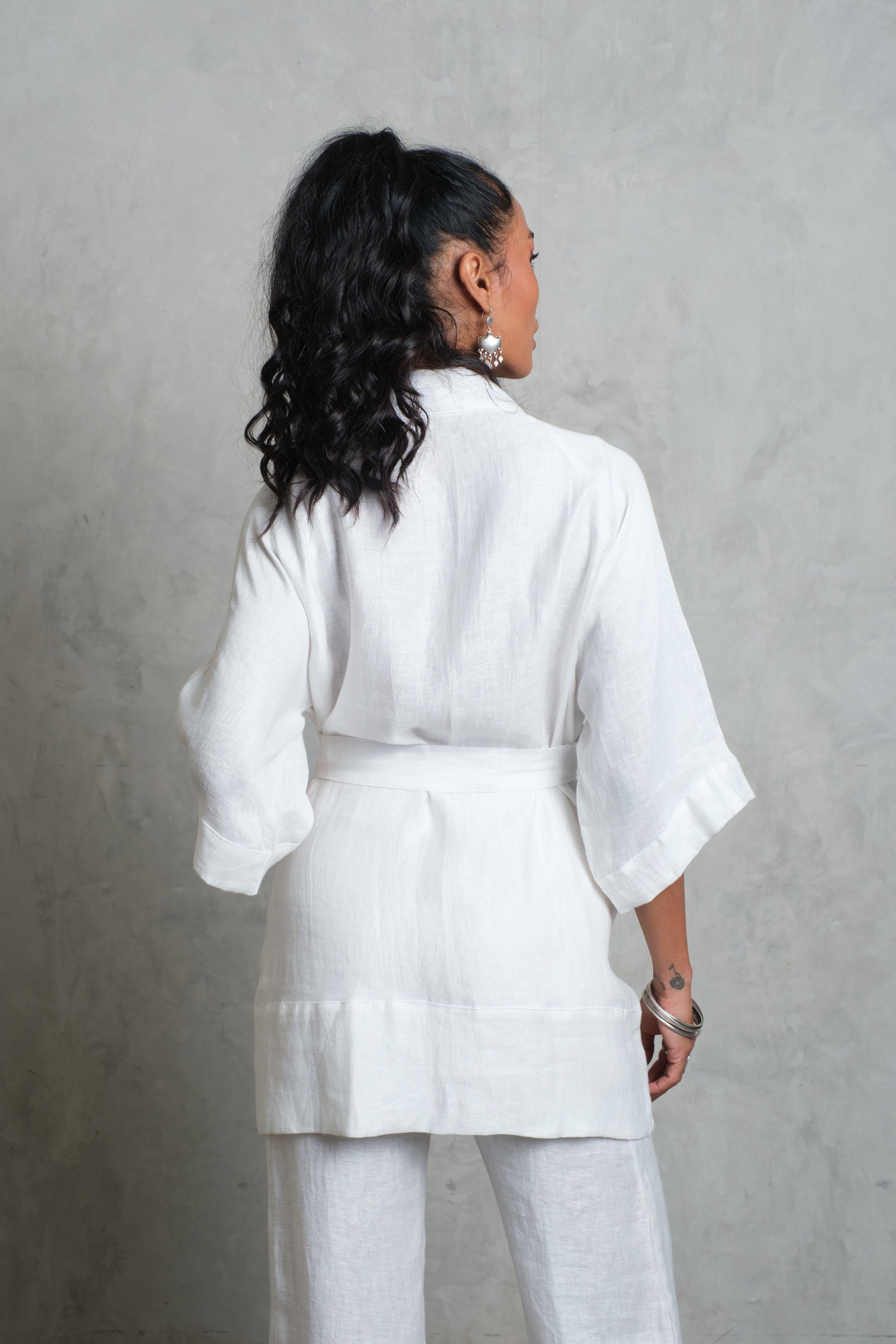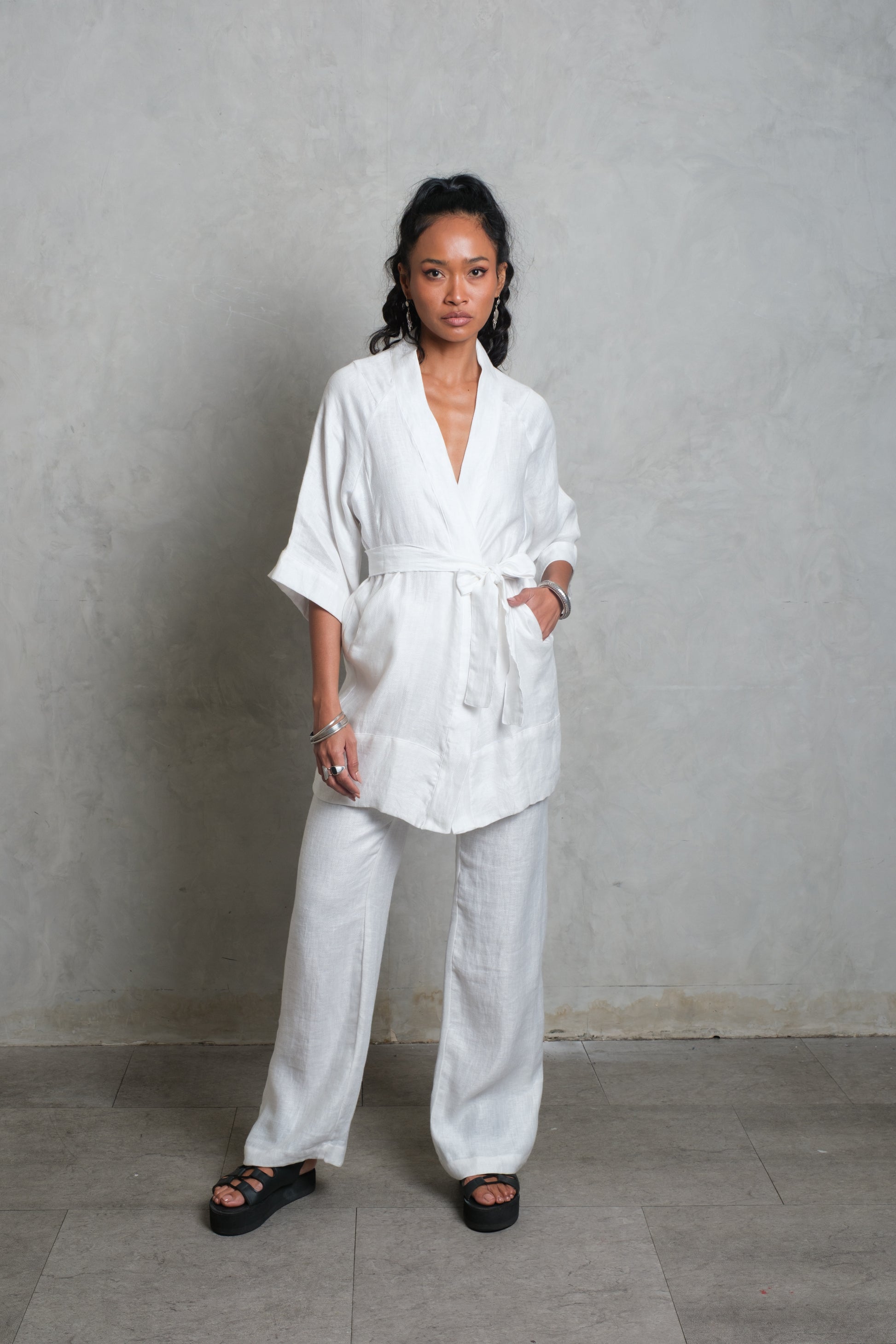 The CANANG Kimono is a timeless piece, cut from pure linen for a naturally breathable and elegant drape. Designed with a wrap front and a self-tie belt, it offers both structure and flow, allowing it to be worn loose or cinched at the waist. Three-quarter sleeves add ease and balance, while the clean finish keeps the look effortlessly refined. Lightweight and versatile, the CANANG is equally suited for layering over relaxed separates or styled as a statement on its own.