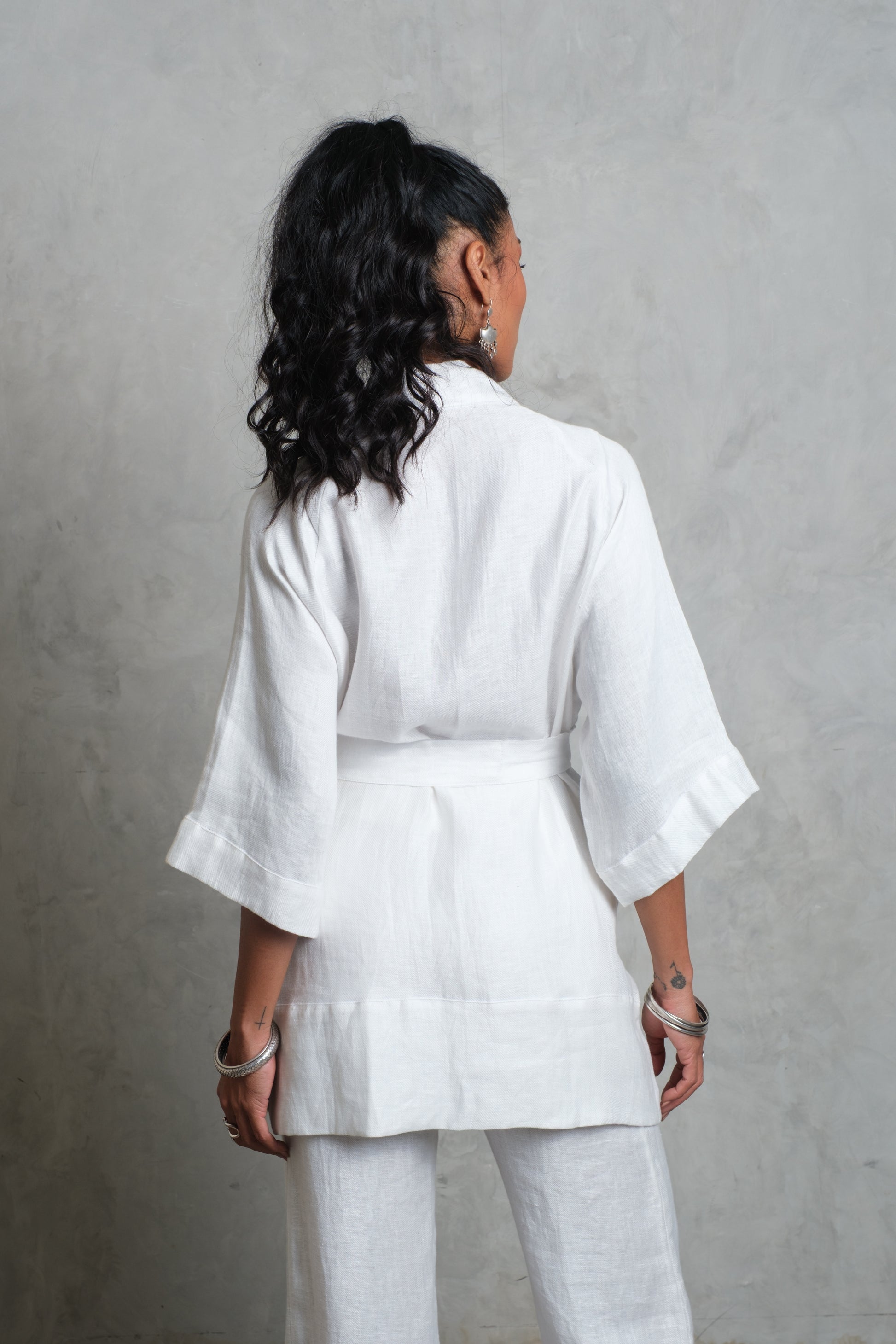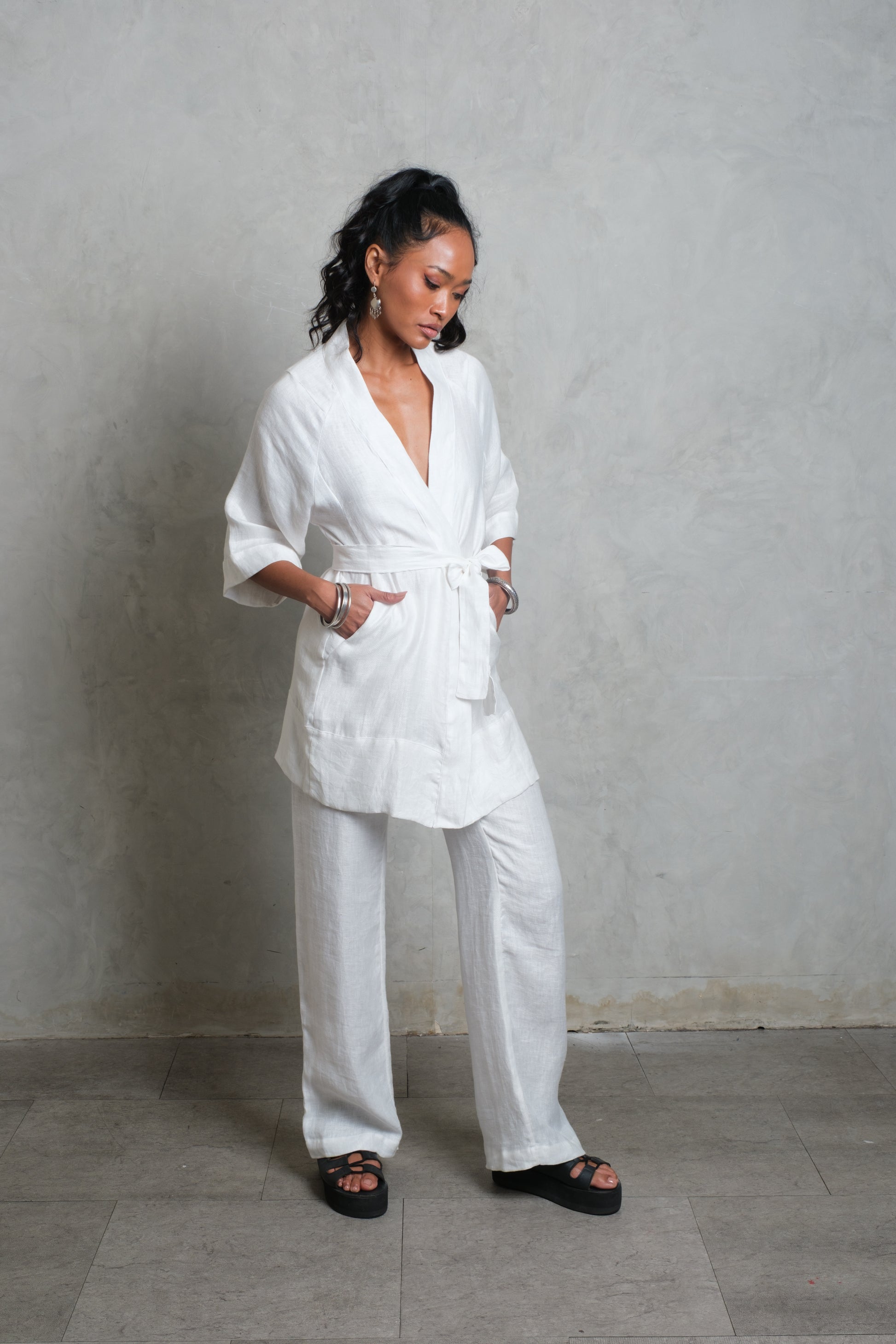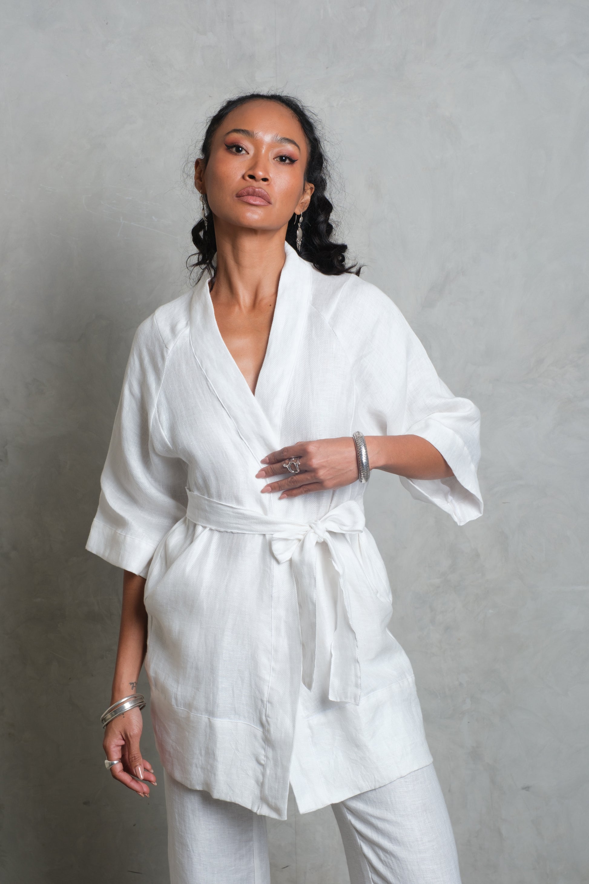 The CINTA playsuit features a relaxed wrap-front cut with a deep V neckline and wide kimono-inspired sleeves for ease and movement. A fixed self-tie belt defines the waist, balancing structure with an effortless drape. Side pockets add practicality, while the mid-thigh length keeps the look versatile — equally suited for barefoot afternoons or styled with boots for a modern edge.