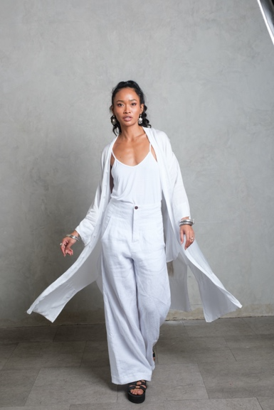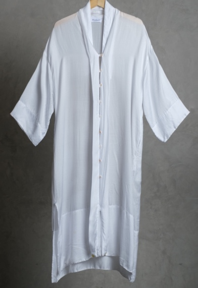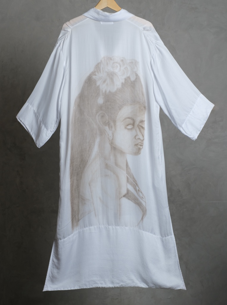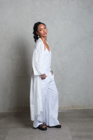 The DEWI Kimono is crafted in pure silk, embodying refined elegance with a resort sensibility. Naturally hand-dyed in ombré shades of Smoke, Snow White, and Moonstone, it flows with understated sophistication. Each kimono is elevated by a hand-painted mural on the back, transforming it into a wearable piece of art. Finished with a silk belt to shape the silhouette, the DEWI reflects the Muda js. philosophy — effortless class, natural simplicity, and timeless style.