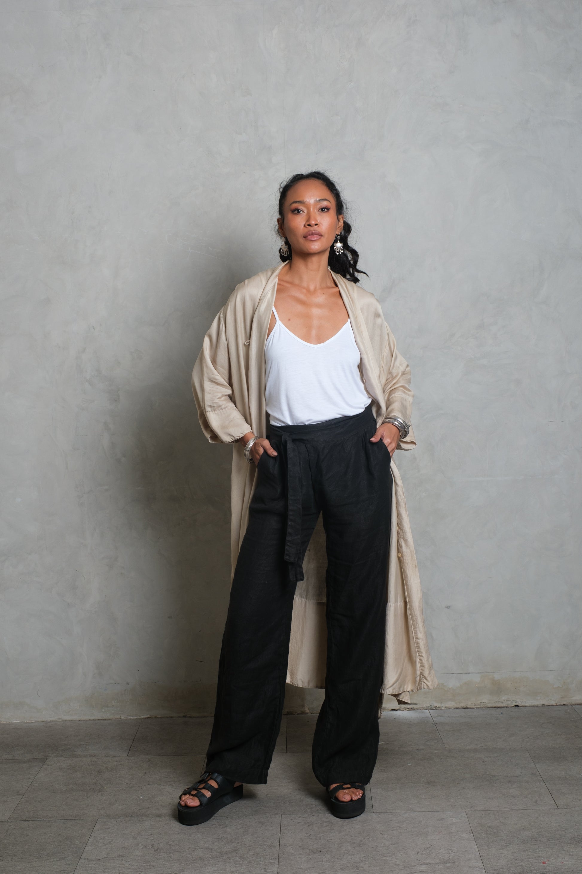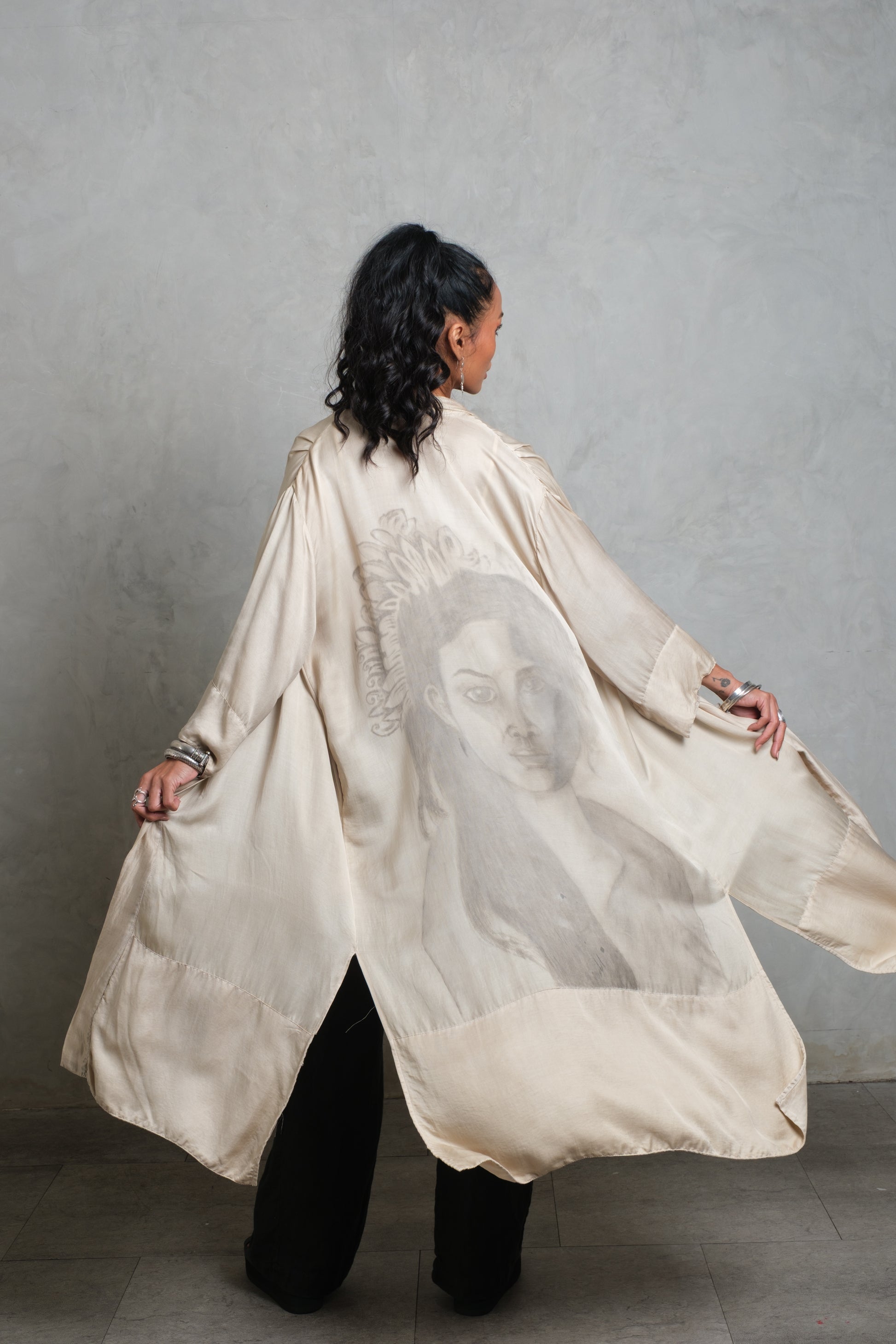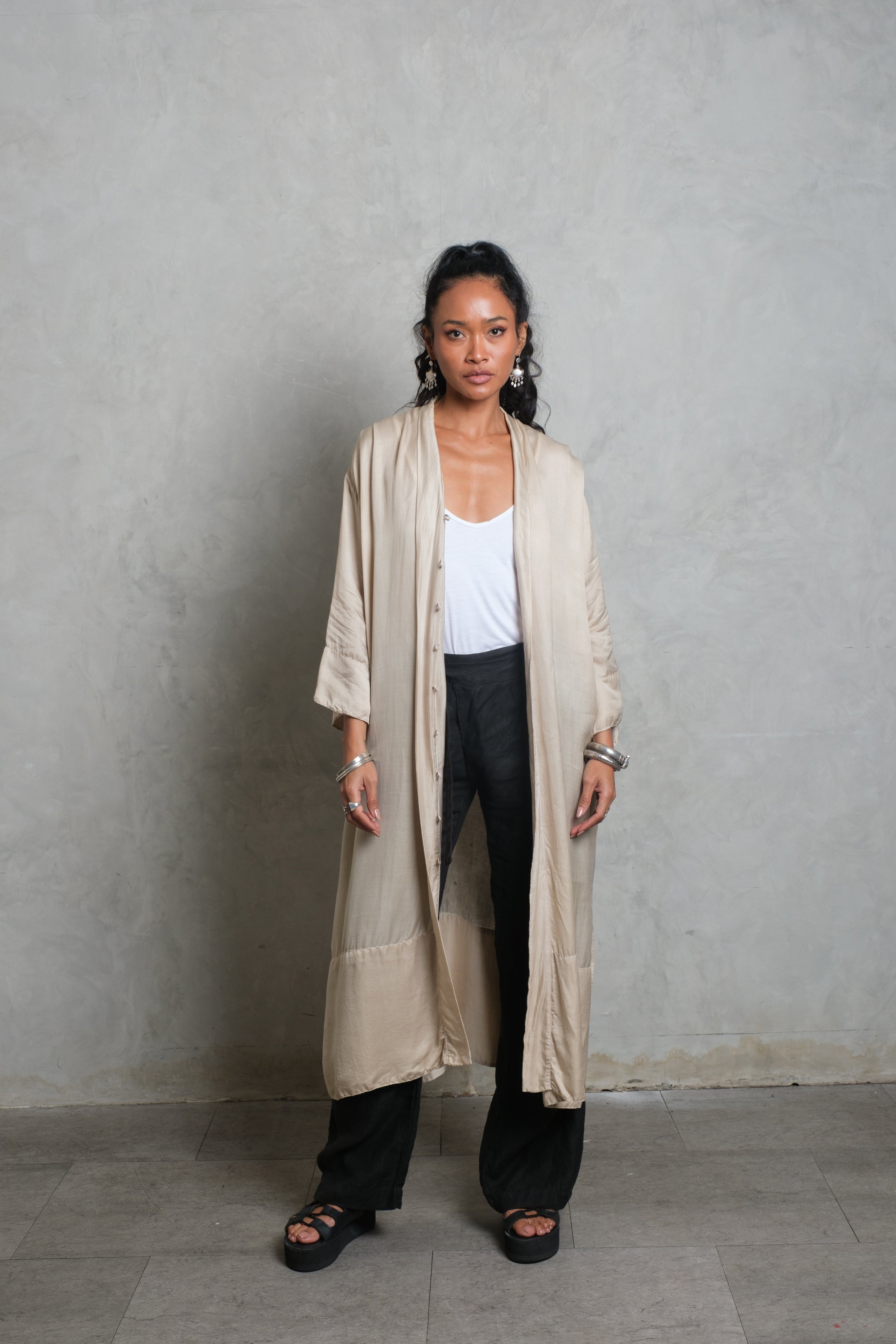 The DEWI Kimono is crafted from pure silk, hand-cut and sewn by skilled Balinese artisans. Each piece is naturally dyed in Bali using plant-based pigments, applied in an ombré finish that flows with subtle depth and tone. The back is then hand-painted, transforming the garment into a mural of wearable art. Entirely handcrafted from start to finish, every DEWI Kimono is a unique expression of Muda js. elegance and artistry.