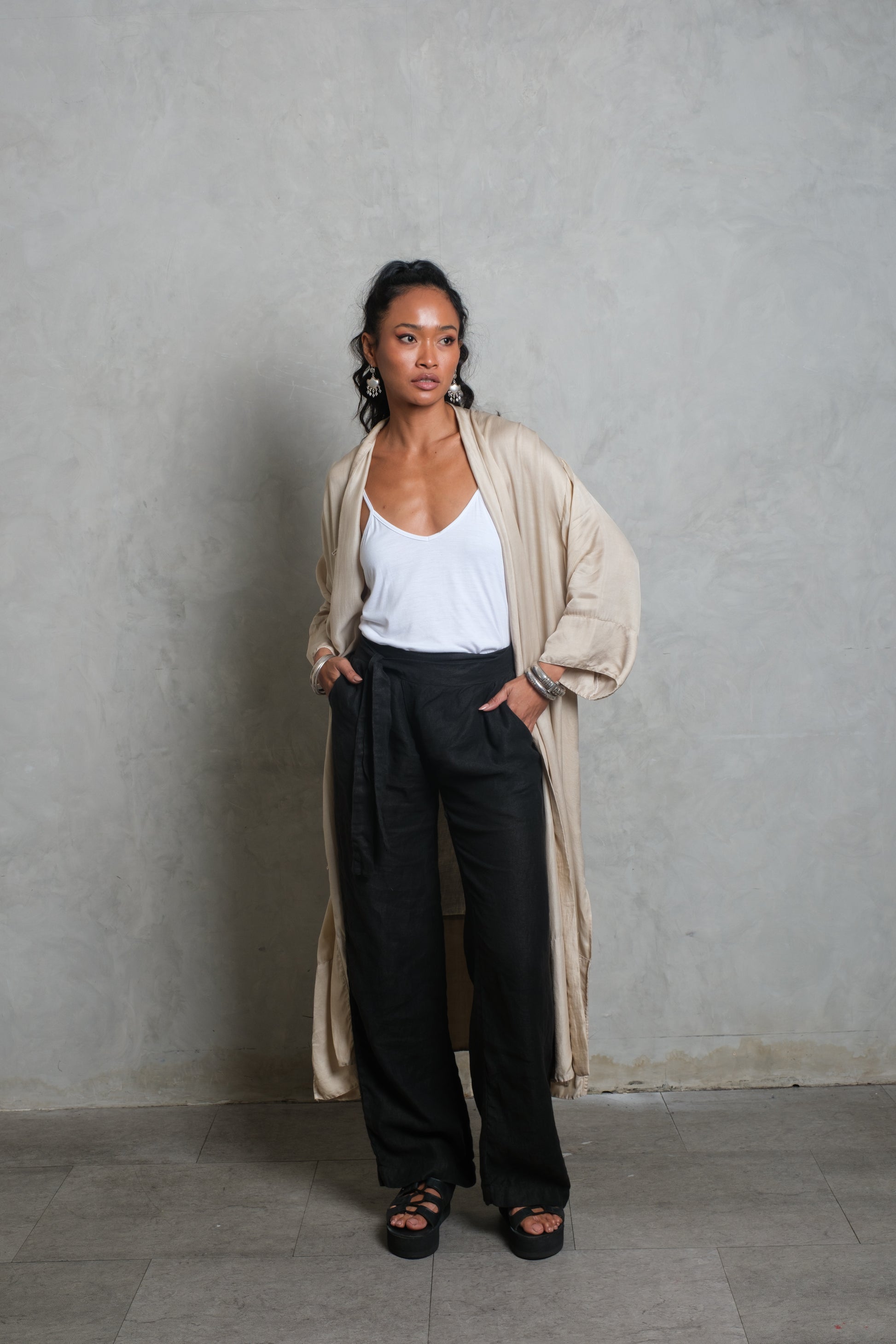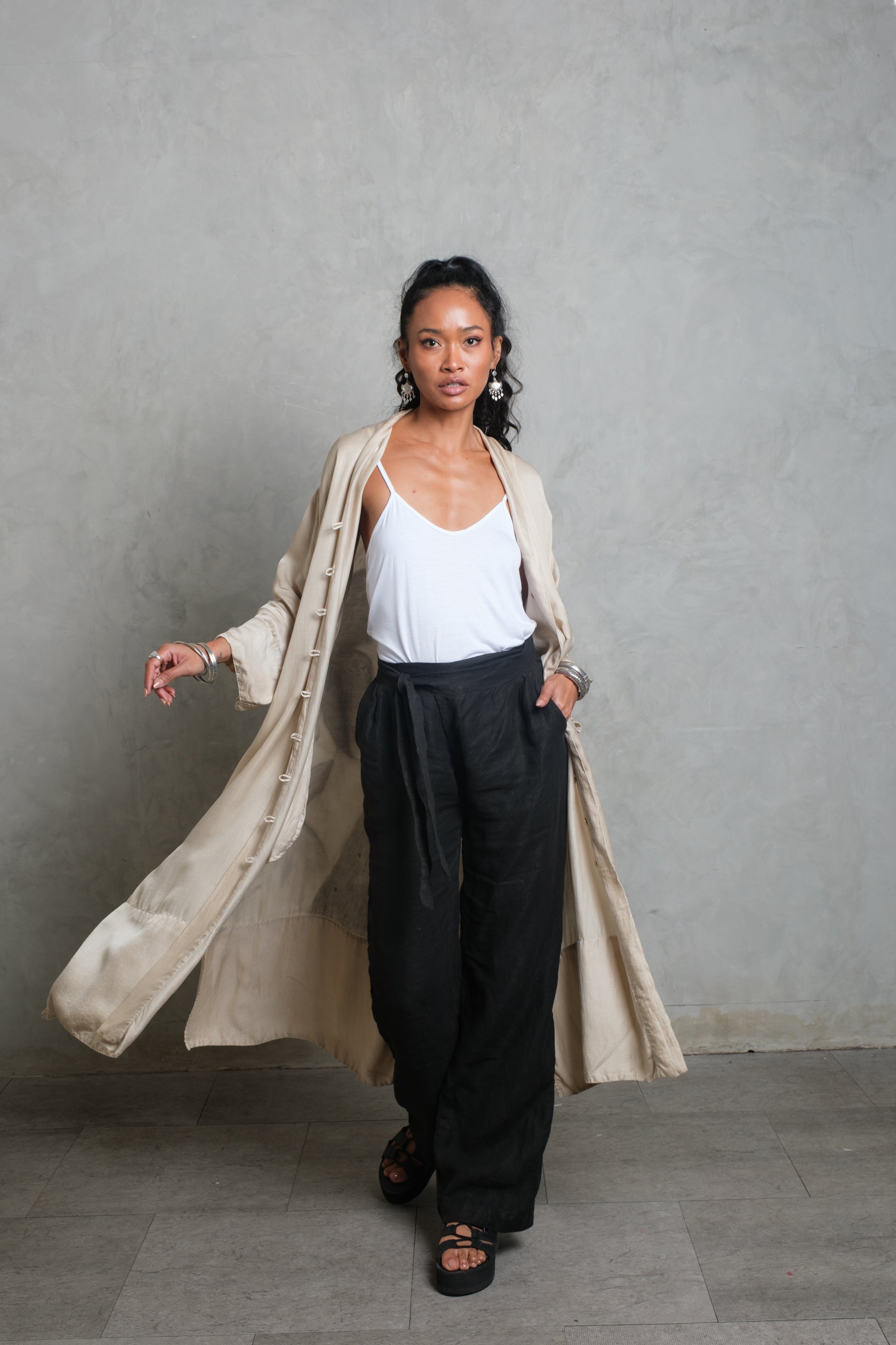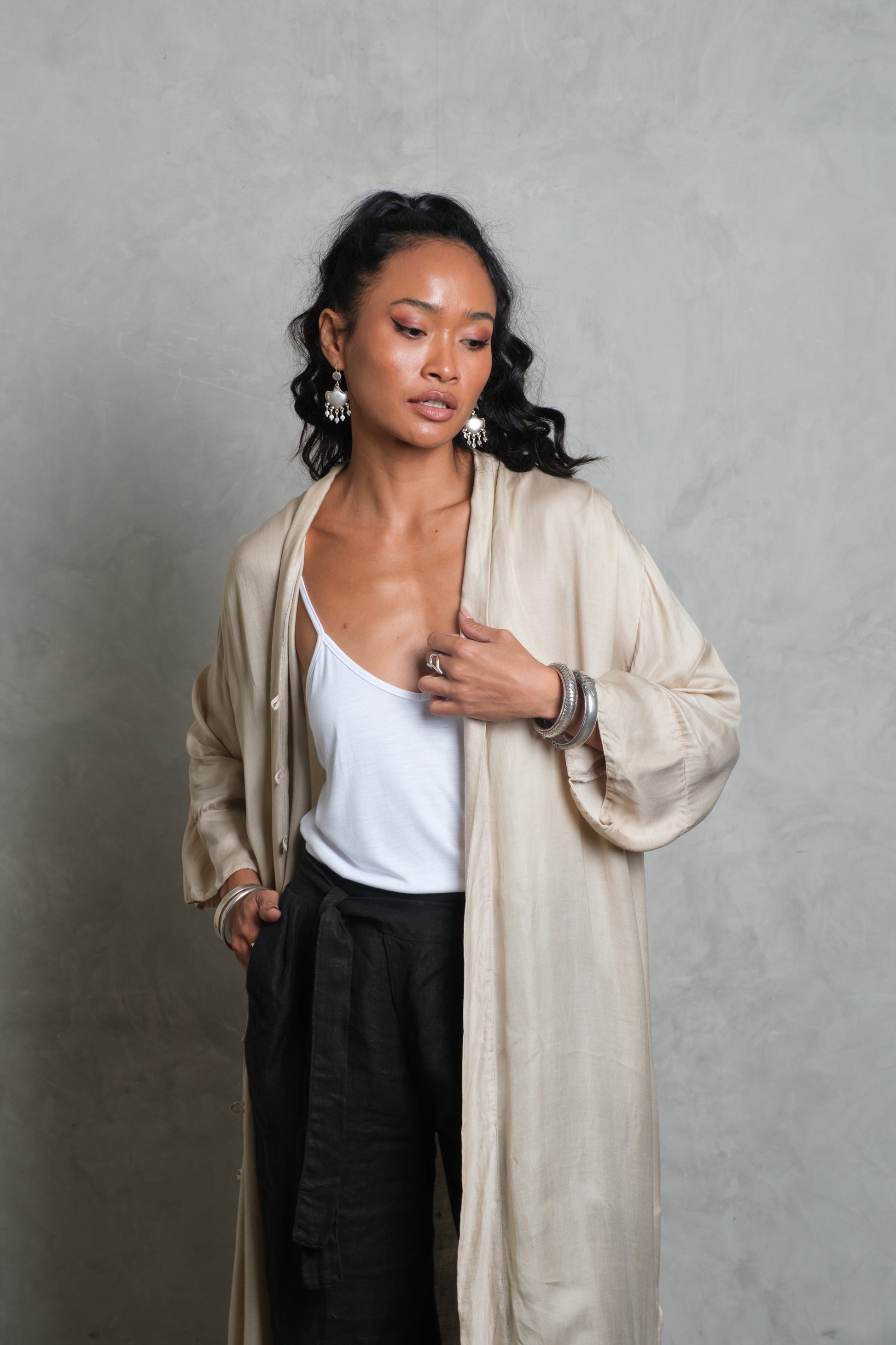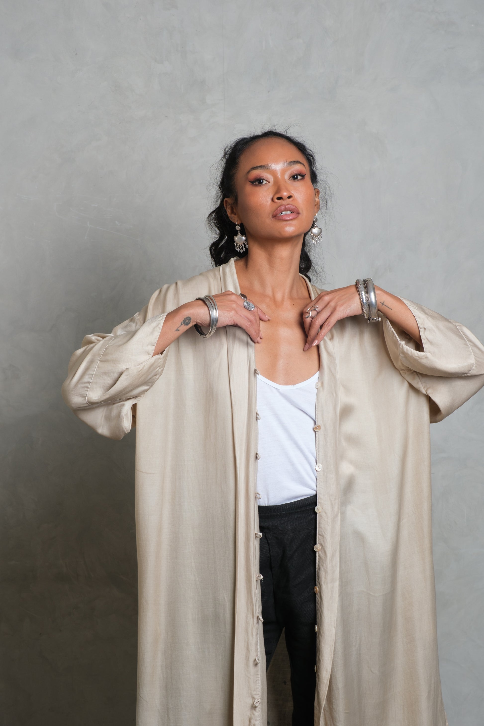 The DEWI Kimono is crafted in pure silk, embodying refined elegance with a resort sensibility. Naturally hand-dyed in ombré shades of Smoke, Snow White, and Moonstone, it flows with understated sophistication. Each kimono is elevated by a hand-painted mural on the back, transforming it into a wearable piece of art. Finished with a silk belt to shape the silhouette, the DEWI reflects the Muda js. philosophy — effortless class, natural simplicity, and timeless style.