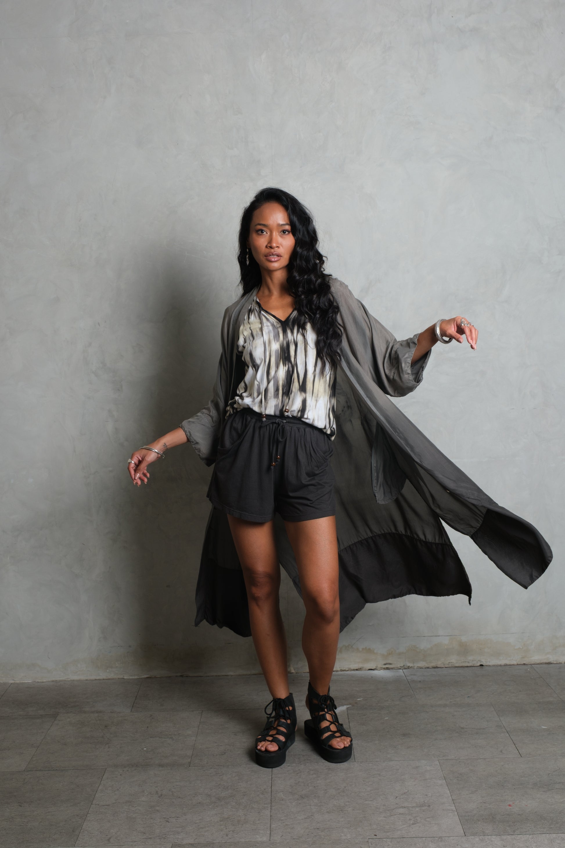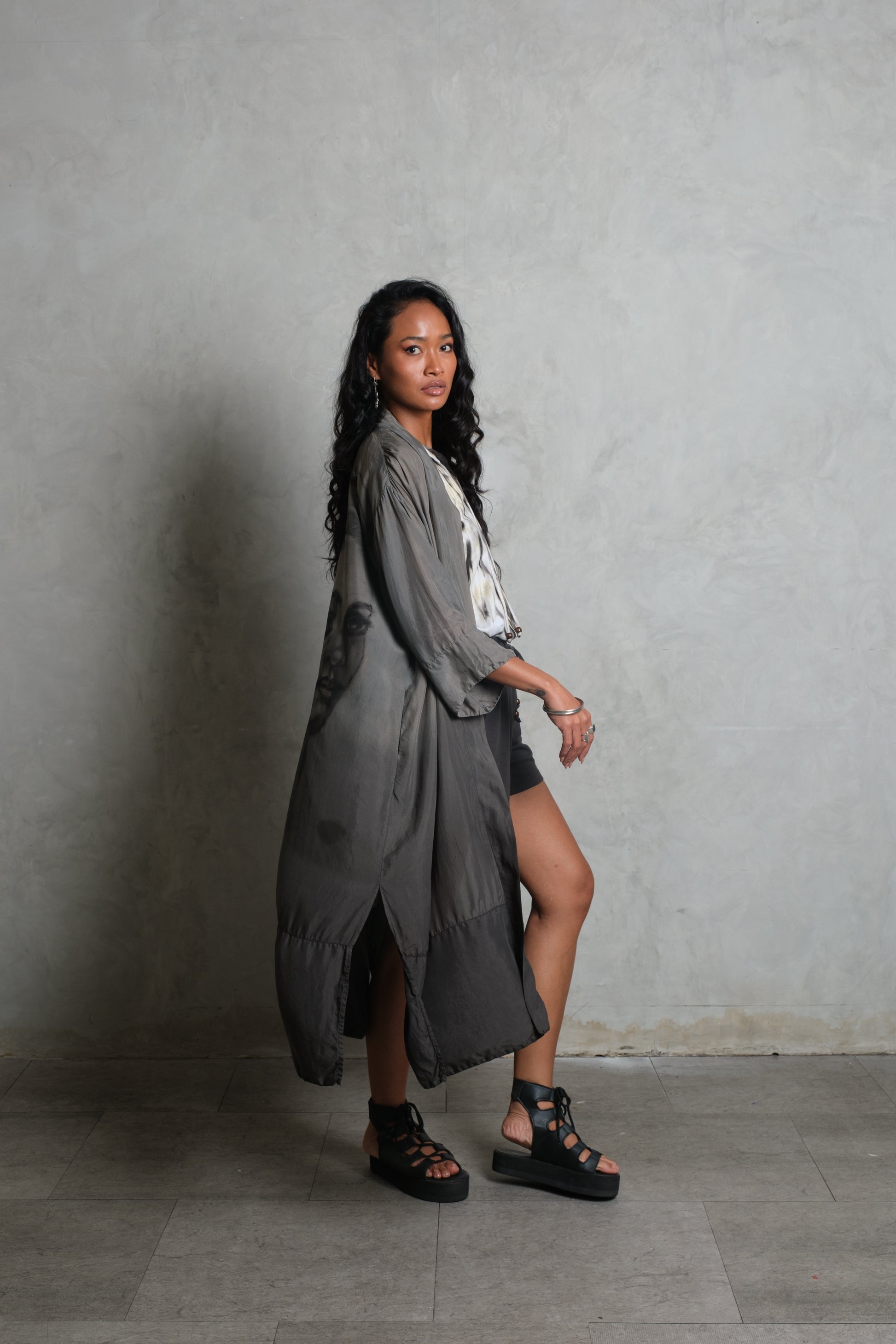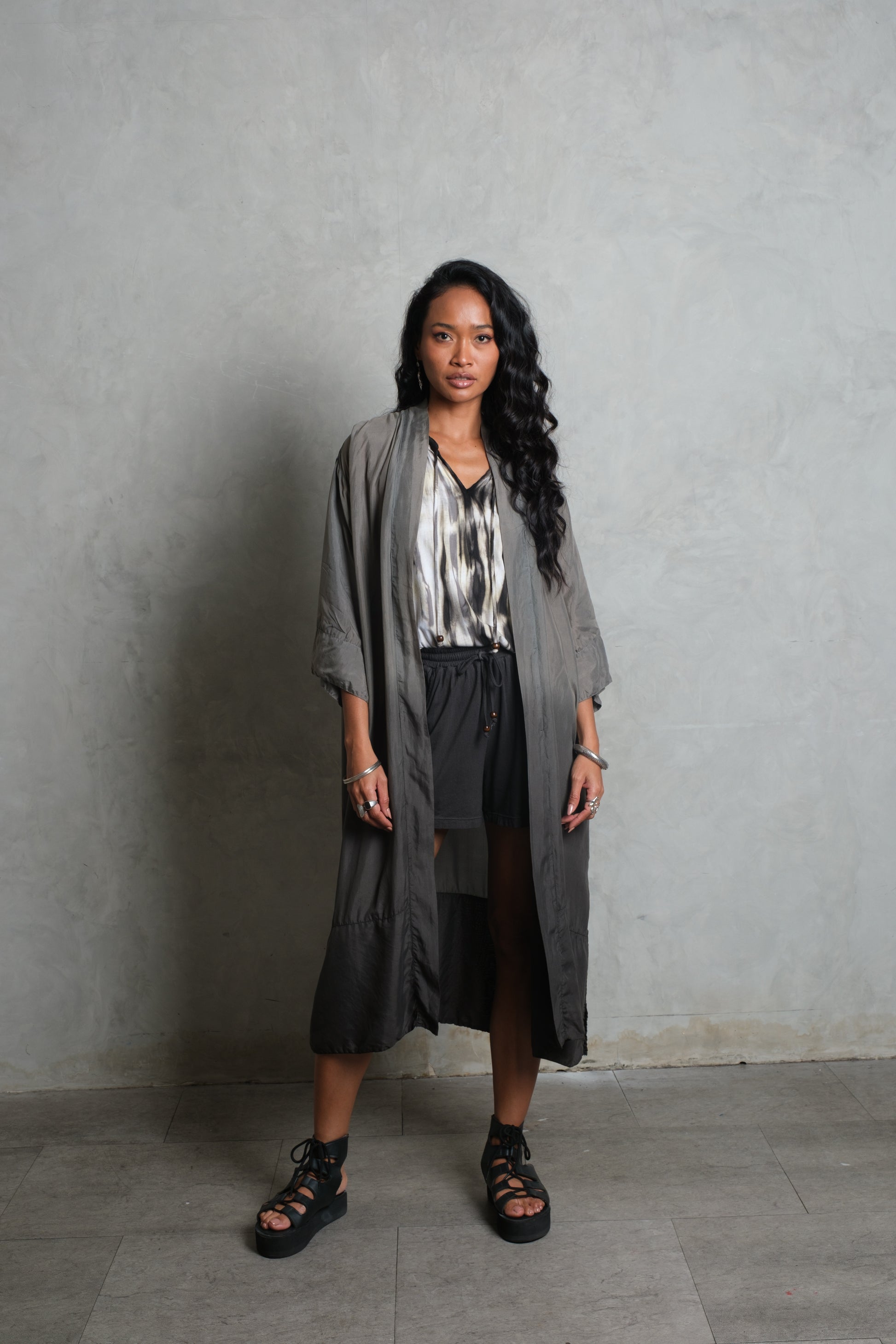 The DEWI Kimono is crafted in pure silk, embodying refined elegance with a resort sensibility. Naturally hand-dyed in ombré shades of Smoke, Snow White, and Moonstone, it flows with understated sophistication. Each kimono is elevated by a hand-painted mural on the back, transforming it into a wearable piece of art. Finished with a silk belt to shape the silhouette, the DEWI reflects the Muda js. philosophy — effortless class, natural simplicity, and timeless style.
