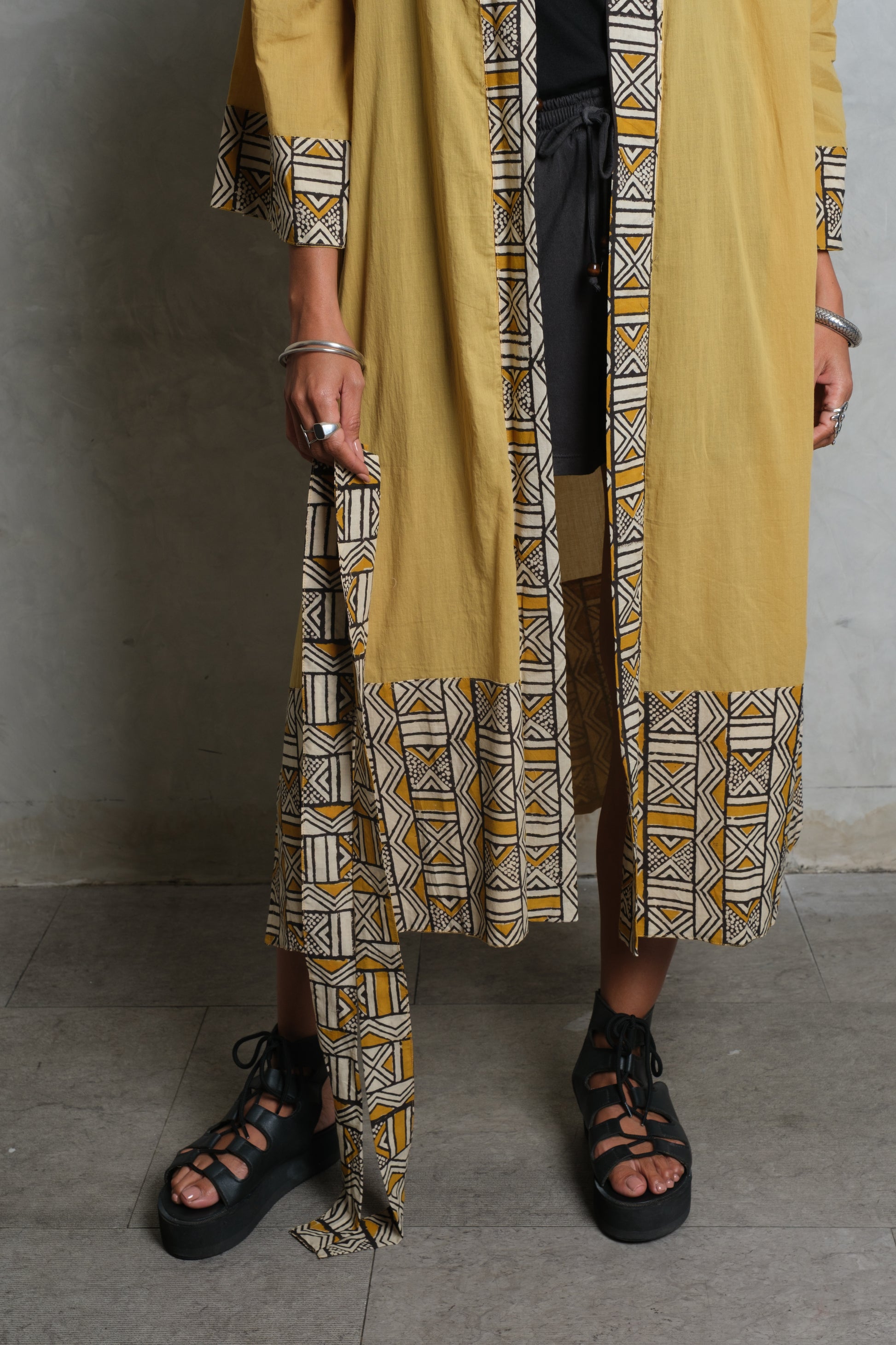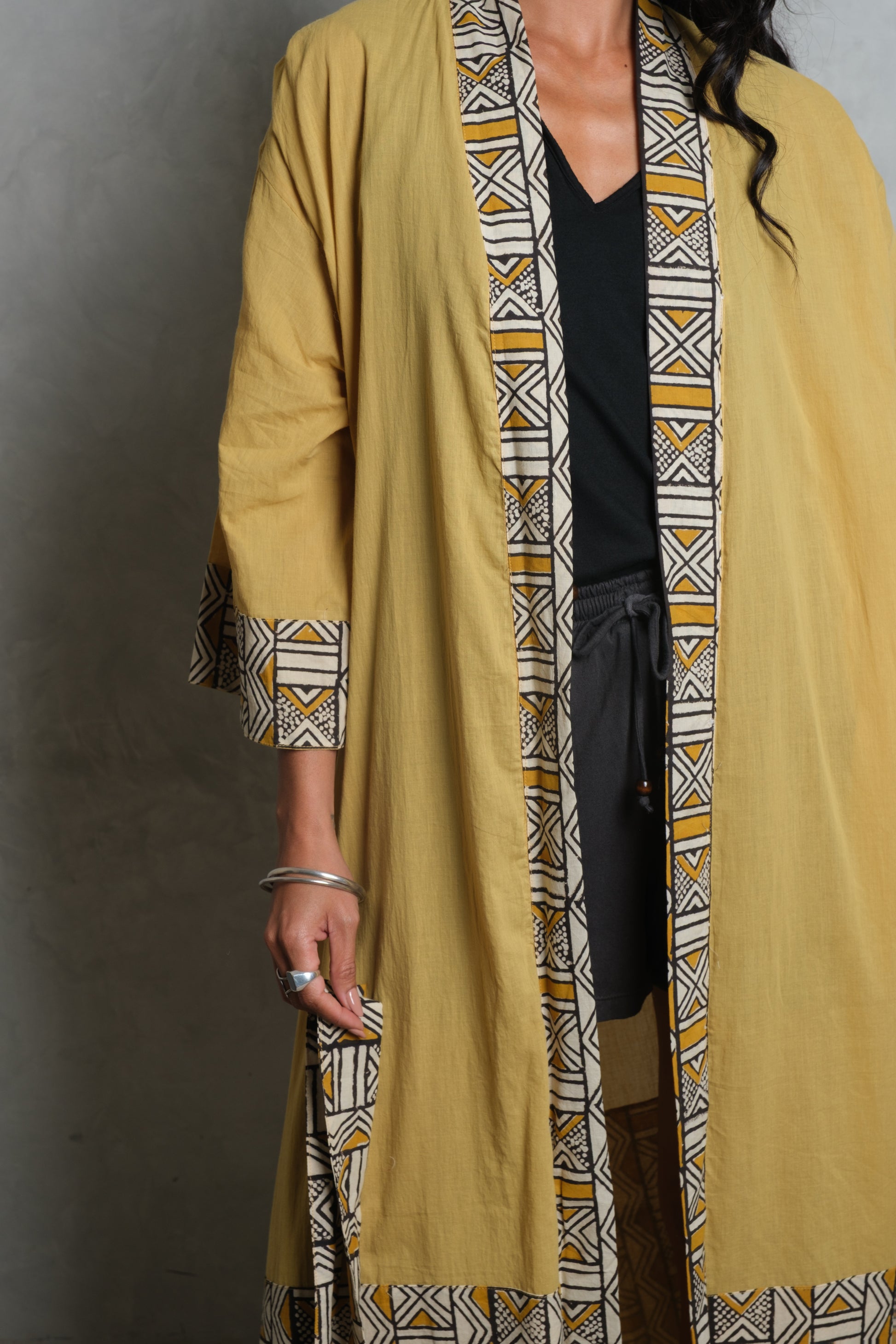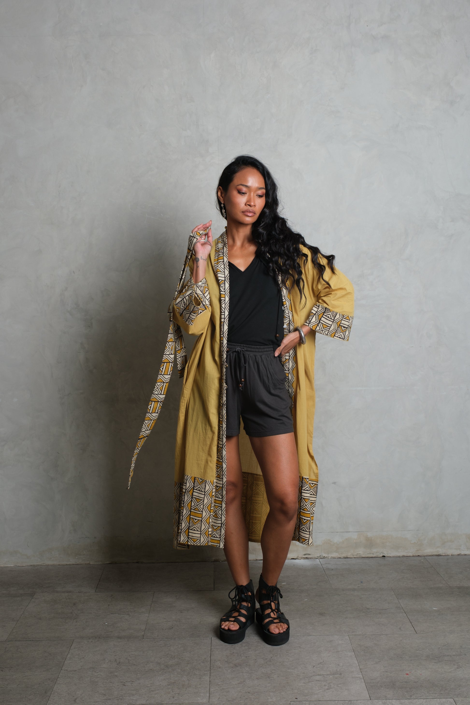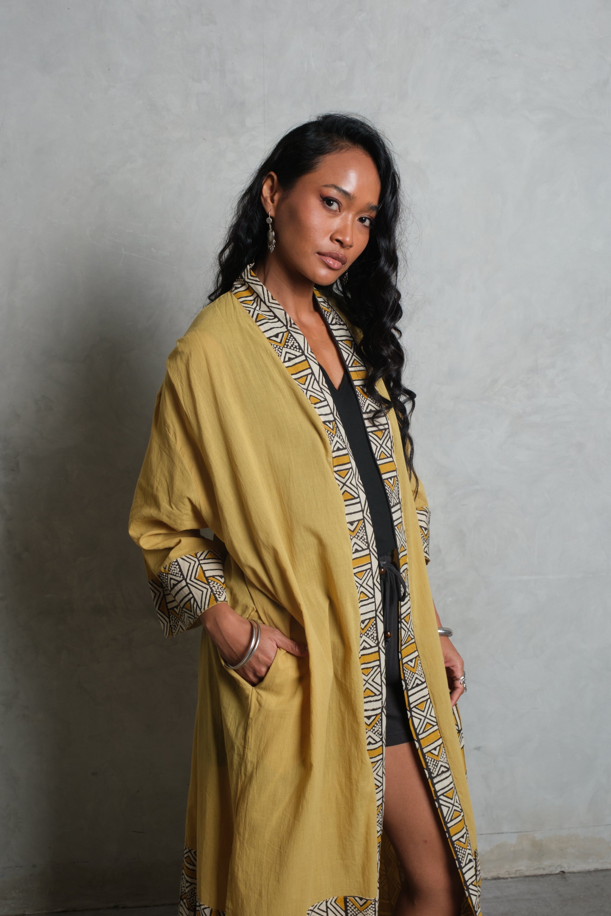 The DHARMA Kimono begins with organic cotton sourced from northern India, chosen for its natural softness and breathability. The base fabric is naturally dyed in Bali by artisans, using pigments derived from plants to achieve rich, earthy tones. Balinese makers then cut and sew the garment, finishing it with hand block-printed cotton borders that celebrate centuries of textile tradition. With its sweeping long length, wide sleeves, and flowing drape, the kimono moves with quiet elegance — equally at home layered over resort wear or styled as a statement piece.