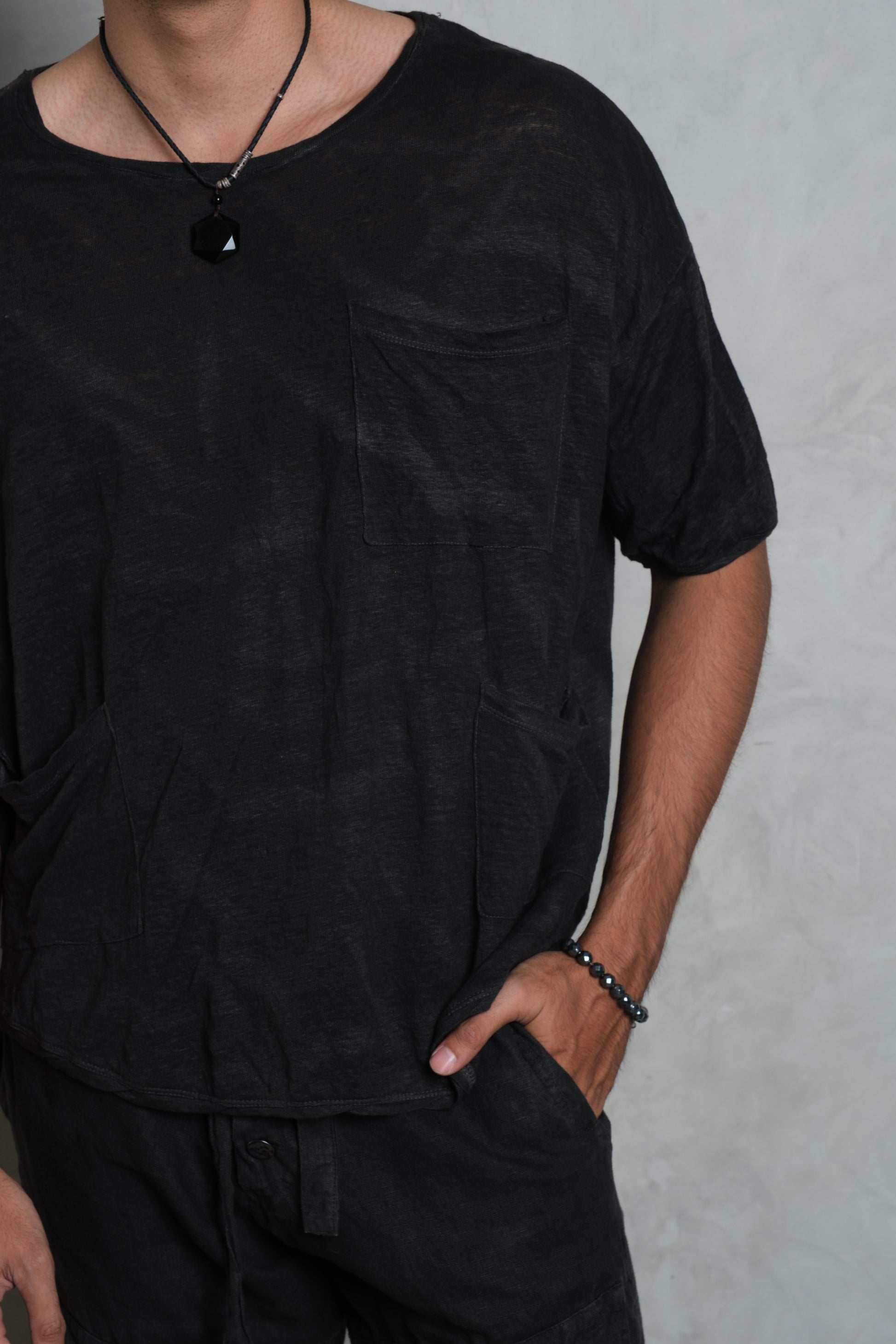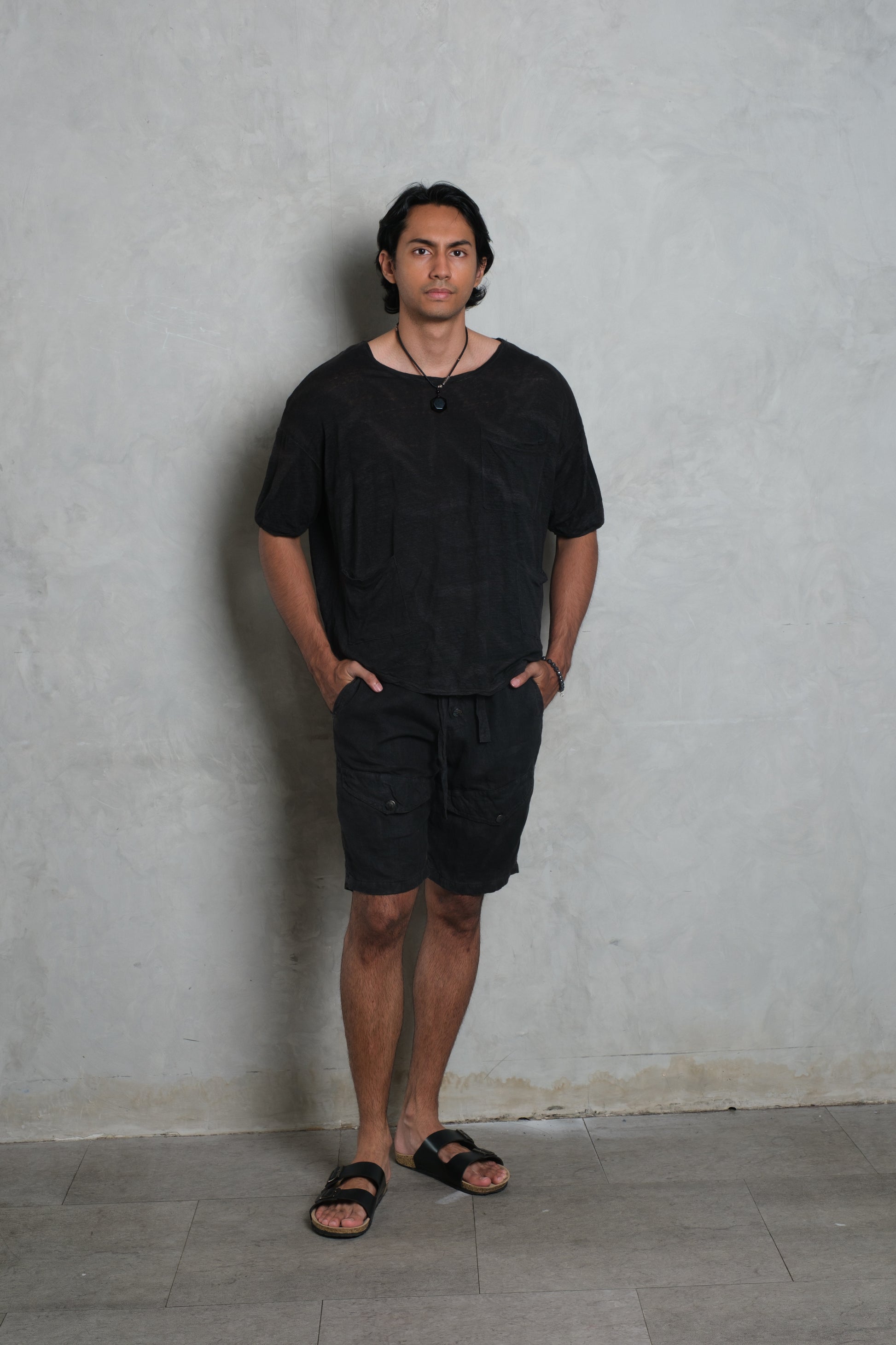 The GOA Tee brings a relaxed military spirit into modern resortwear. Made from lightweight linen jersey, it drapes naturally across the body, offering both breathability and movement. Distinctive hand-twisted finishes at the neckline, sleeve ends, and hem give the tee its rugged, lived-in character, while oversized draped pockets add a utilitarian edge. Available in Apache, Stone, and Olive, the GOA Tee reflects the understated elegance and sprezzatura of Muda js. — effortless, versatile, and cut with a refined masculine feel.