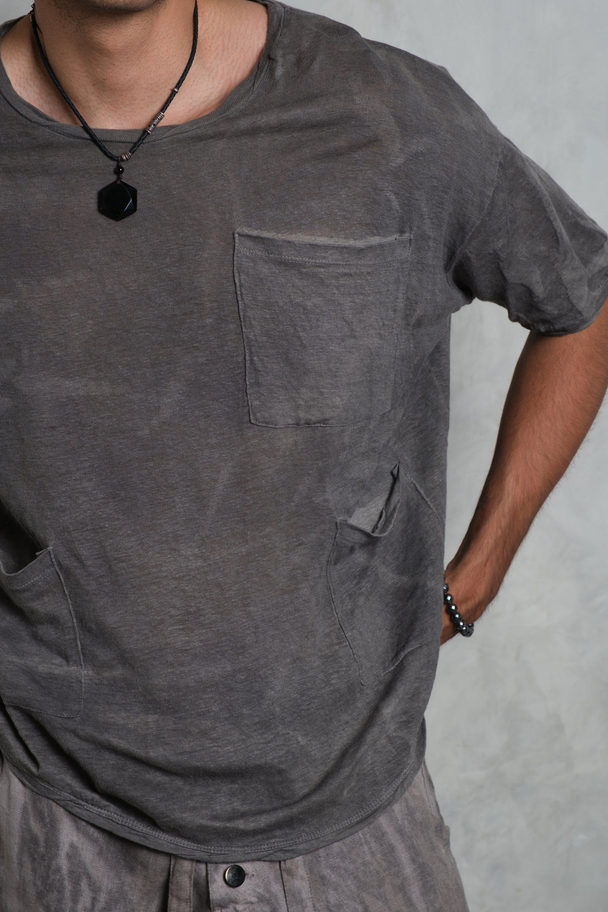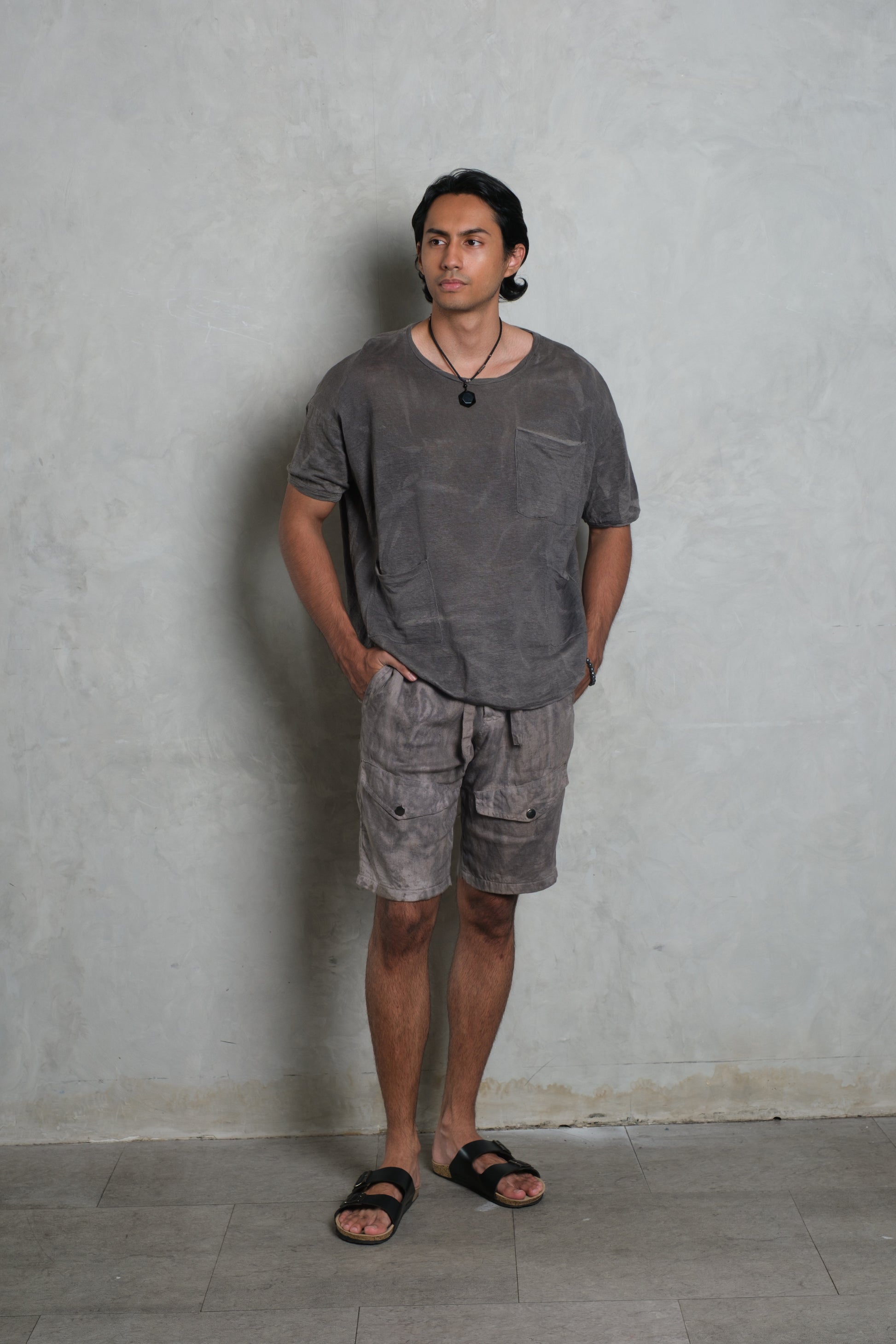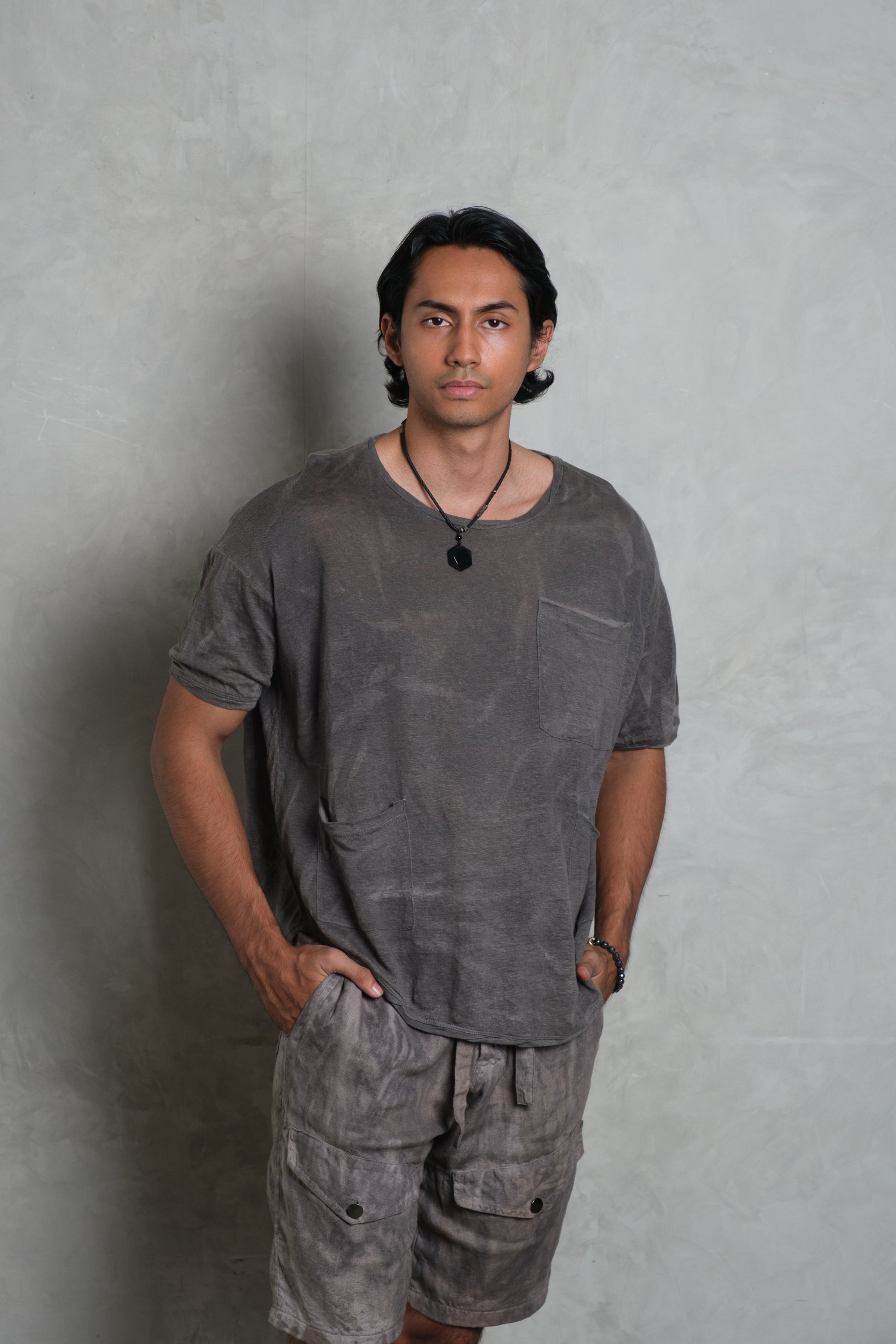 The GOA Tee brings a relaxed military spirit into modern resortwear. Made from lightweight linen jersey, it drapes naturally across the body, offering both breathability and movement. Distinctive hand-twisted finishes at the neckline, sleeve ends, and hem give the tee its rugged, lived-in character, while oversized draped pockets add a utilitarian edge. Available in Apache, Stone, and Olive, the GOA Tee reflects the understated elegance and sprezzatura of Muda js. — effortless, versatile, and cut with a refined masculine feel.