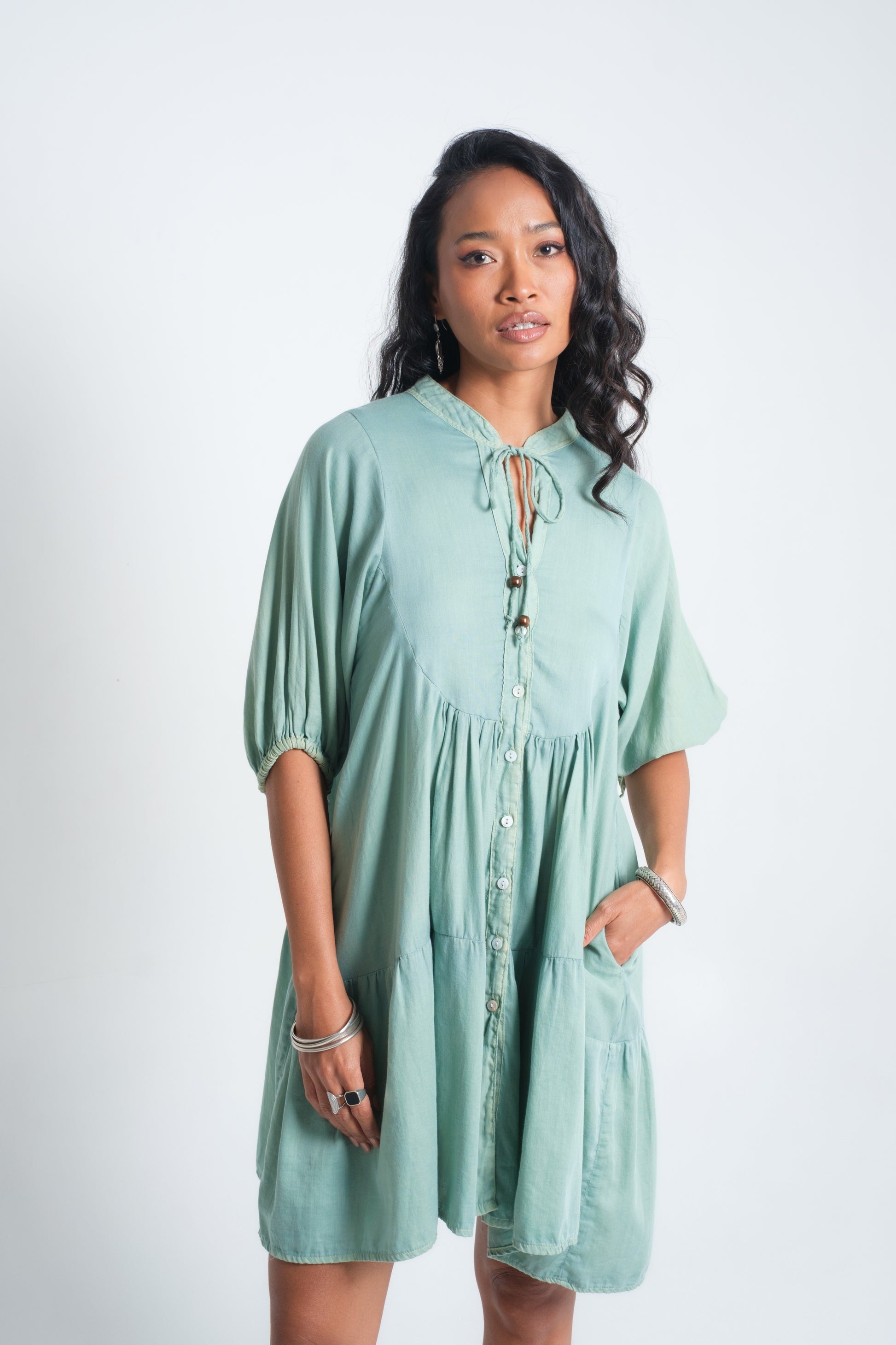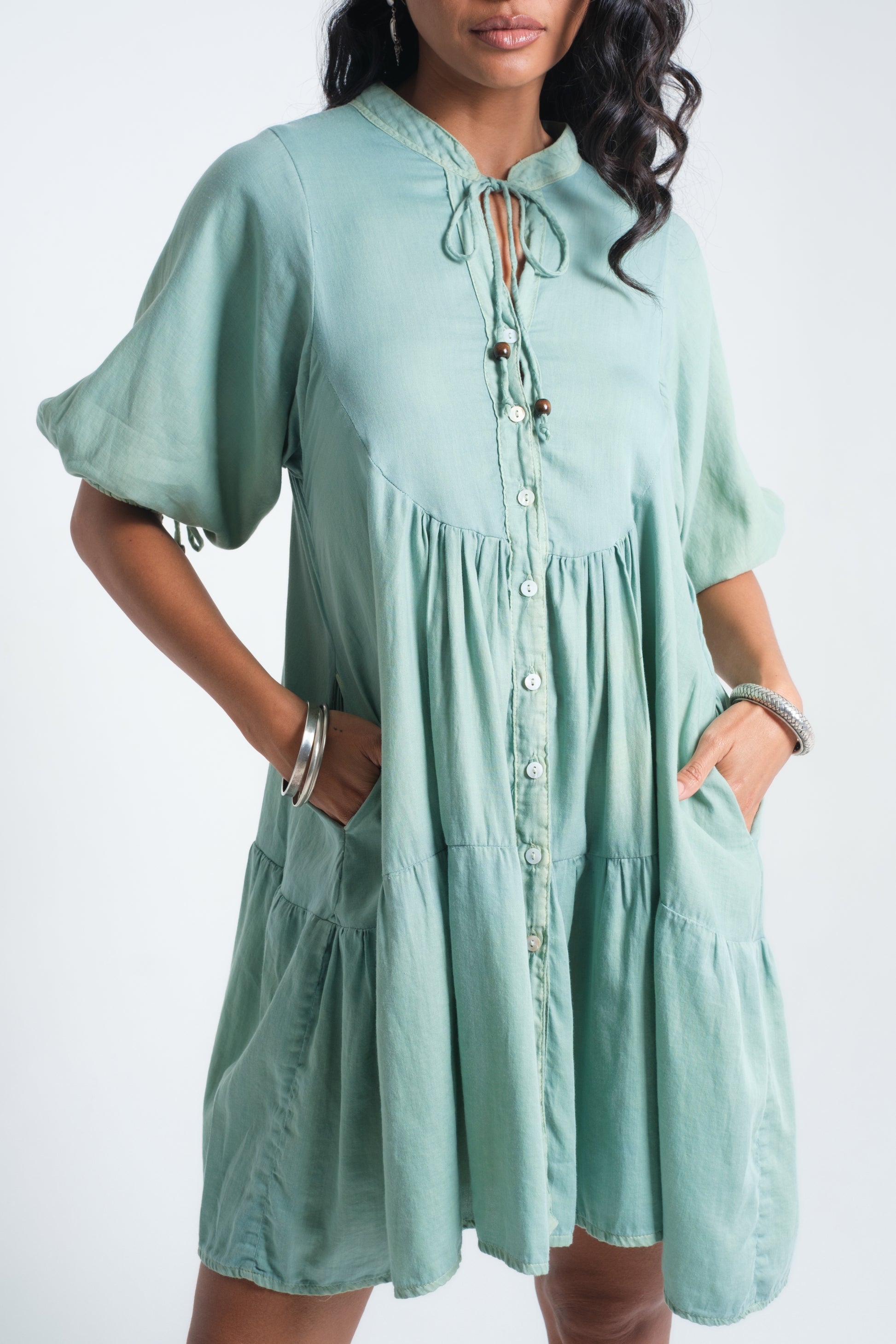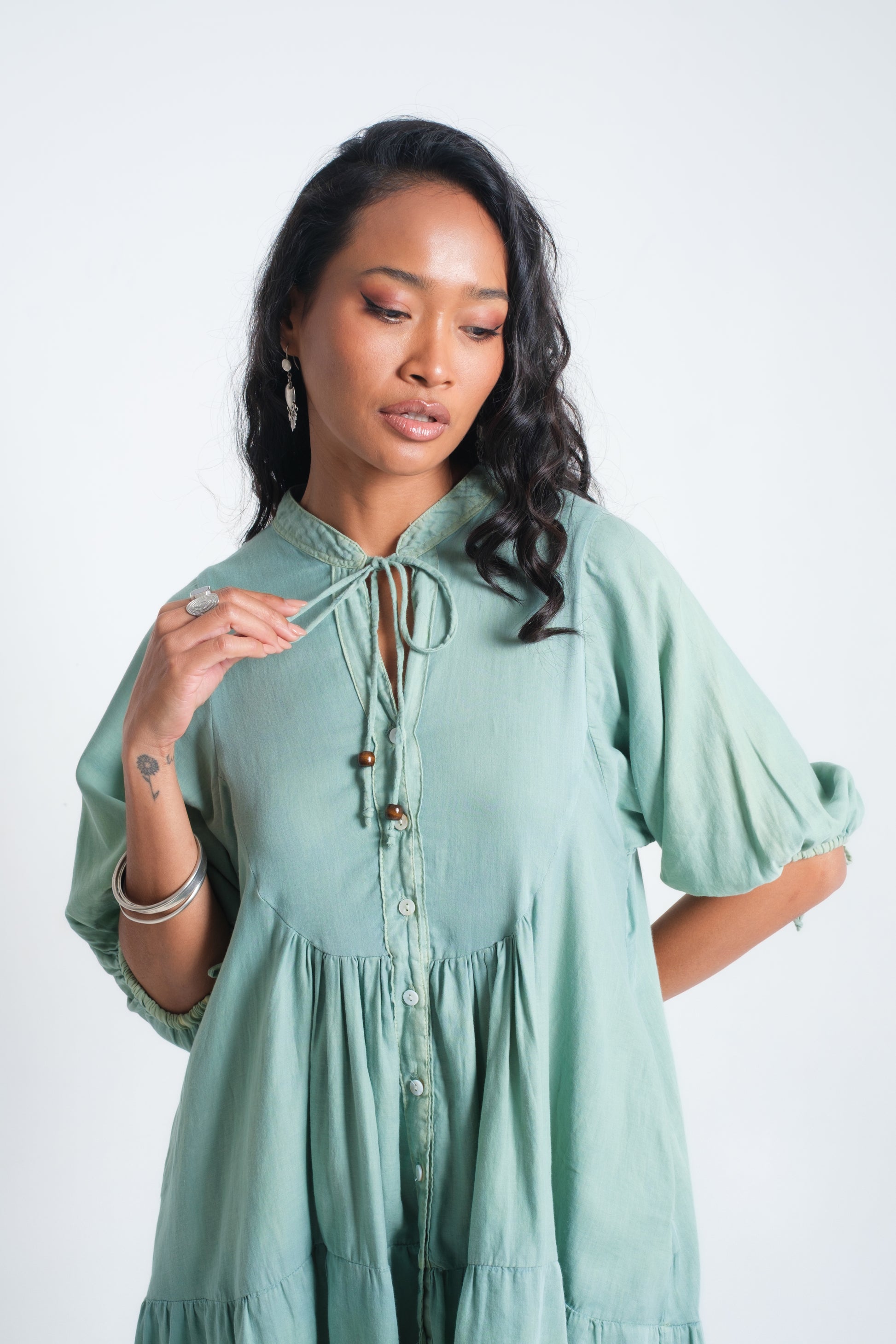 The INDALI Midi Dress is crafted for lightness and ease, with a relaxed tiered silhouette that falls just above the knee. A soft button-down front and drawstring neckline with bead details add versatility and charm, while three-quarter sleeves taper gently for balance. Made from airy organic cotton, it drapes effortlessly and moves with freedom — perfect for warm days, layered looks, or styled with boots for a touch of edge.