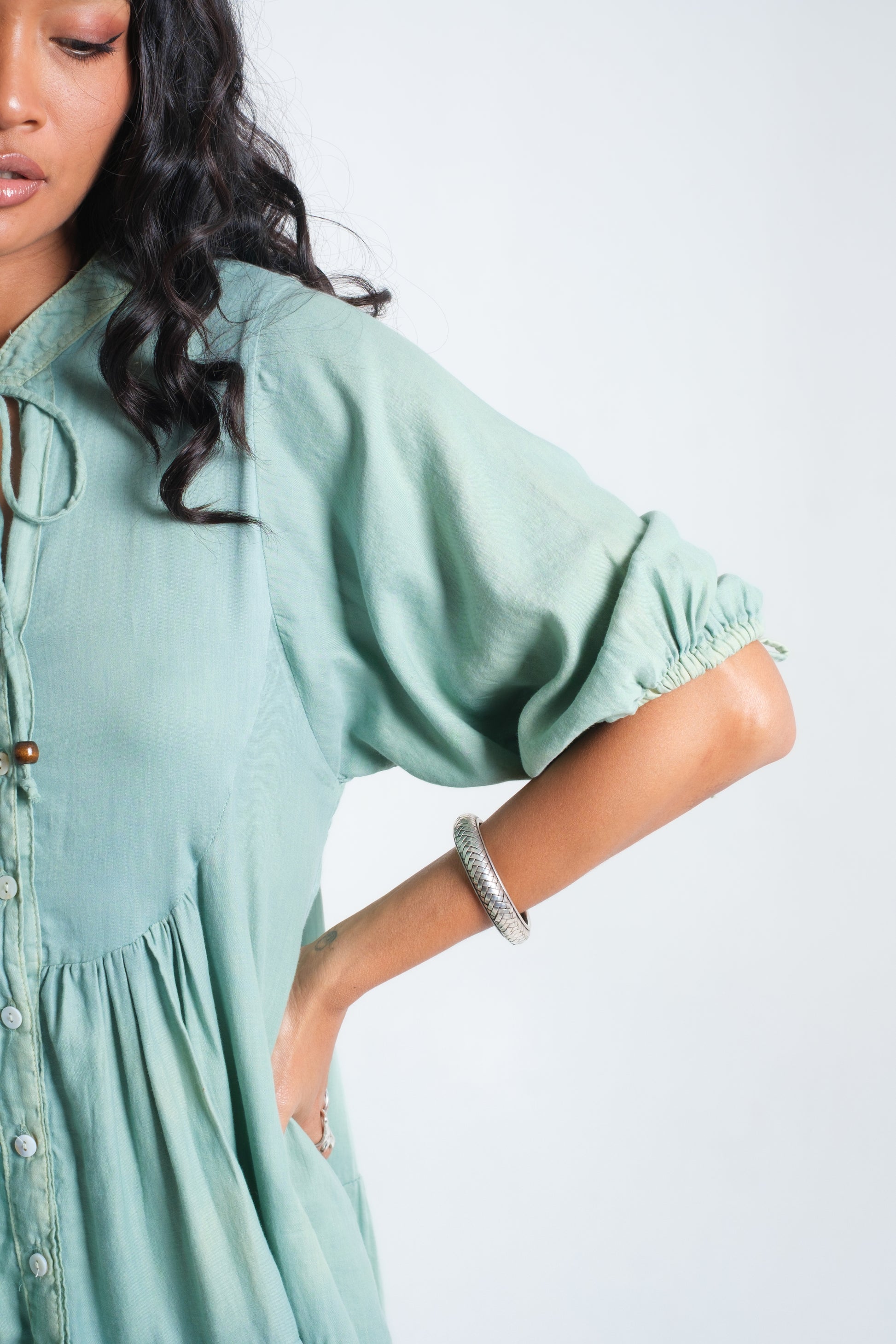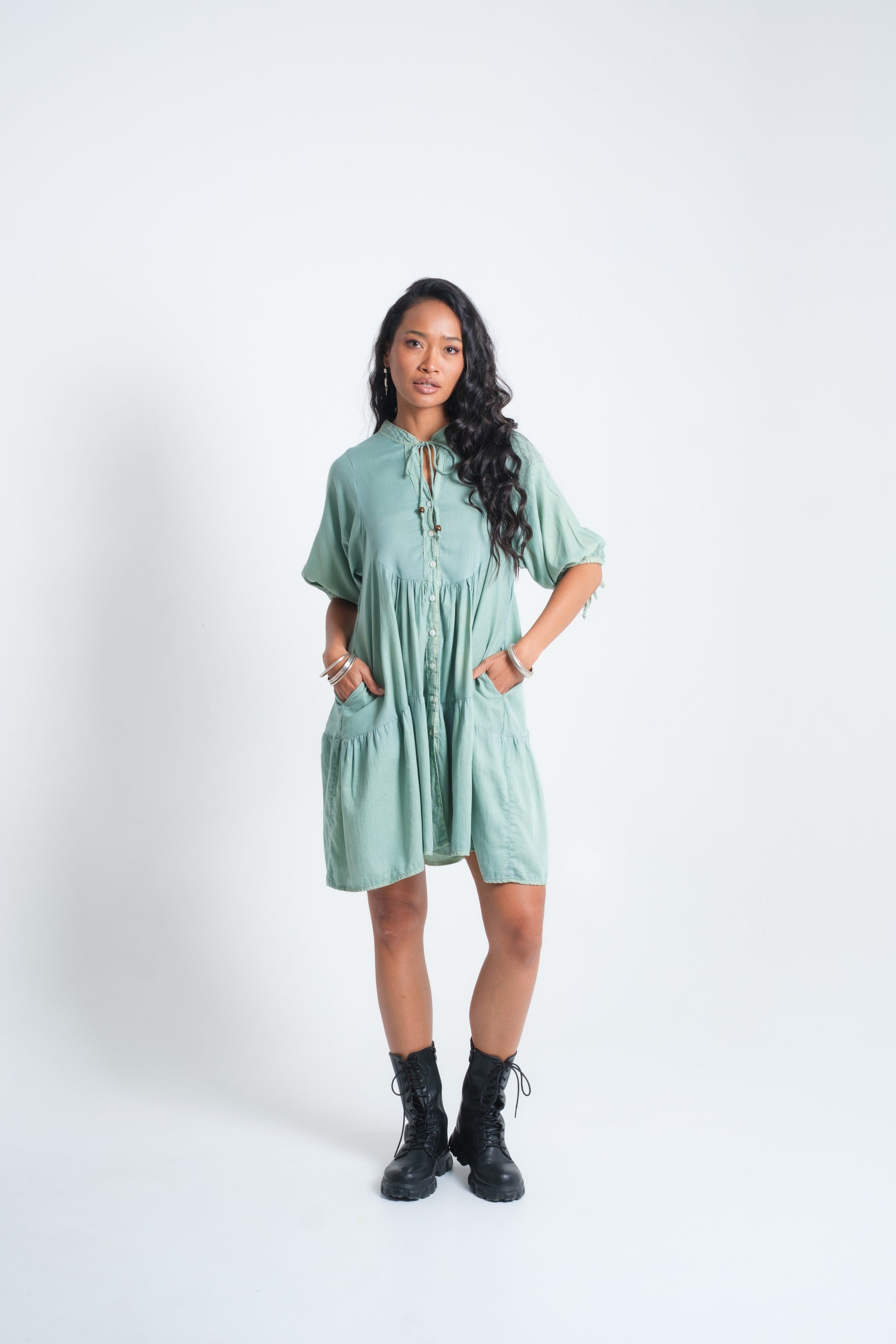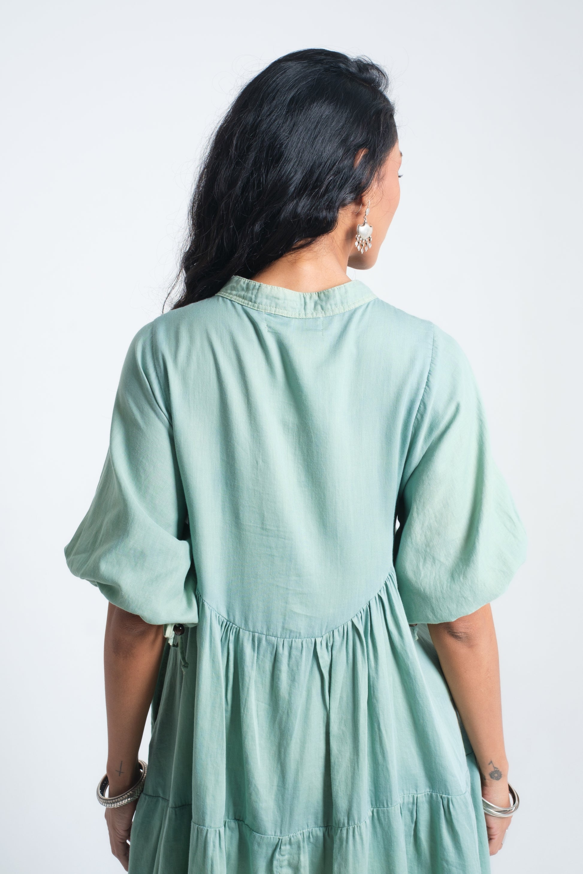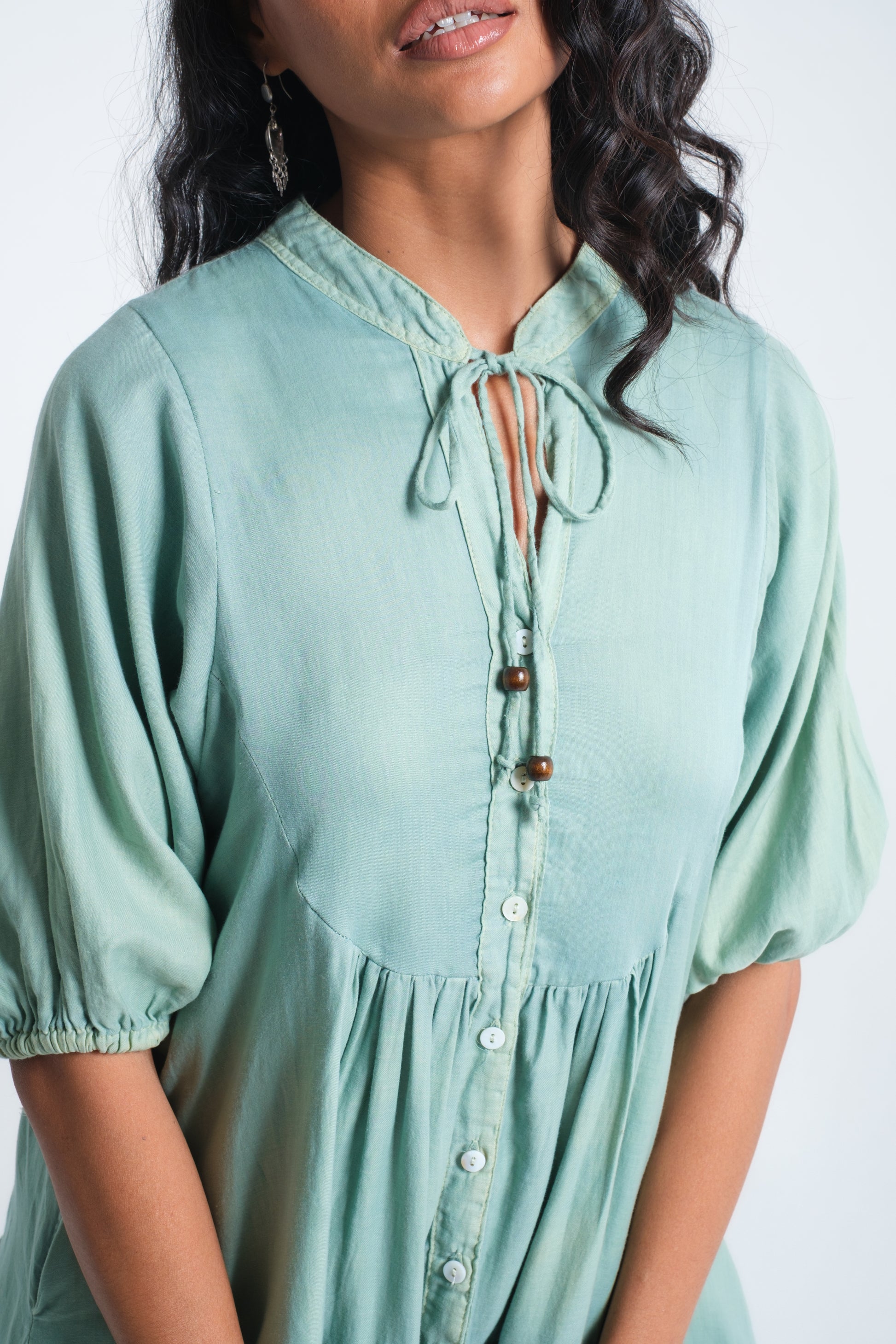 The INDALI Midi Dress is crafted for lightness and ease, with a relaxed tiered silhouette that falls just above the knee. A soft button-down front and drawstring neckline with bead details add versatility and charm, while three-quarter sleeves taper gently for balance. Made from airy organic cotton, it drapes effortlessly and moves with freedom — perfect for warm days, layered looks, or styled with boots for a touch of edge.