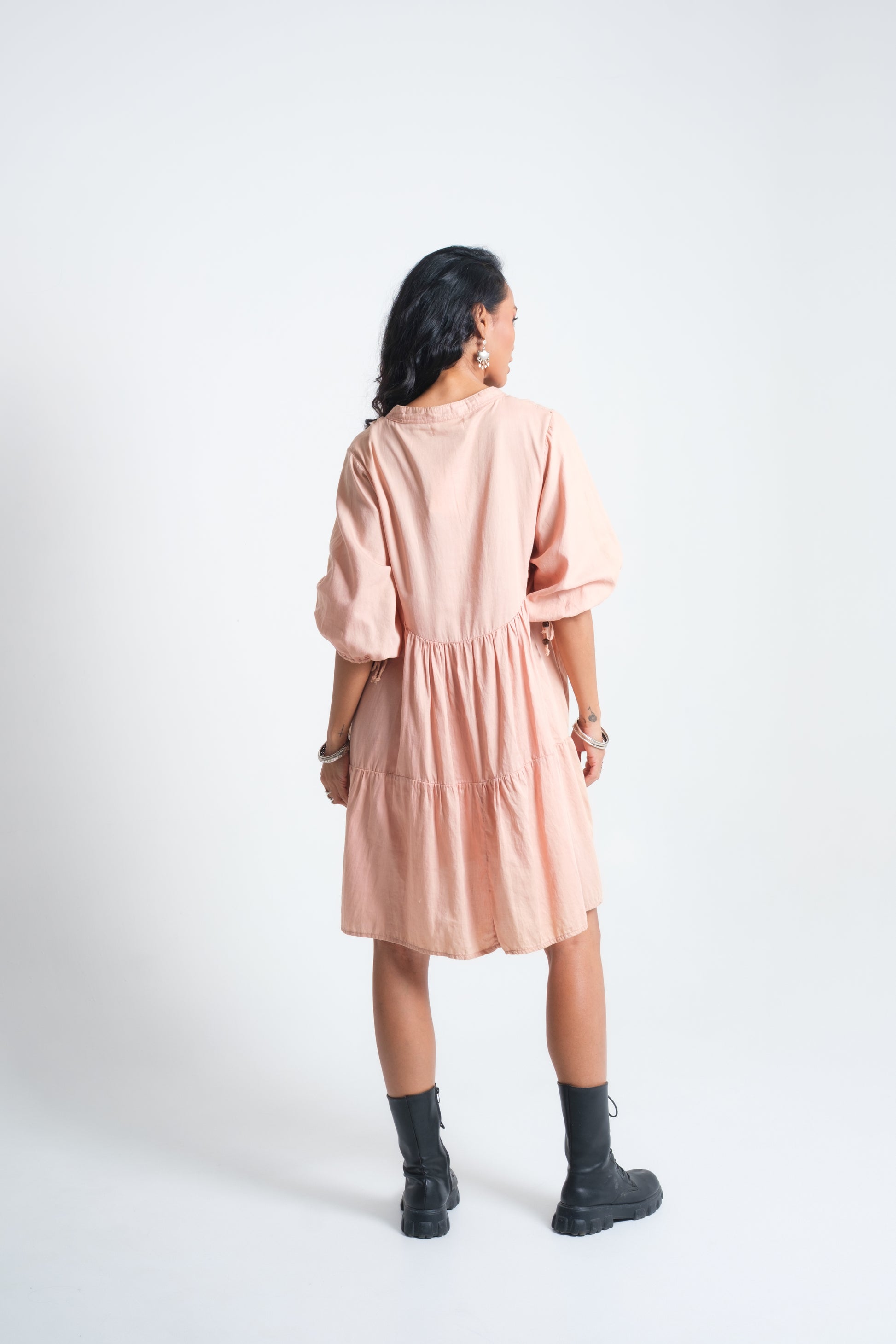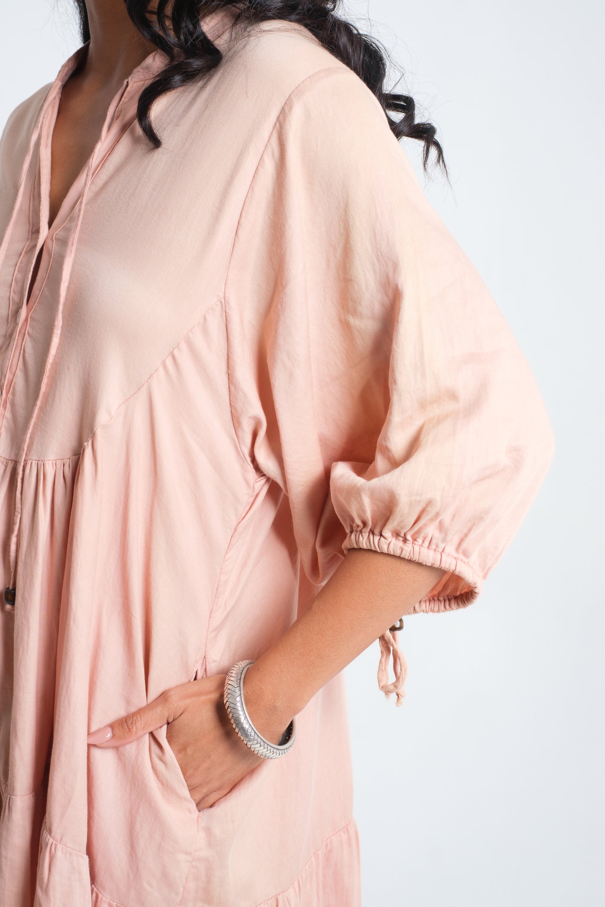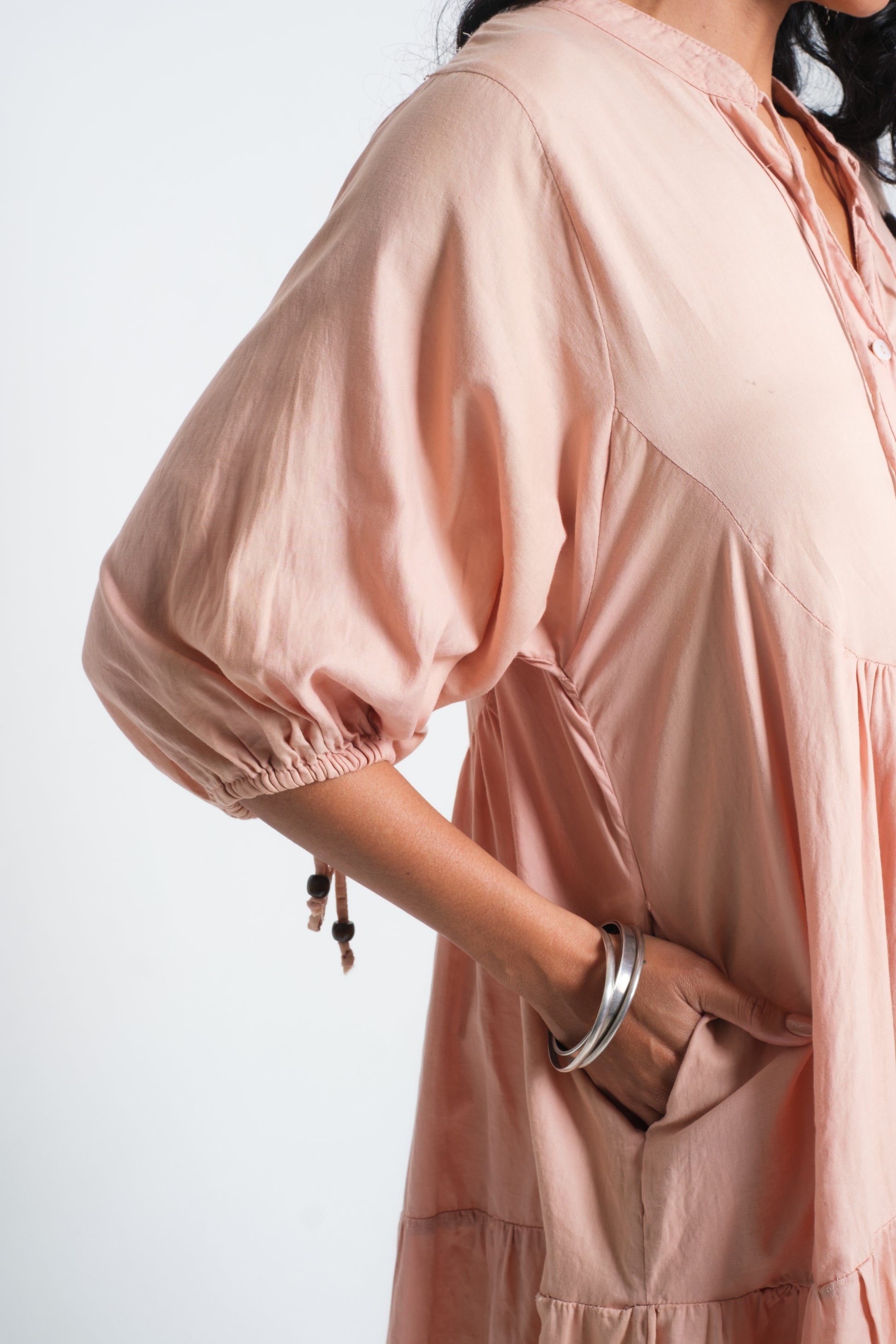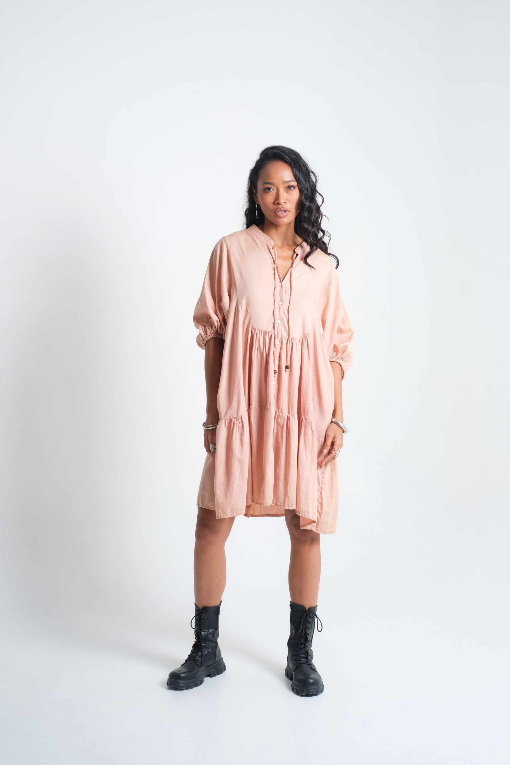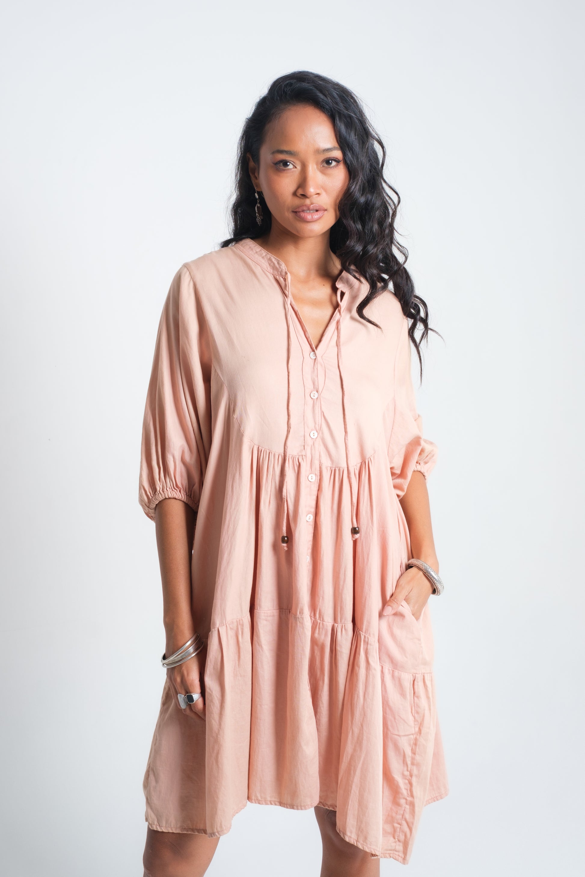 The INDALI Midi Dress is crafted for lightness and ease, with a relaxed tiered silhouette that falls just above the knee. A soft button-down front and drawstring neckline with bead details add versatility and charm, while three-quarter sleeves taper gently for balance. Made from airy organic cotton, it drapes effortlessly and moves with freedom — perfect for warm days, layered looks, or styled with boots for a touch of edge.