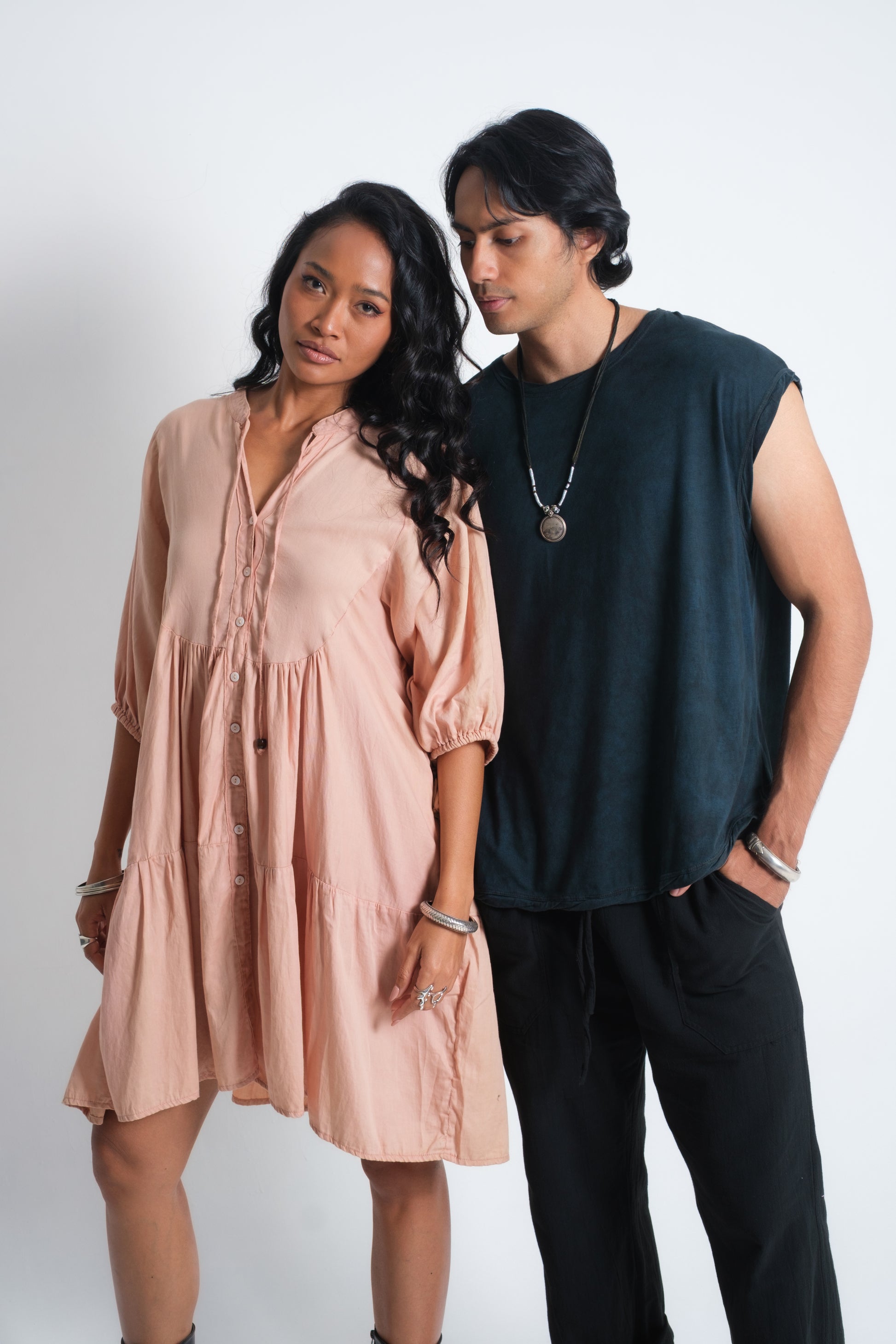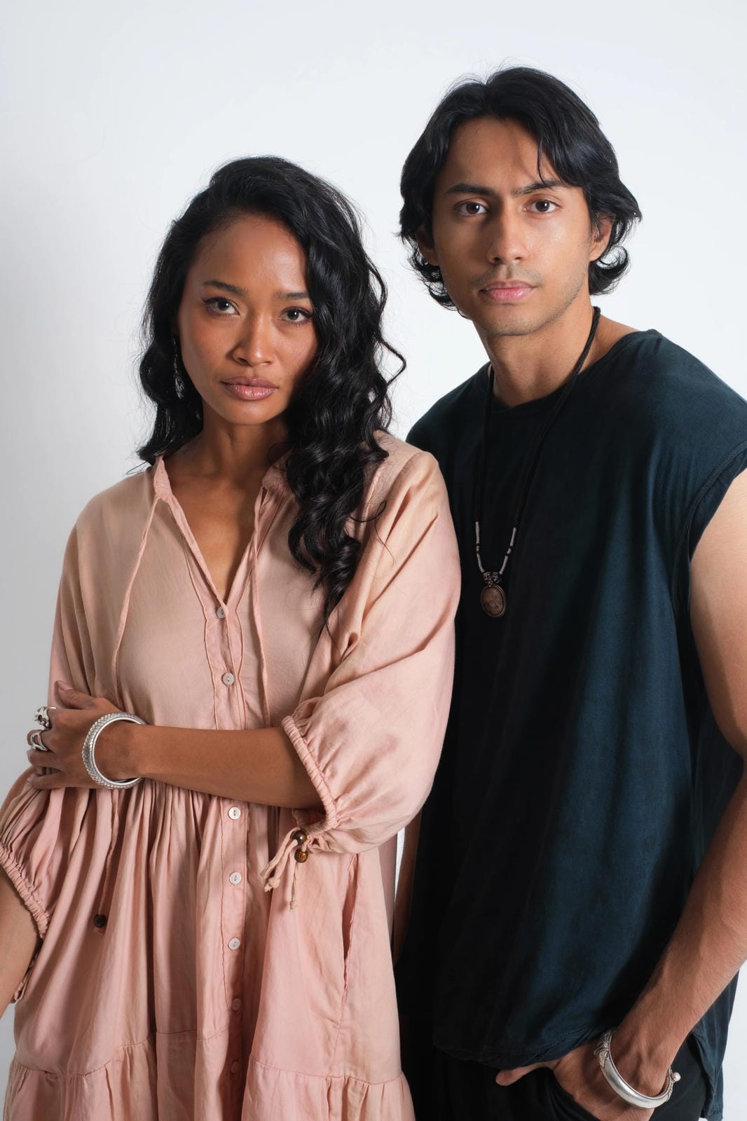 The INDALI Midi Dress is made from organic cotton sourced from northern India, prized for its softness and natural breathability. Each piece is cut and sewn in southern Bali by cottage-industry artisans, whose craftsmanship preserves the authenticity of hand-made clothing. The fabric is then naturally dyed in northern Bali with pigments drawn from plants, creating soft, living tones. Subtle variations ensure that no two dresses are ever the same, making each one a unique expression of artisan craft.