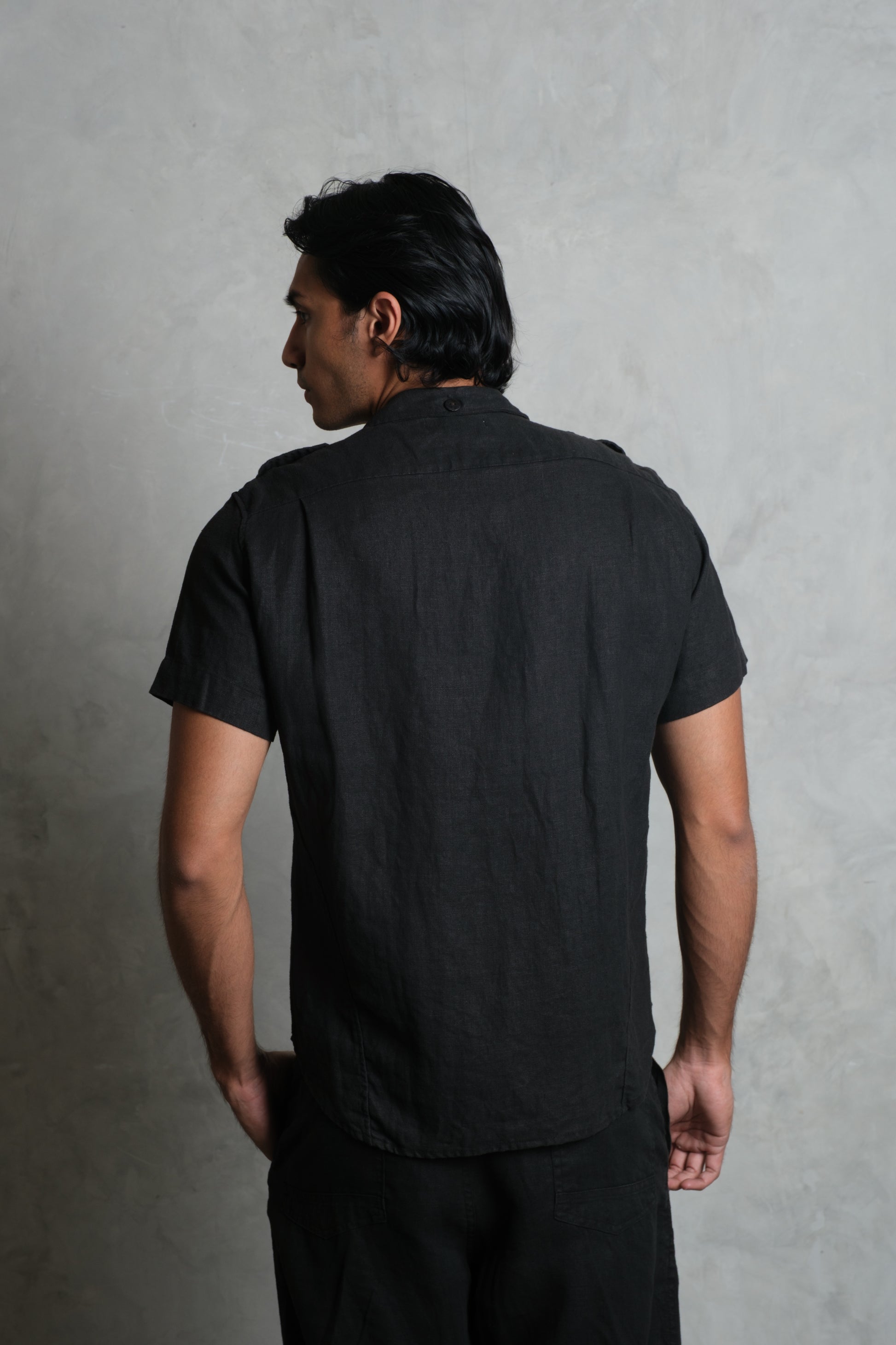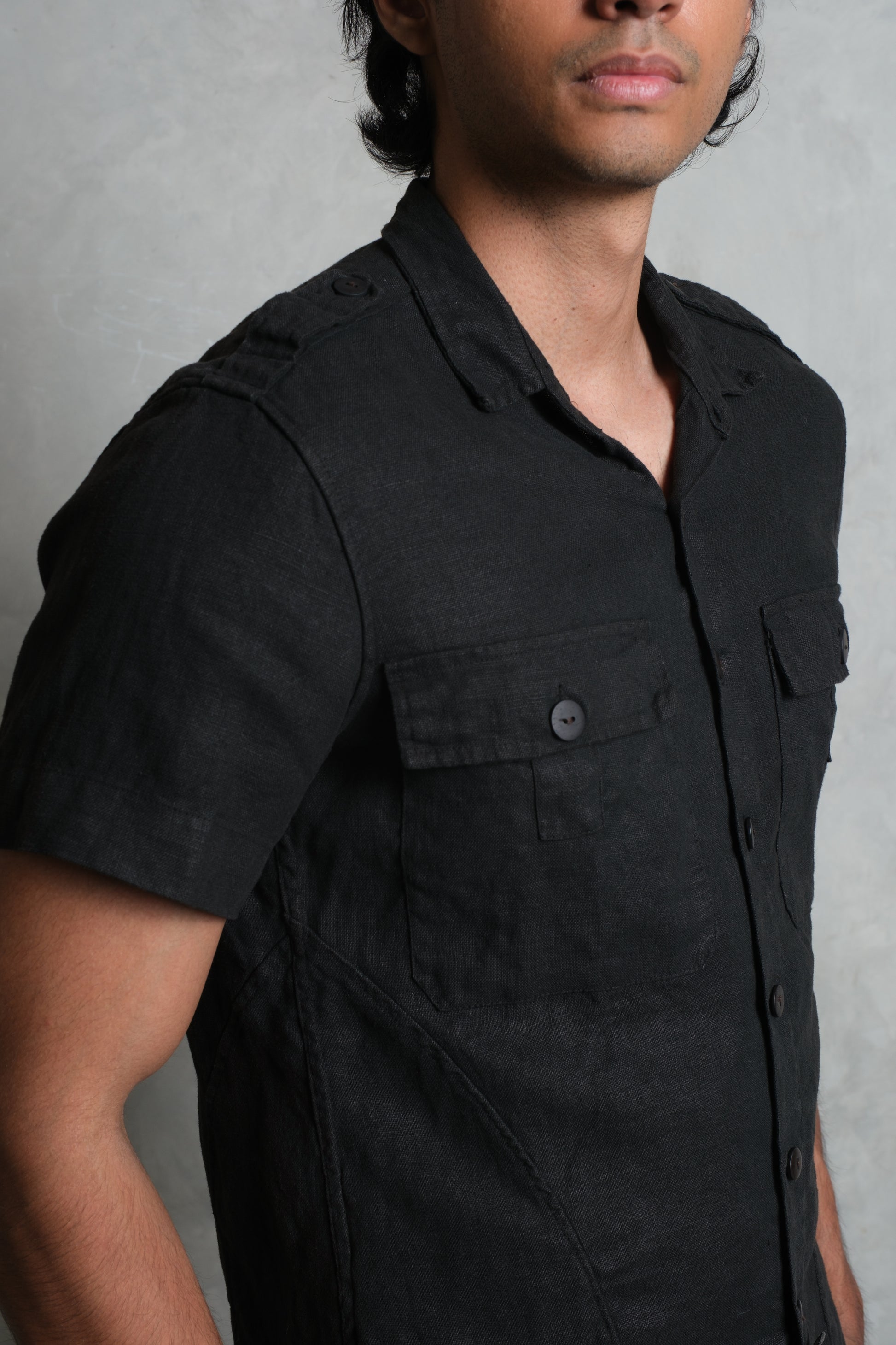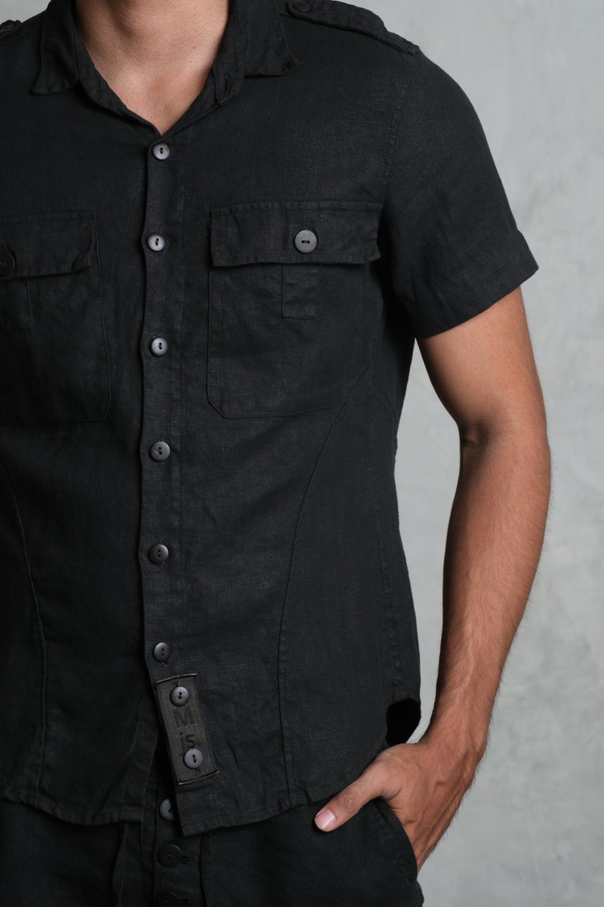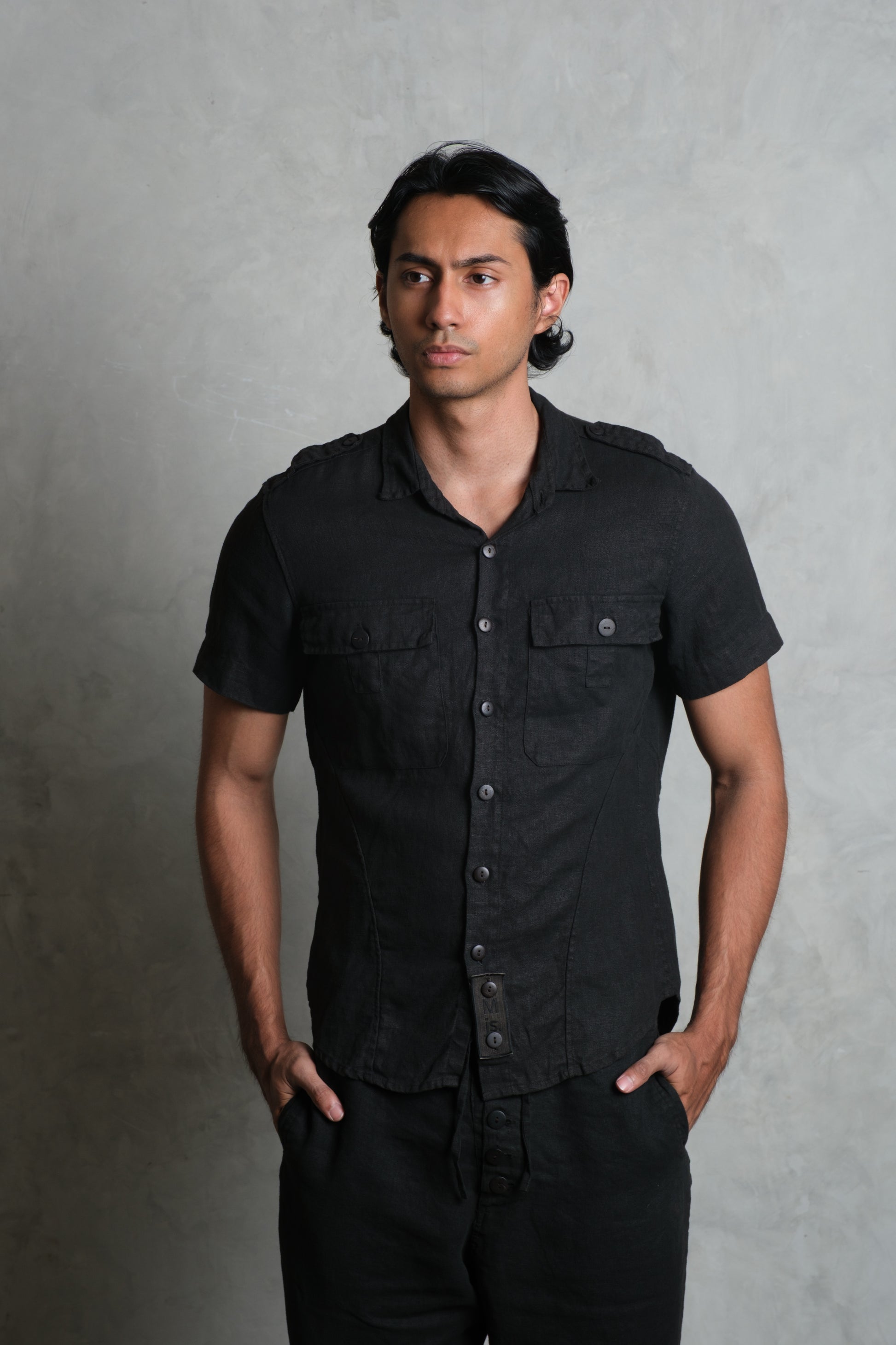 The JAYA Shirt carries the clean, masculine cut that defines the Muda js. MAN aesthetic, with a refined military influence. Crafted in French linen, it features structured chest pockets with flaps, shoulder epaulettes, and a sharp short-sleeve finish that reinforces its utility-inspired style. Detailed coconut shell buttons run through the front, adding a natural contrast to the strength of the design. At the hem, a removable embroidered Muda js. badge completes the look — a subtle mark of identity and detail that elevates the piece. Available in Olive, Apache, and Stone, the JAYA Shirt is a true statement of understated strength and sprezzatura.