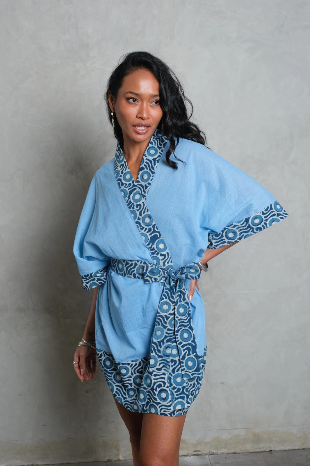 The MAYA Kimono is designed with a relaxed silhouette, wide flowing sleeves, and a wrap-front tie for effortless wear. The base is crafted from soft organic cotton, chosen for its natural comfort and breathability. Borders are detailed with hand block-printed cotton, each pattern pressed using carved wooden blocks and natural dyes — a technique that leaves subtle variations, celebrating the artistry of tradition. The blend of clean lines and artisanal detail makes the kimono versatile, worn as a statement layer or styled with ease for everyday elegance.