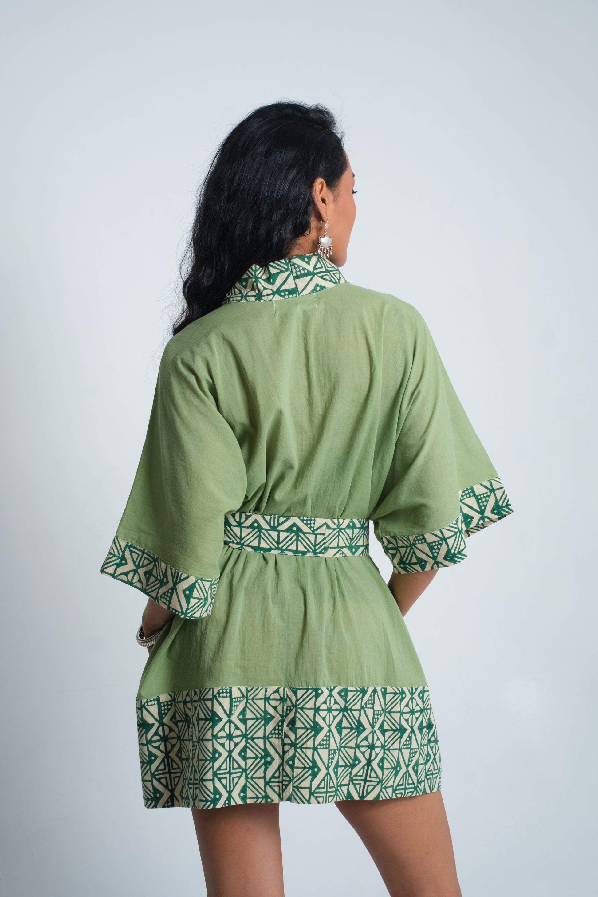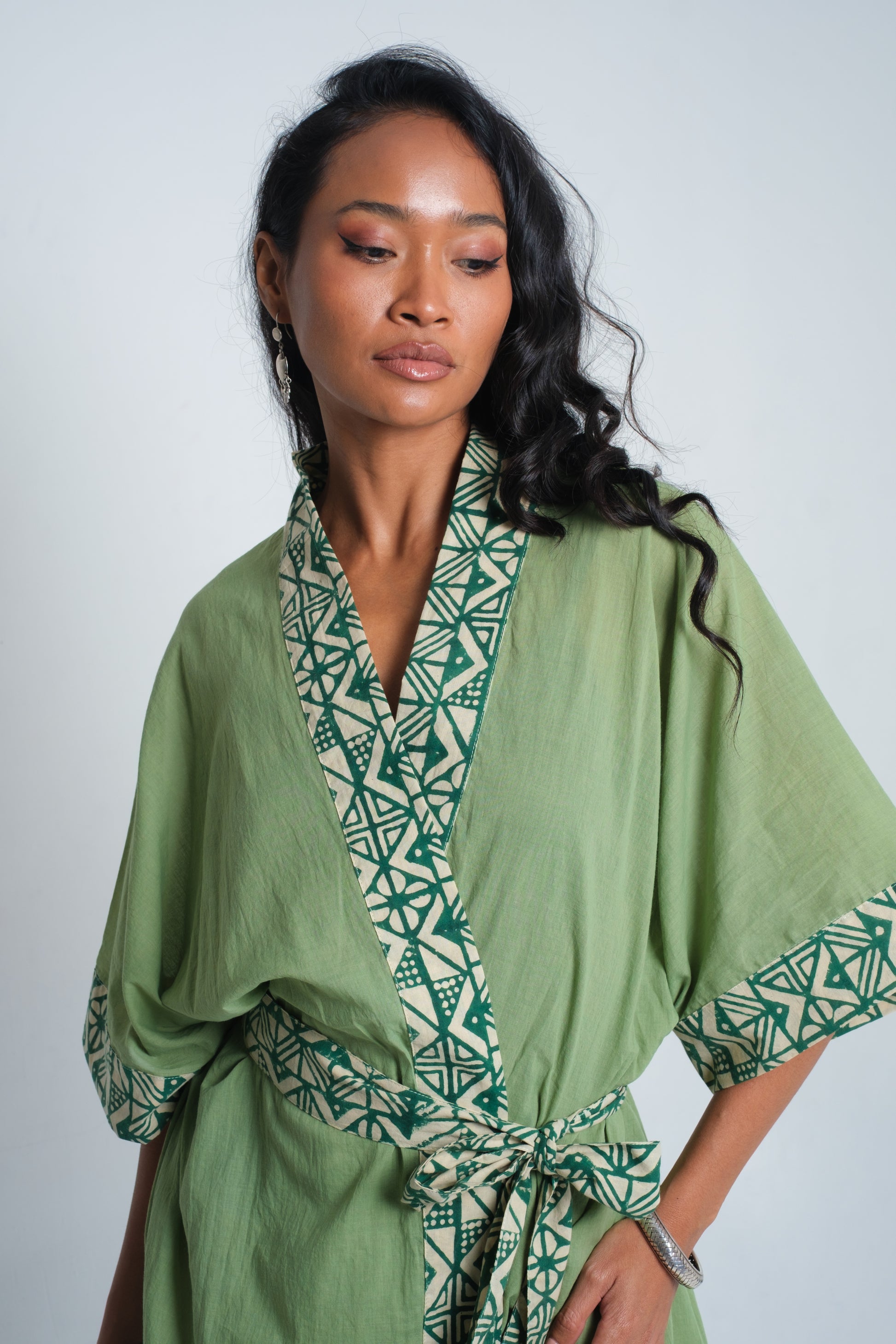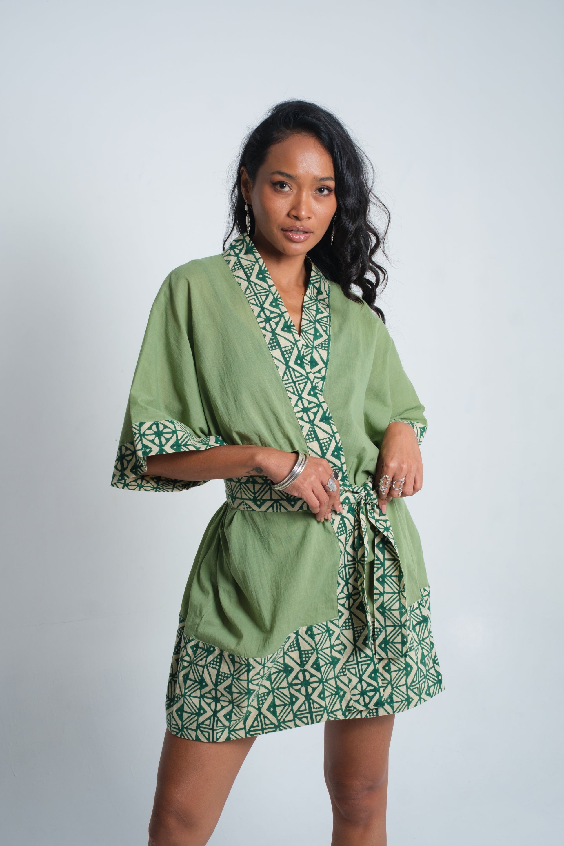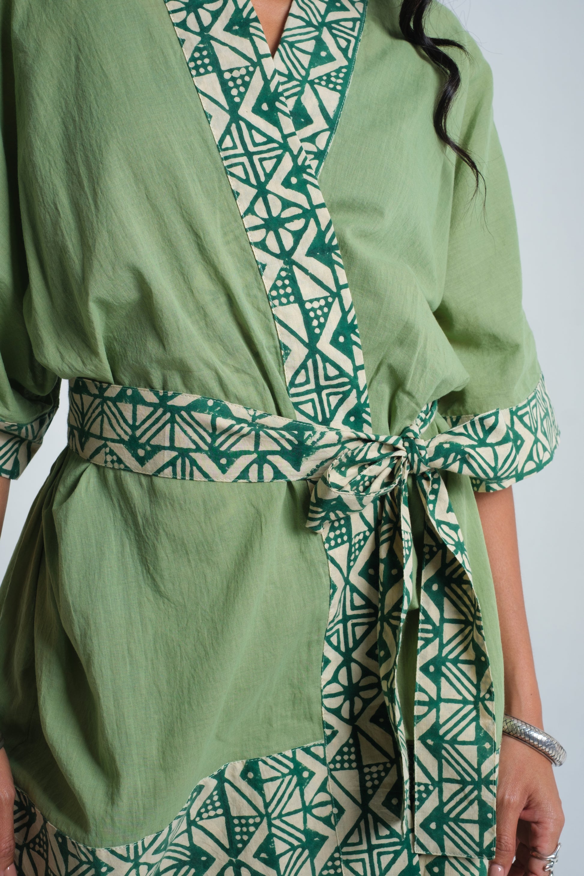 The MAYA Kimono is designed with a relaxed silhouette, wide flowing sleeves, and a wrap-front tie for effortless wear. The base is crafted from soft organic cotton, chosen for its natural comfort and breathability. Borders are detailed with hand block-printed cotton, each pattern pressed using carved wooden blocks and natural dyes — a technique that leaves subtle variations, celebrating the artistry of tradition. The blend of clean lines and artisanal detail makes the kimono versatile, worn as a statement layer or styled with ease for everyday elegance.