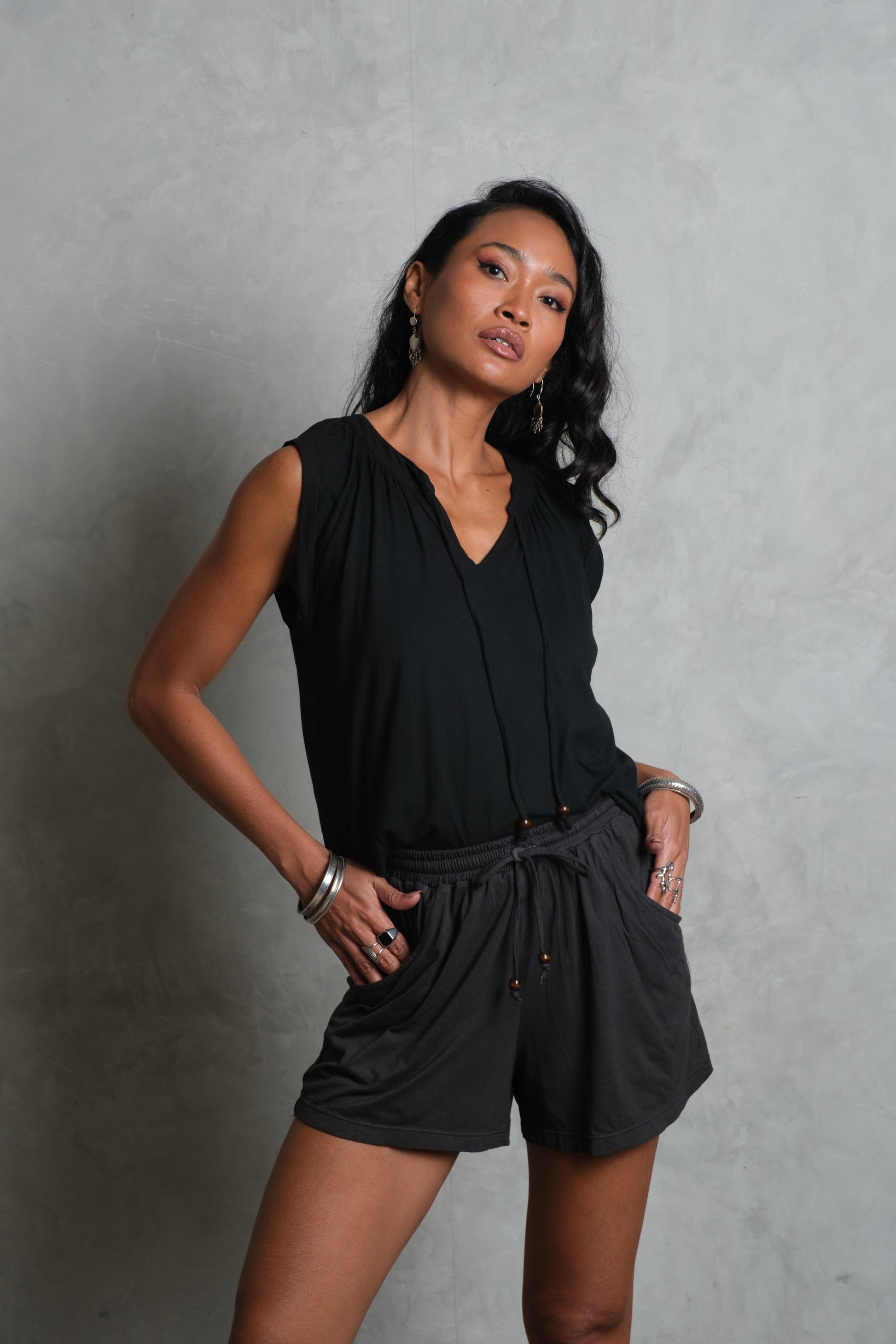 The MOKSHA Shorts are designed for effortless wear, cut from a soft bamboo–cotton blend that feels light against the skin. With a relaxed bohemian fit, elastic waist, and drawstring finished with wooden bead details, they capture the easy rhythm of Bali life. Side pockets add a touch of practicality, while the fluid drape and natural fabric make them ideal for barefoot days, beach strolls, or layered into a laid-back boho look.