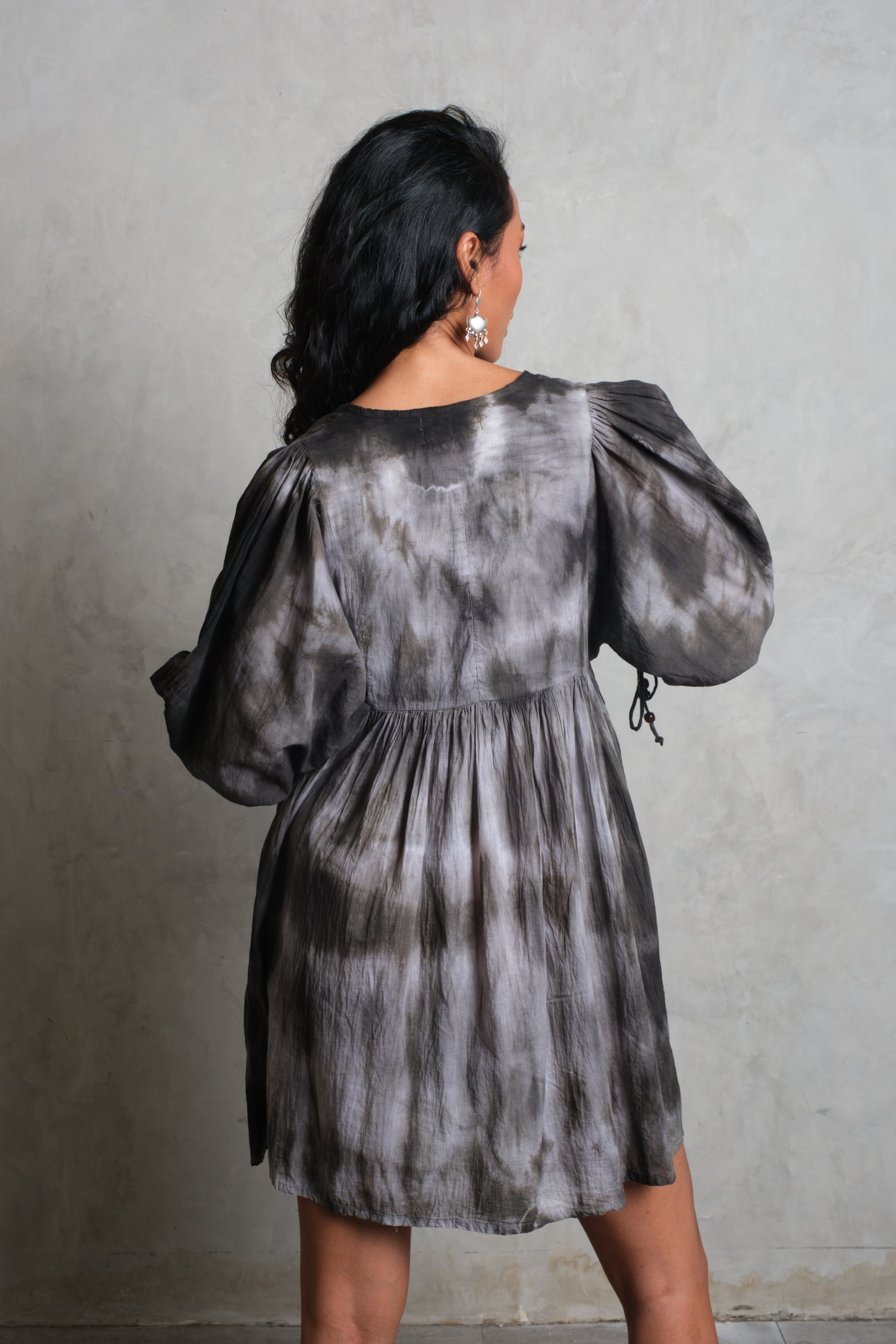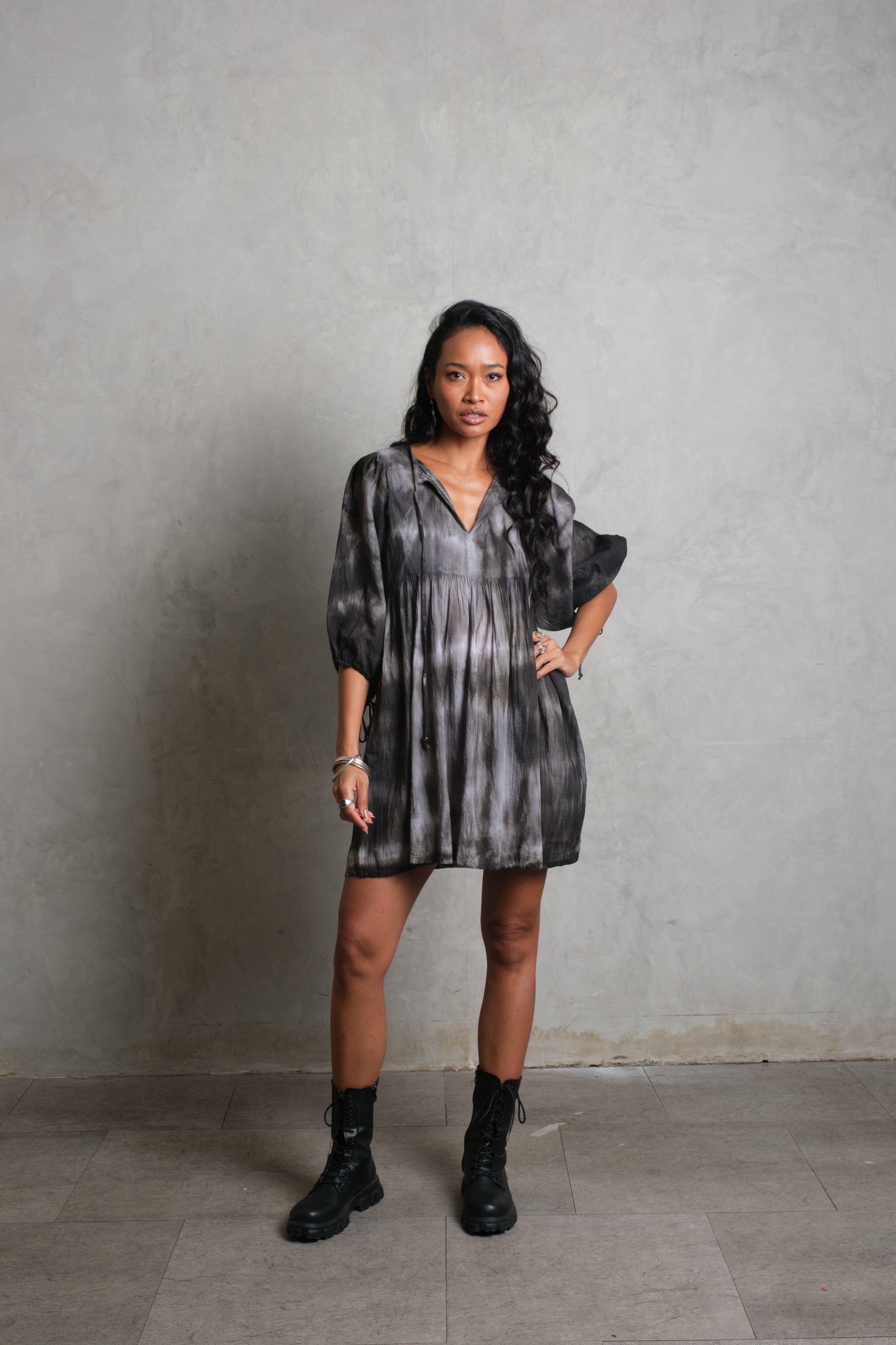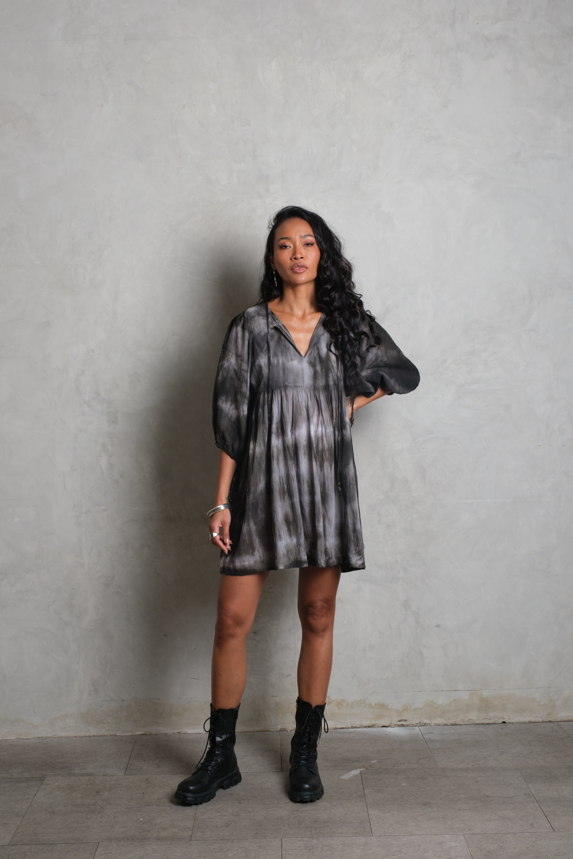 The SAGE Mini is a playful yet effortless dress, designed with a relaxed silhouette and soft volume. Featuring a V-neckline and gently gathered bodice, it flows into a loose, above-the-knee skirt that moves with ease. The three-quarter sleeves are lightly tapered for balance, while the lightweight cotton and pigment tie-dye finish give it a unique, free-spirited character. Equally suited for barefoot days or styled with boots, the SAGE Mini is made for easy living with a touch of edge.