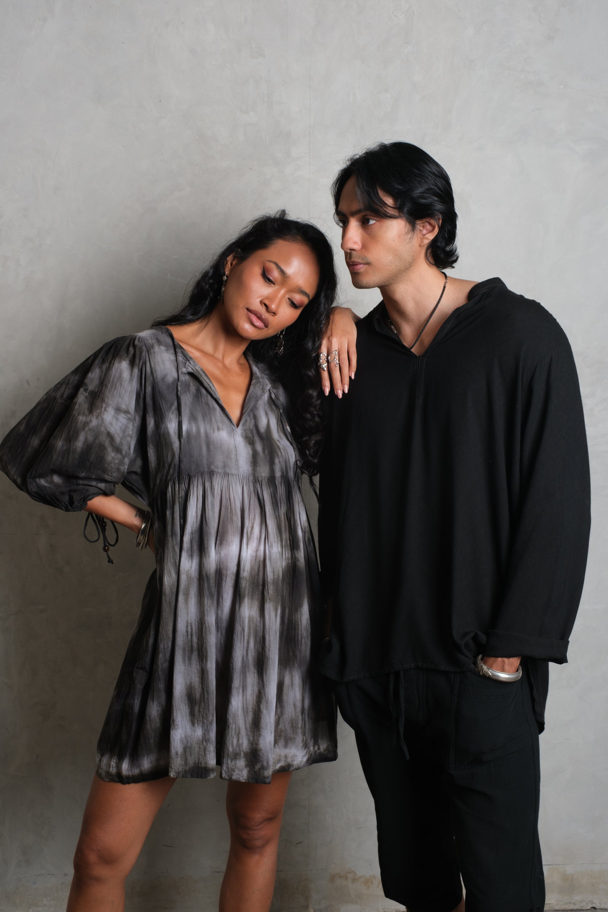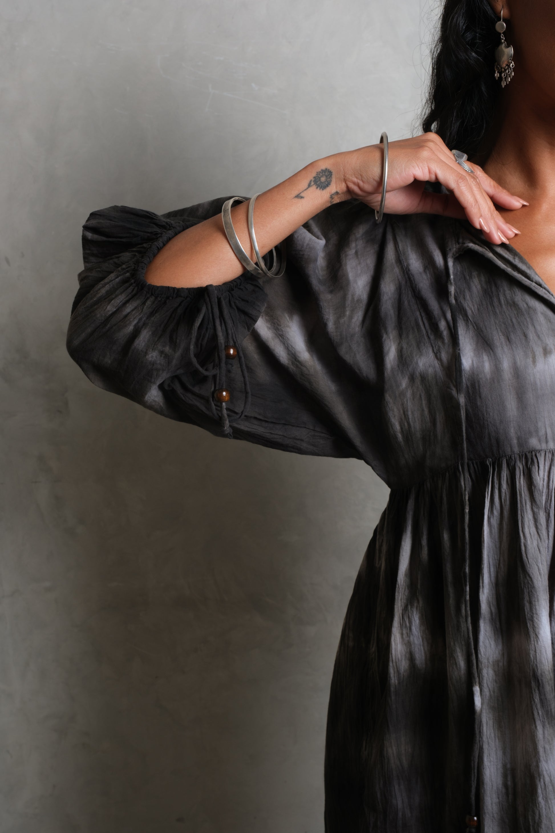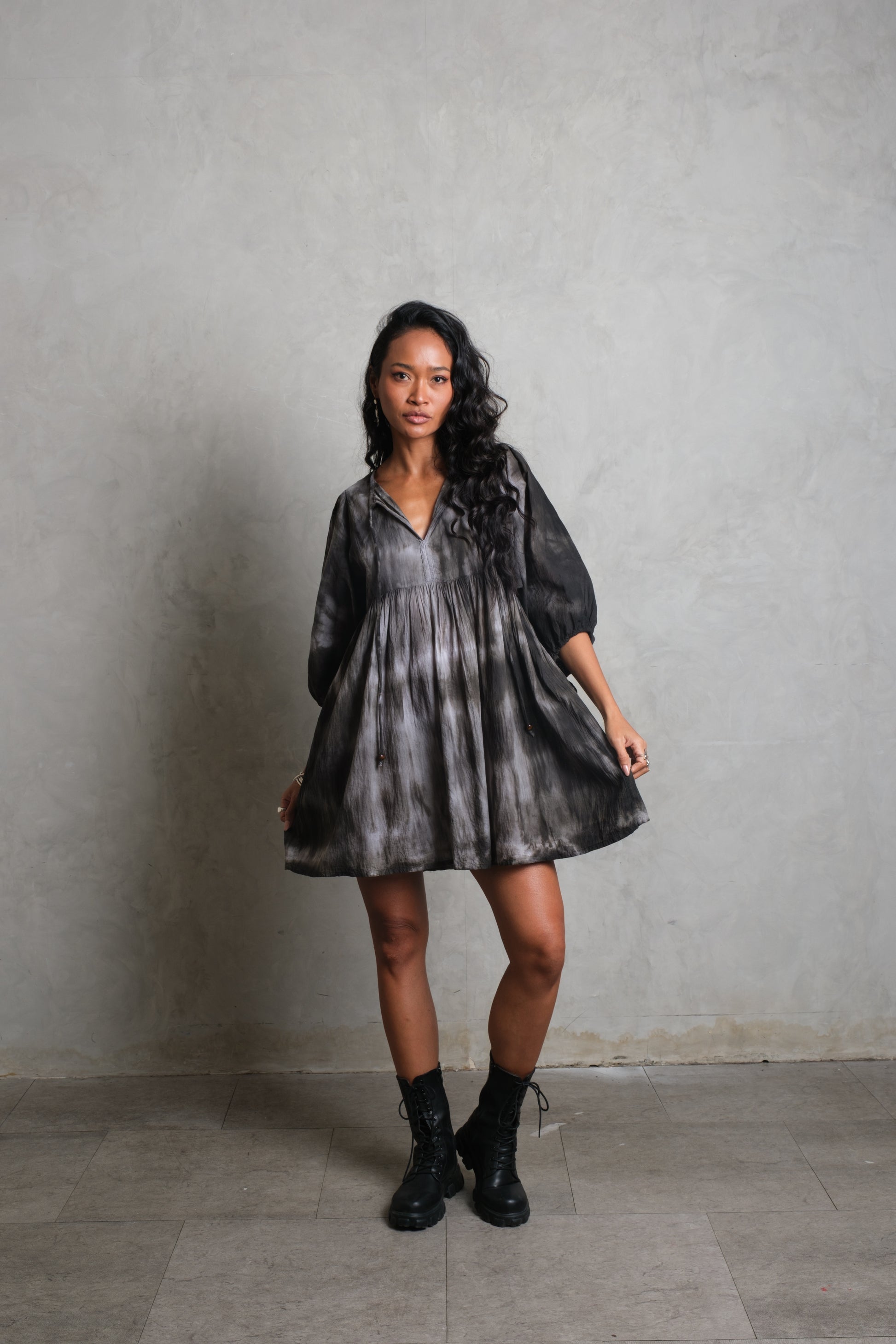 The SAGE Mini is a playful yet effortless dress, designed with a relaxed silhouette and soft volume. Featuring a V-neckline and gently gathered bodice, it flows into a loose, above-the-knee skirt that moves with ease. The three-quarter sleeves are lightly tapered for balance, while the lightweight cotton and pigment tie-dye finish give it a unique, free-spirited character. Equally suited for barefoot days or styled with boots, the SAGE Mini is made for easy living with a touch of edge.