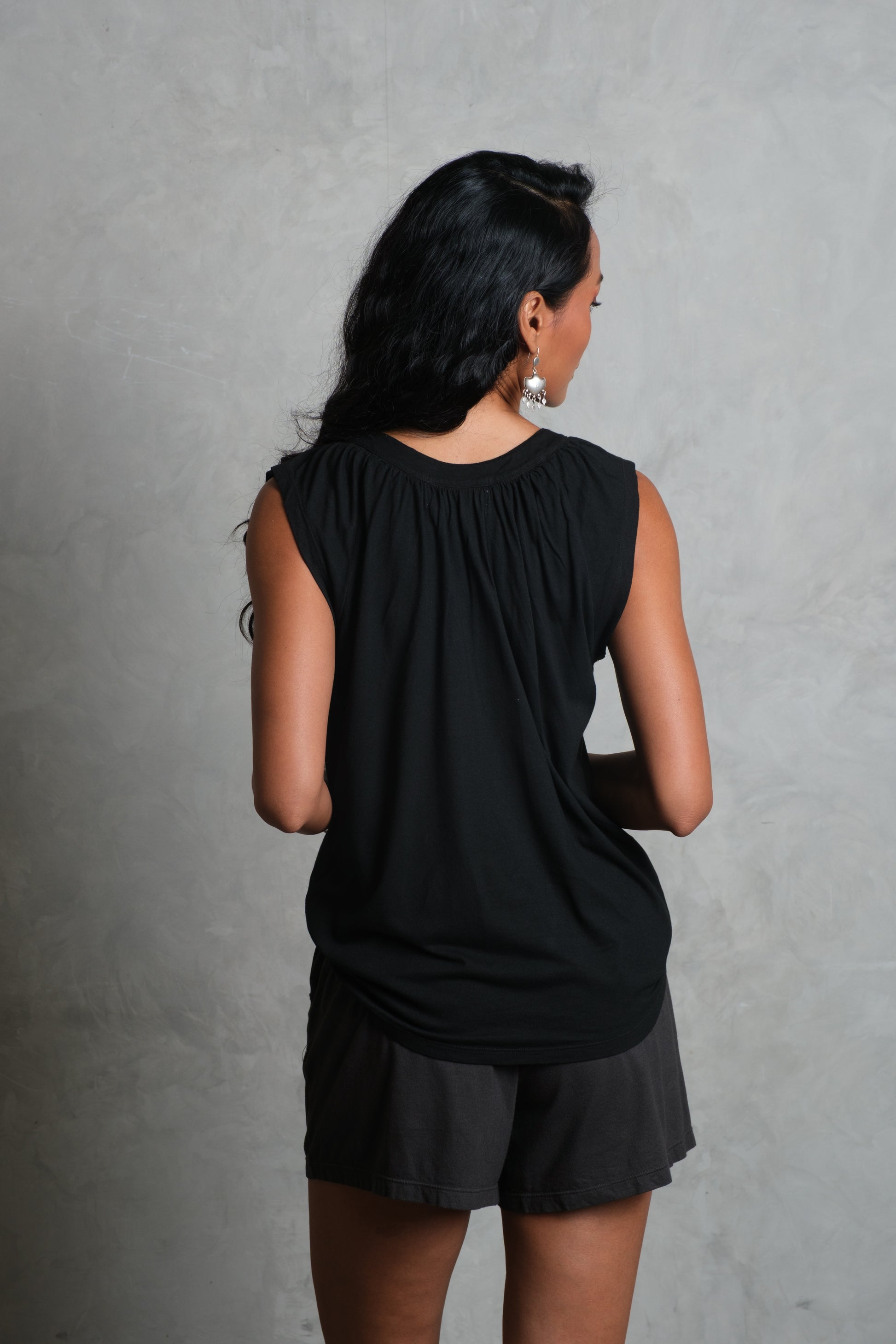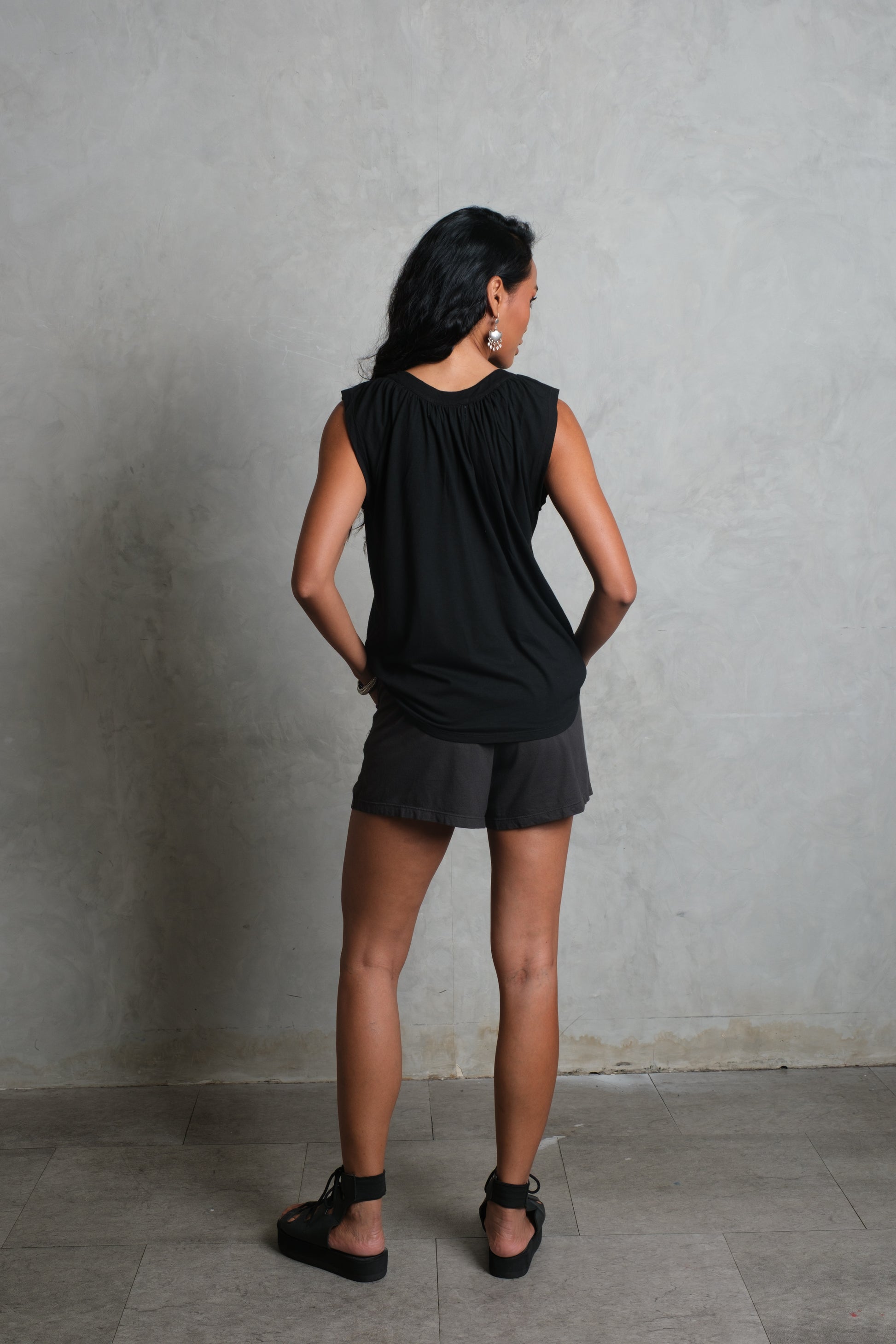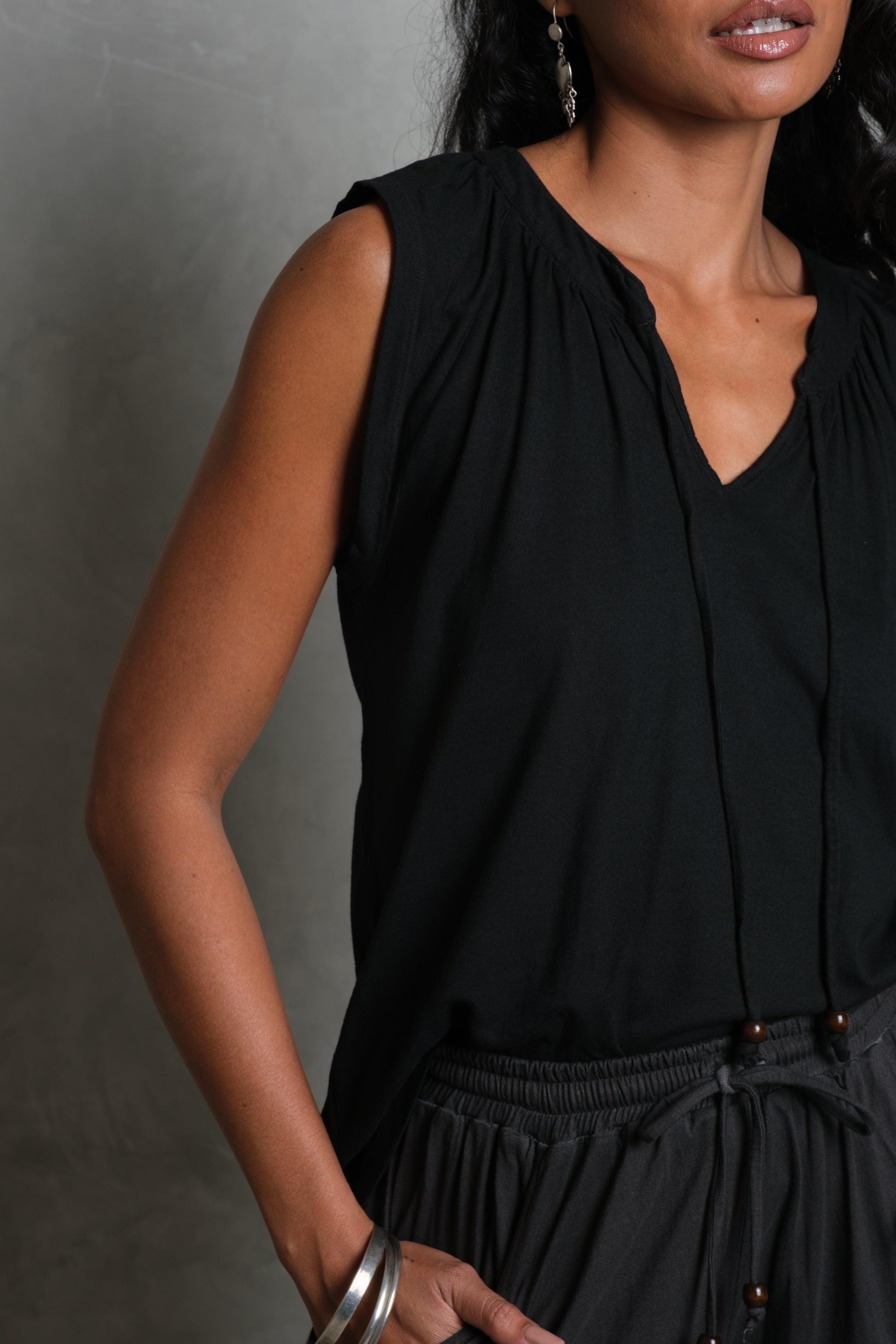 The SAMSARA Top is a sleeveless design with an effortless bohemian flow. A soft V-neckline with adjustable drawstring ties adds detail, while the relaxed cut drapes lightly against the body. Hand-dyed with natural pigments, the fabric reveals organic streaks and shifting tones, giving every piece its own character. Light and versatile, the SAMSARA moves easily from laid-back days to spirited evenings.