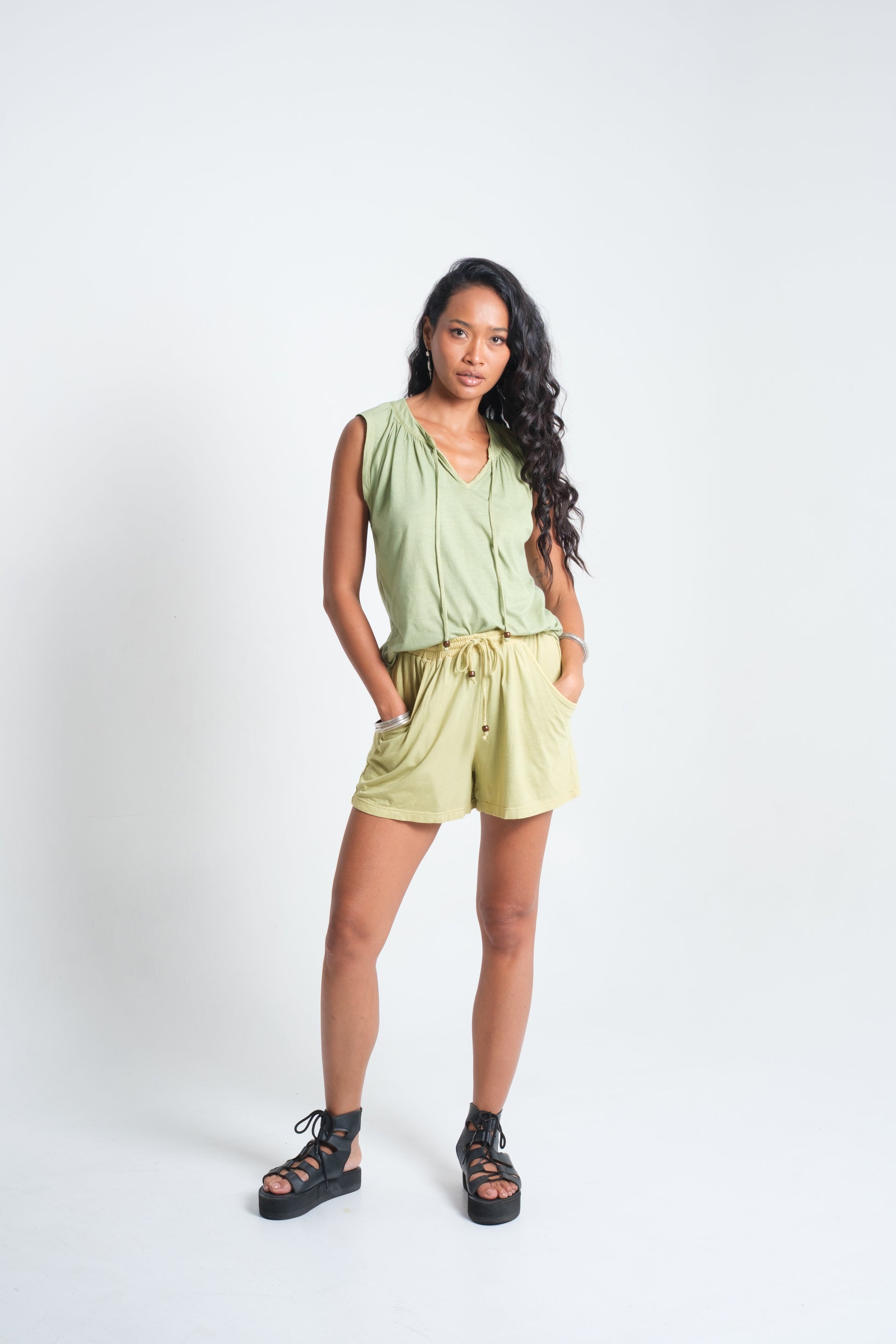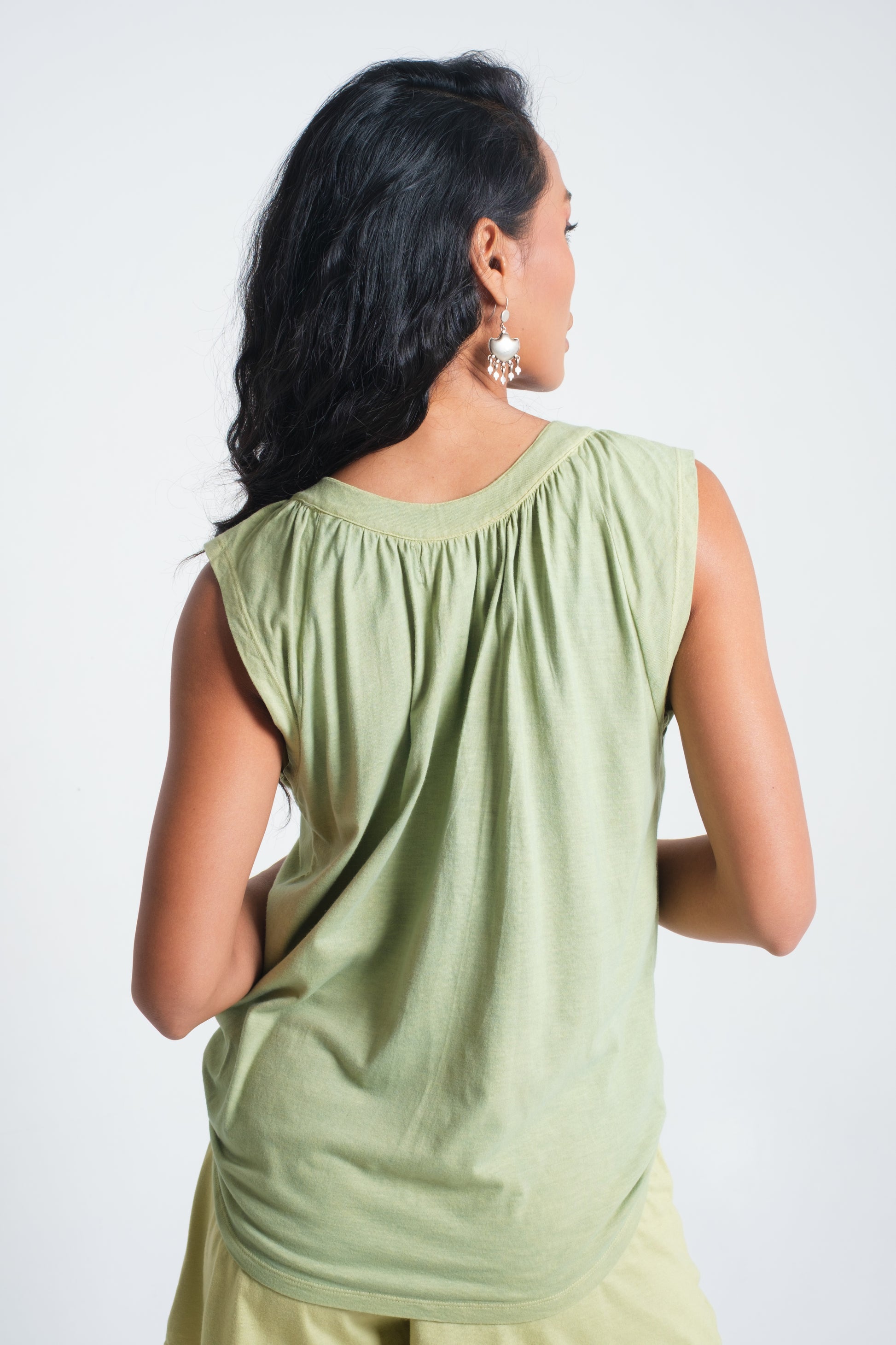 The SAMSARA Top is a sleeveless design with an effortless bohemian flow. A soft V-neckline with adjustable drawstring ties adds detail, while the relaxed cut drapes lightly against the body. Hand-dyed with natural pigments, the fabric reveals organic streaks and shifting tones, giving every piece its own character. Light and versatile, the SAMSARA moves easily from laid-back days to spirited evenings.