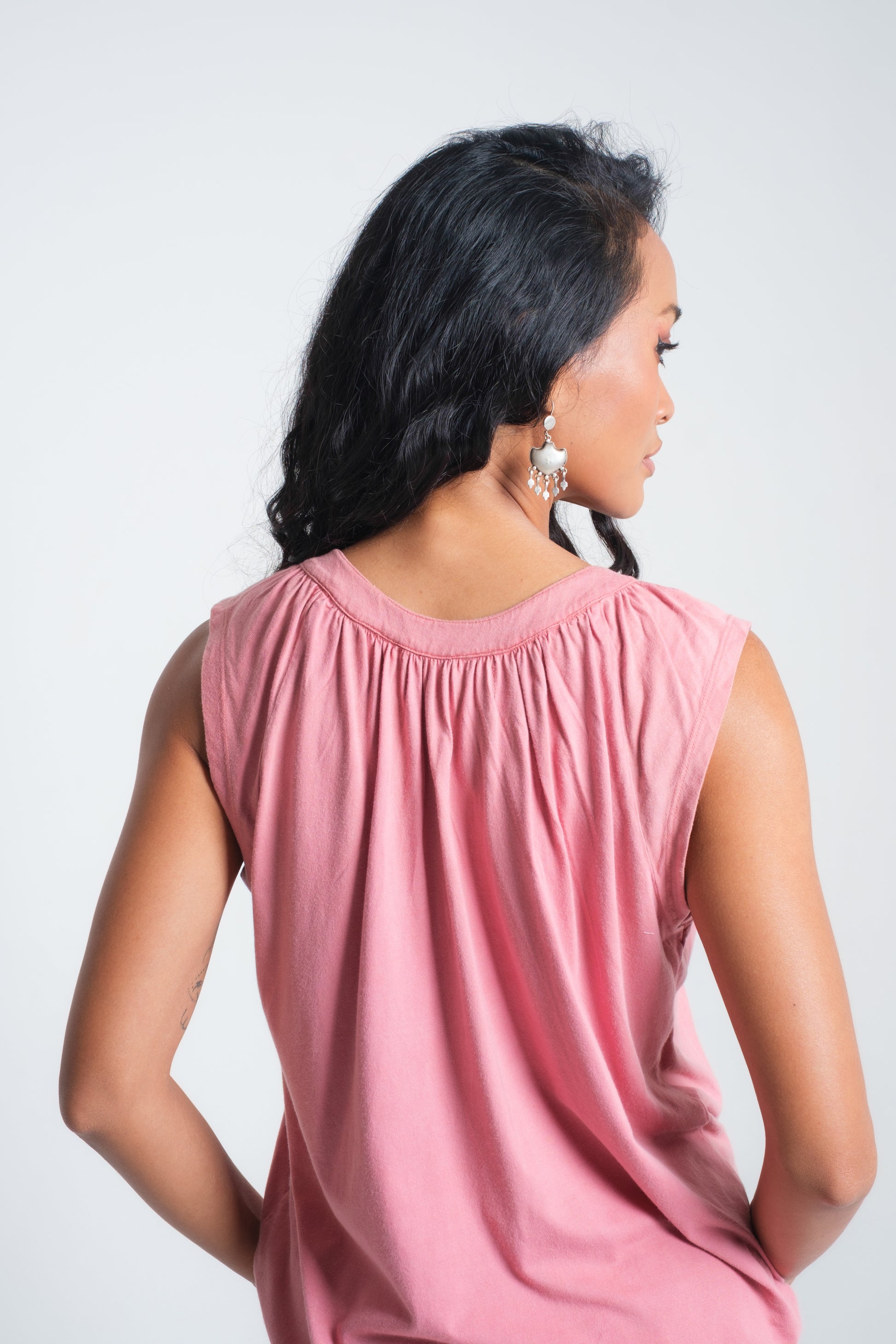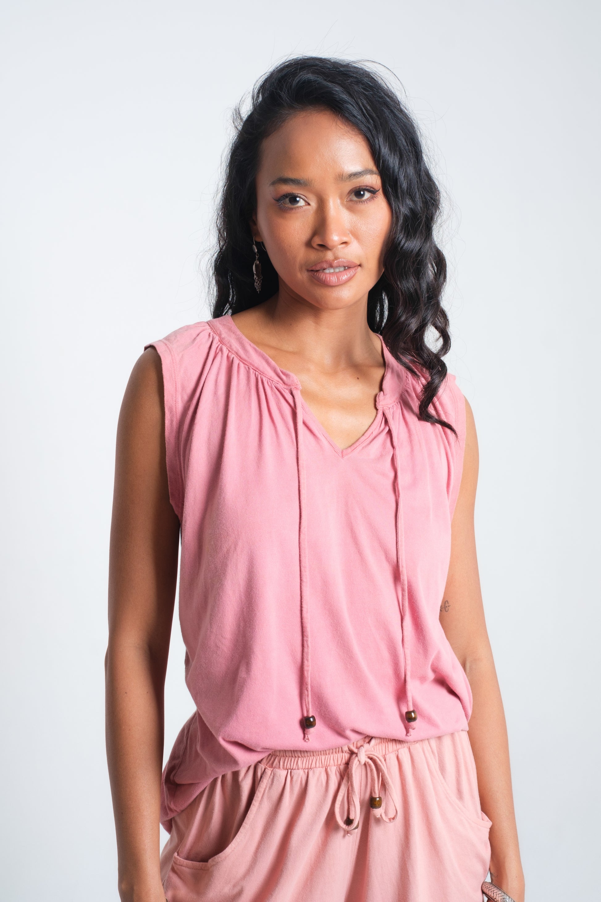 The SAMSARA Top is a sleeveless design with an effortless bohemian flow. A soft V-neckline with adjustable drawstring ties adds detail, while the relaxed cut drapes lightly against the body. Hand-dyed with natural pigments, the fabric reveals organic streaks and shifting tones, giving every piece its own character. Light and versatile, the SAMSARA moves easily from laid-back days to spirited evenings.