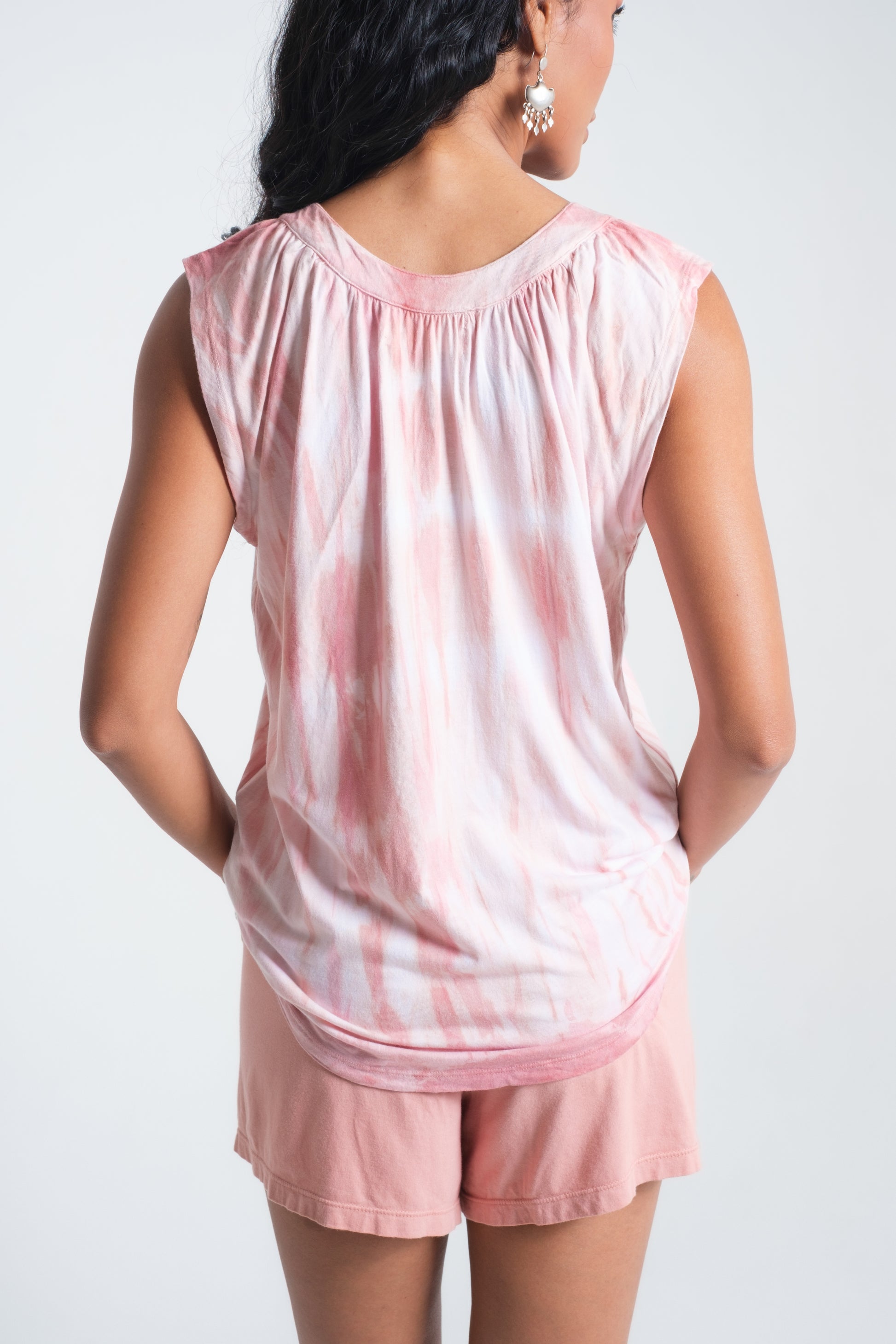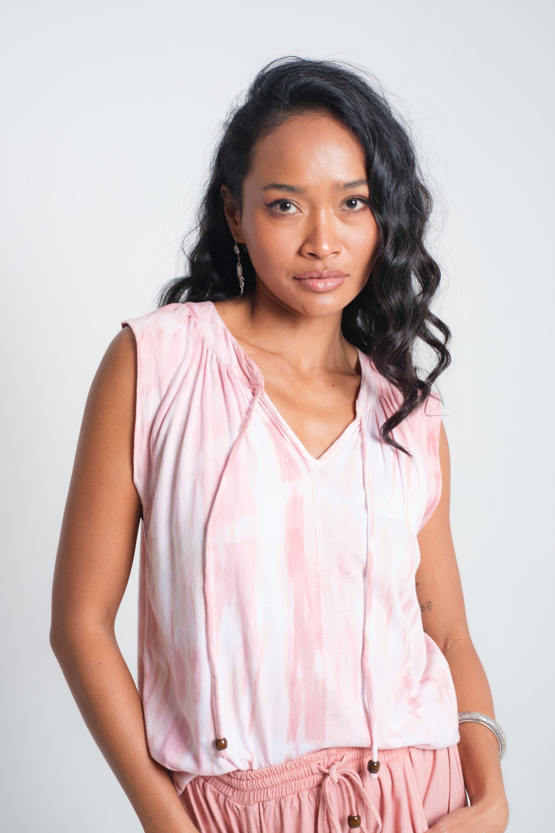 The SAMSARA Top is a sleeveless design with an effortless bohemian flow. A soft V-neckline with adjustable drawstring ties adds detail, while the relaxed cut drapes lightly against the body. Hand-dyed with natural pigments, the fabric reveals organic streaks and shifting tones, giving every piece its own character. Light and versatile, the SAMSARA moves easily from laid-back days to spirited evenings.