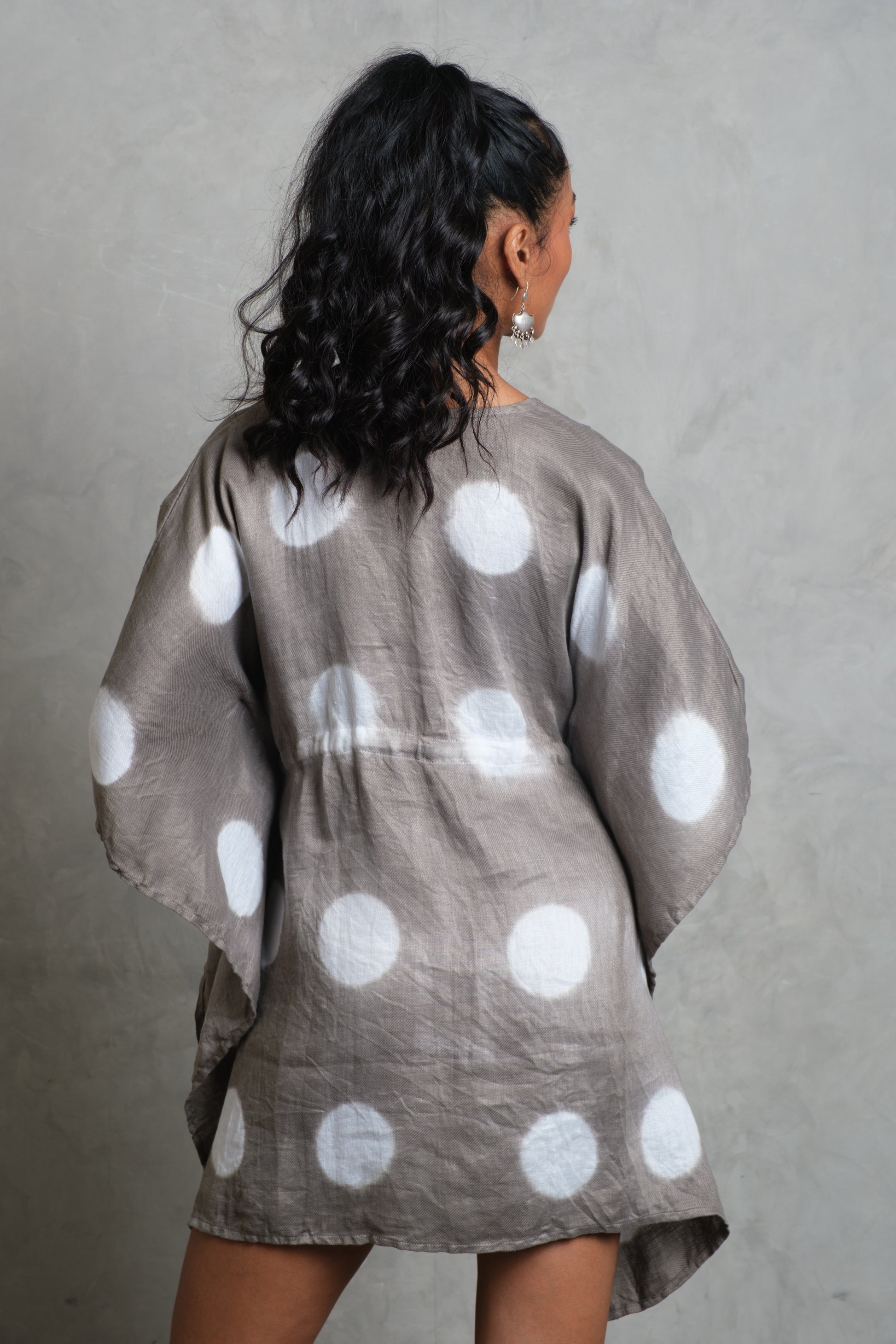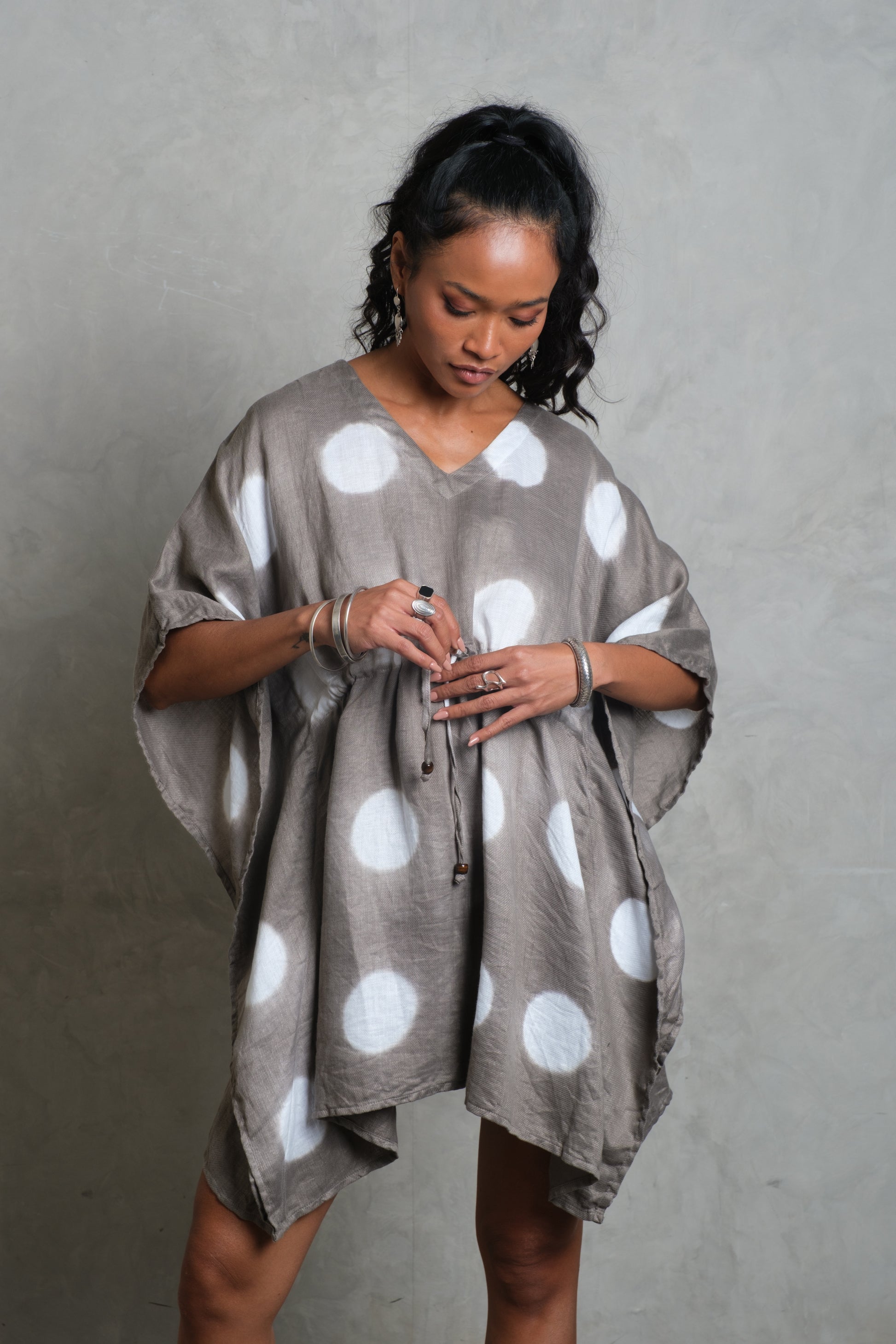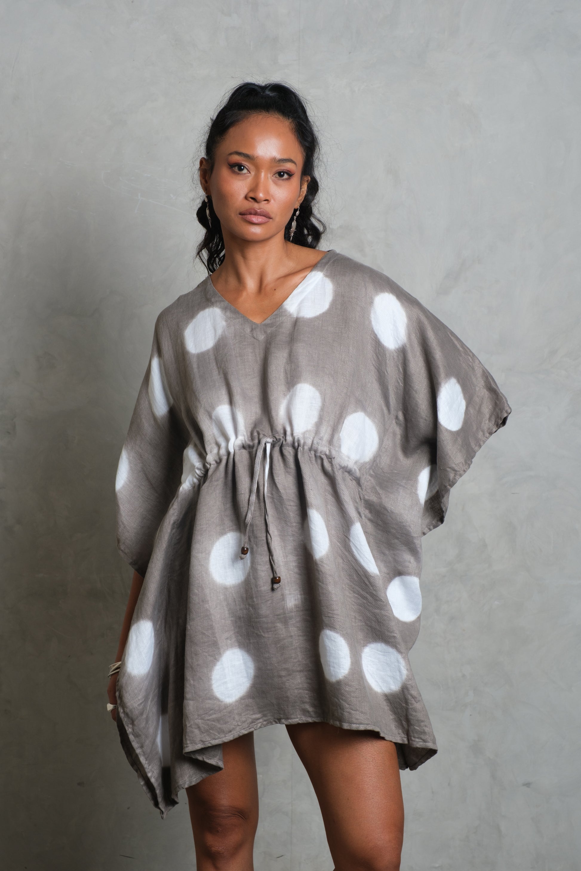 The SARI Kaftan is a free-flowing silhouette that captures effortless bohemian style. Cut from soft French linen, it drapes with ease through wide sleeves and a relaxed V-neckline. A drawstring waist with tie detail allows for adjustable shaping, while the fabric flows naturally around the body. Available in three finishes — bold Apache Black, pure Snow White, and a Smoke tie-dye pattern inspired by South Indian artistry — each kaftan carries its own character. Relaxed, versatile, and timelessly stylish, the SARI Kaftan is designed for barefoot days, resort evenings, and everything in between.