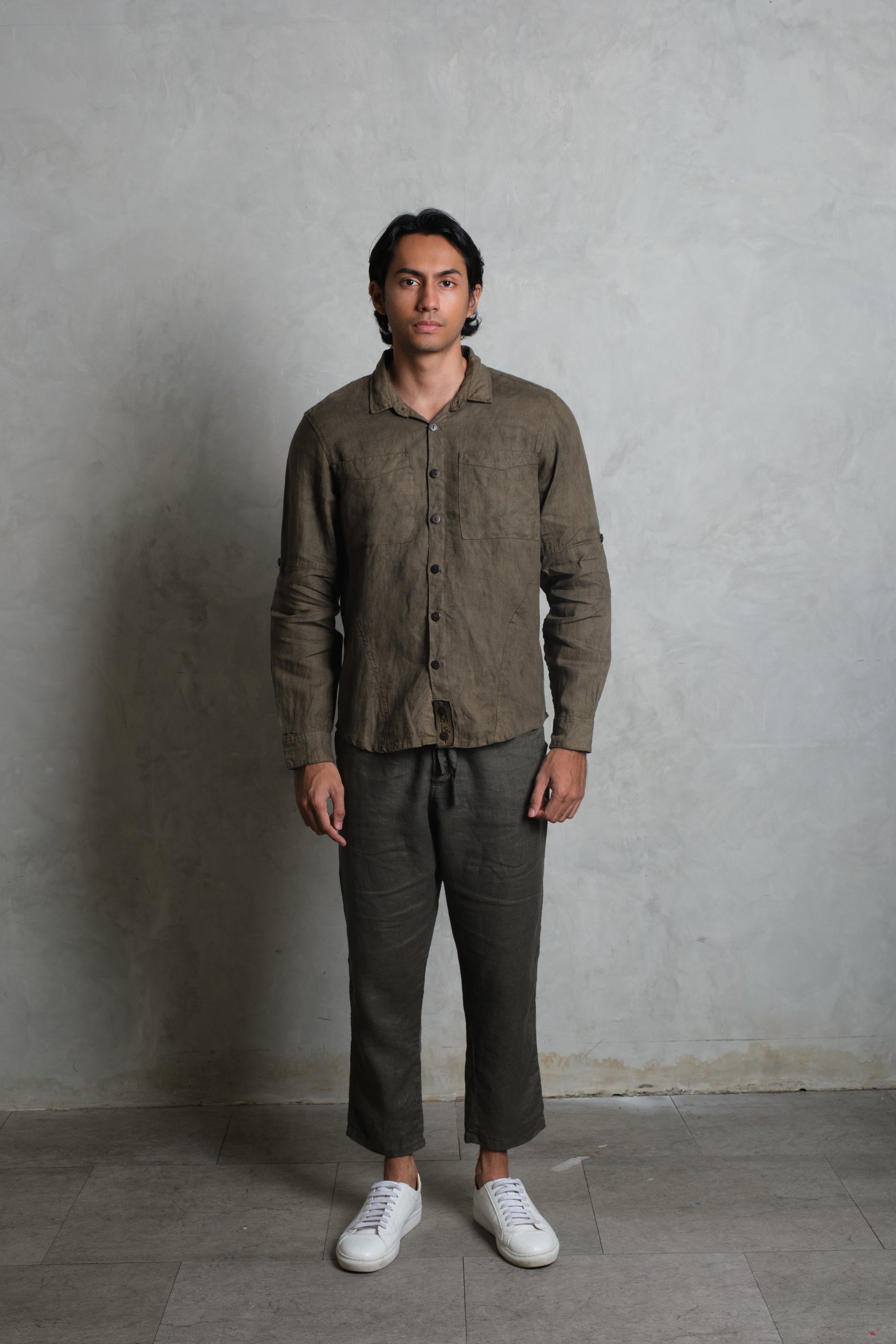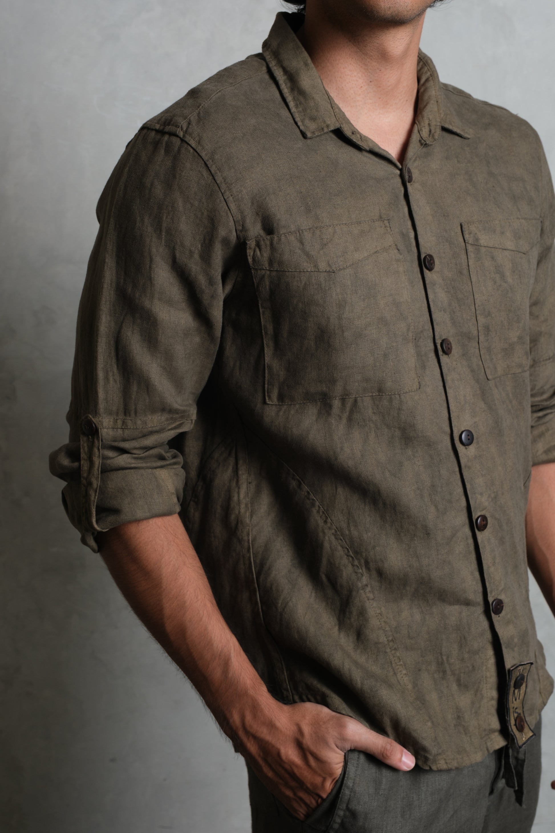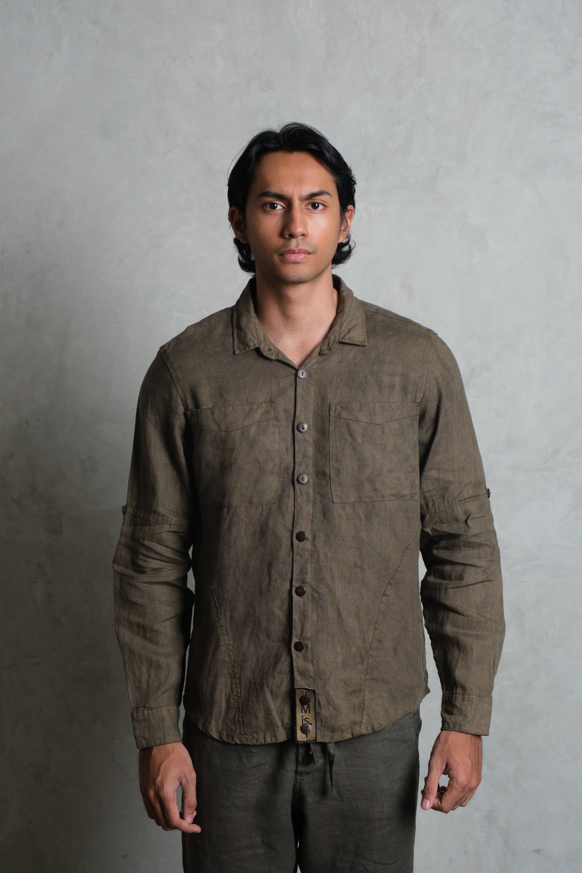 The SAYAN Shirt brings a clean, masculine attitude to French linen. A panelled construction runs through the torso and sleeves for structure and ease of movement, finished with a classic point collar and a straight, slightly curved hem. Two neatly proportioned chest pockets anchor the front, with coconut buttons along the placket and cuffs. Sleeves roll and secure with a button tab for warm-weather versatility, and the signature removable Muda js. badge sits at the lower placket as a subtle mark of identity. Wear it fastened to the top for a sharp, contemporary look, or loosen a few buttons for a relaxed island feel. Colours: Olive, Diopside, and Apache.