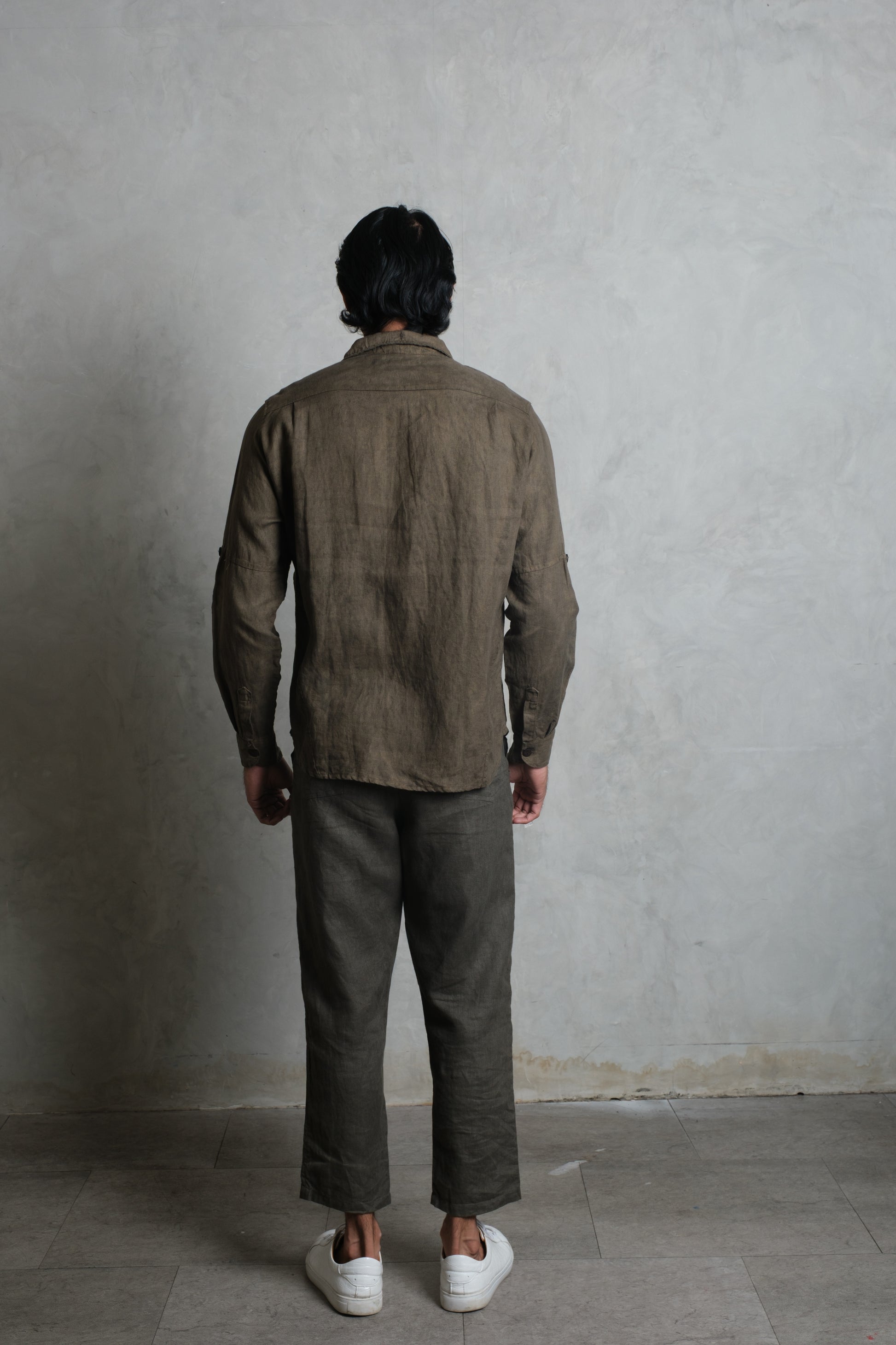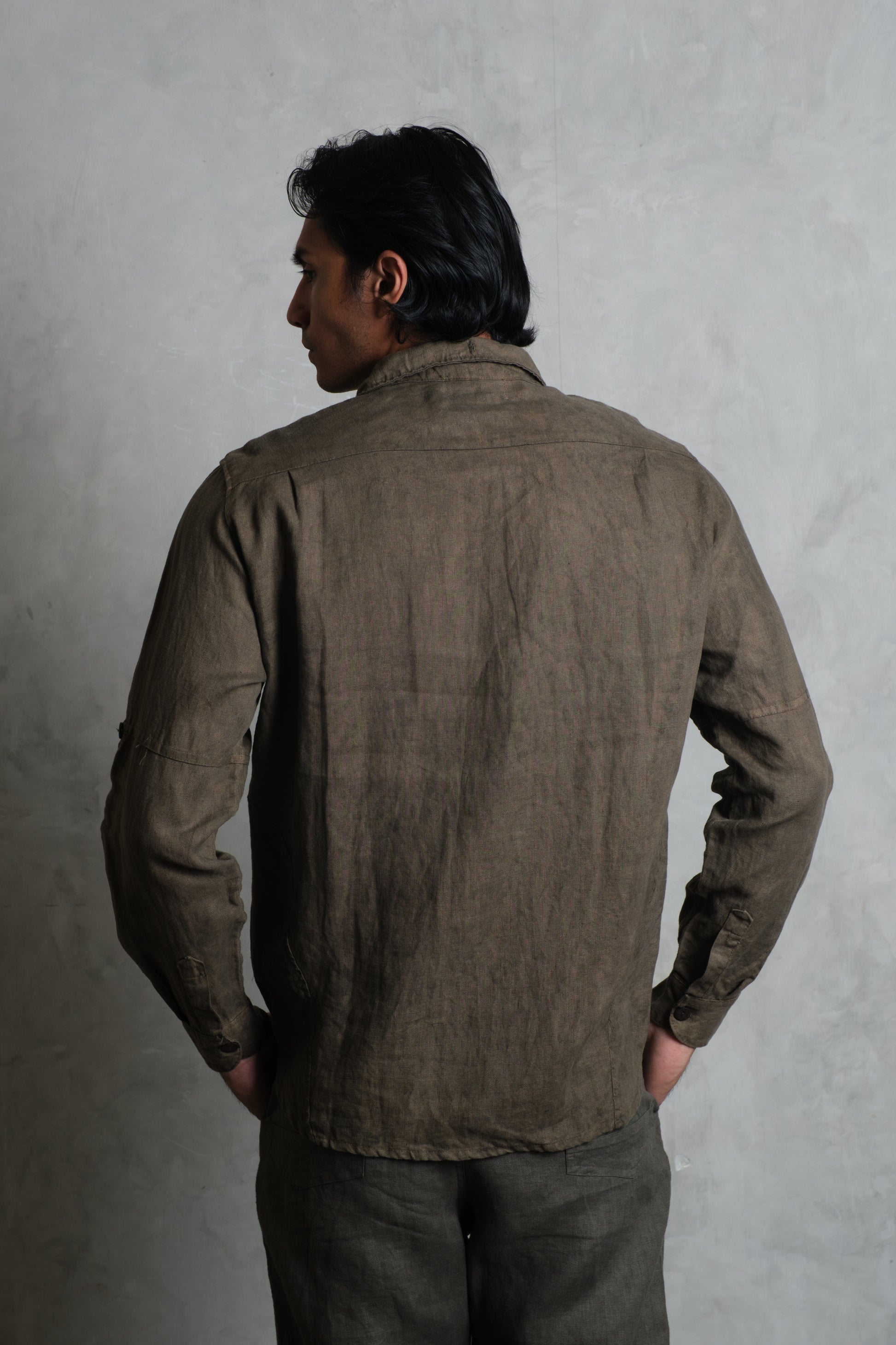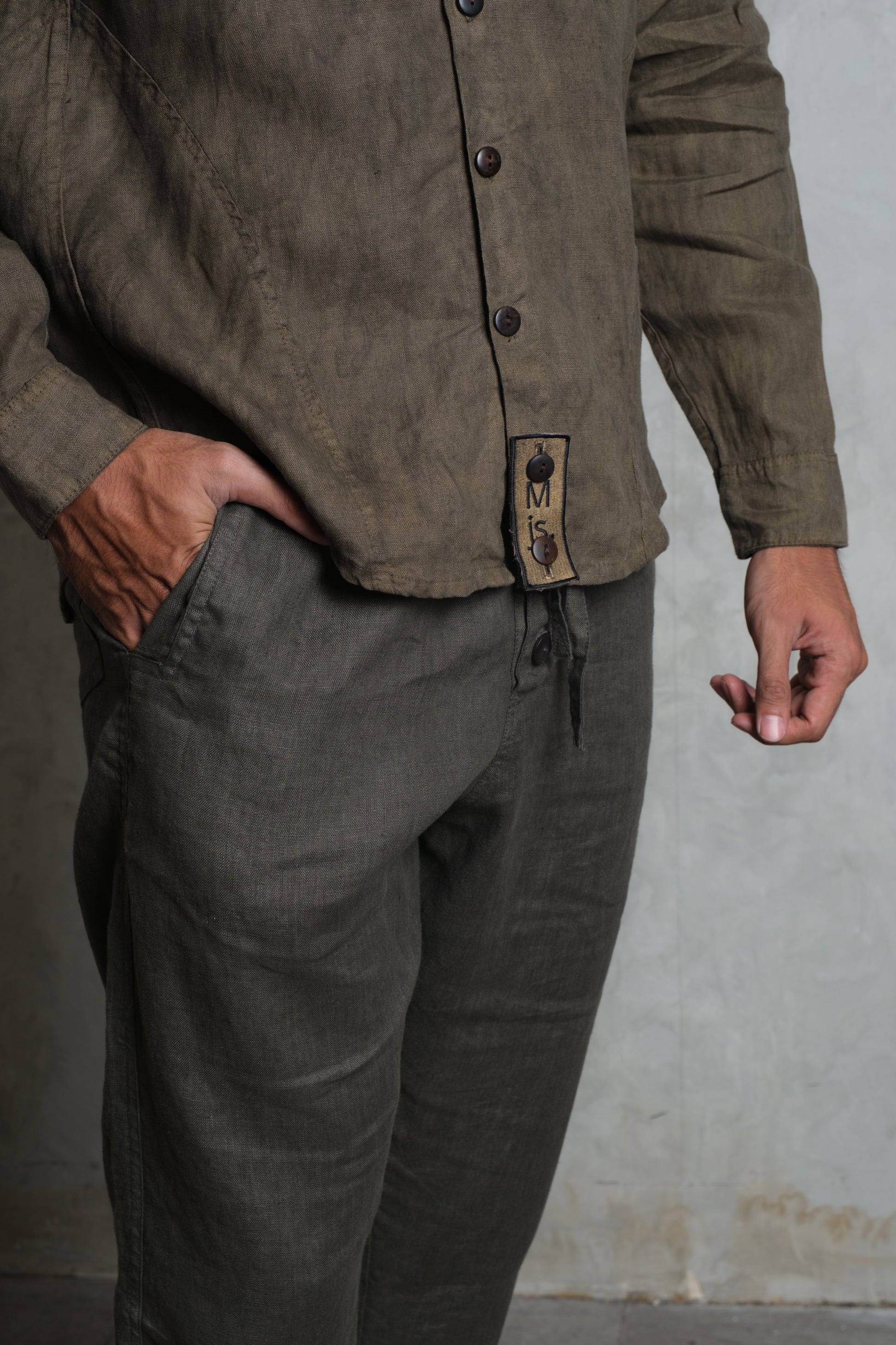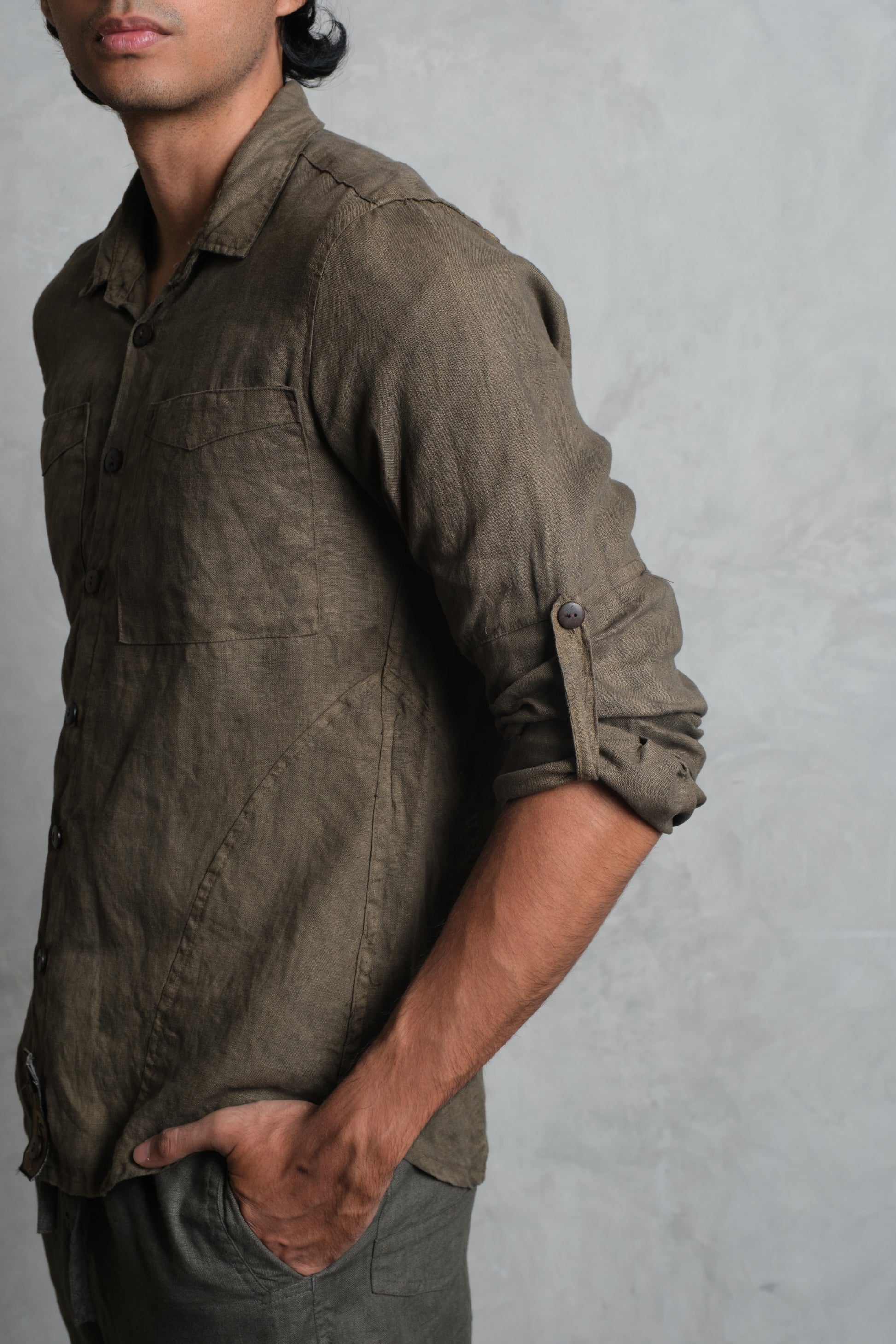The SAYAN Shirt brings a clean, masculine attitude to French linen. A panelled construction runs through the torso and sleeves for structure and ease of movement, finished with a classic point collar and a straight, slightly curved hem. Two neatly proportioned chest pockets anchor the front, with coconut buttons along the placket and cuffs. Sleeves roll and secure with a button tab for warm-weather versatility, and the signature removable Muda js. badge sits at the lower placket as a subtle mark of identity. Wear it fastened to the top for a sharp, contemporary look, or loosen a few buttons for a relaxed island feel. Colours: Olive, Diopside, and Apache.