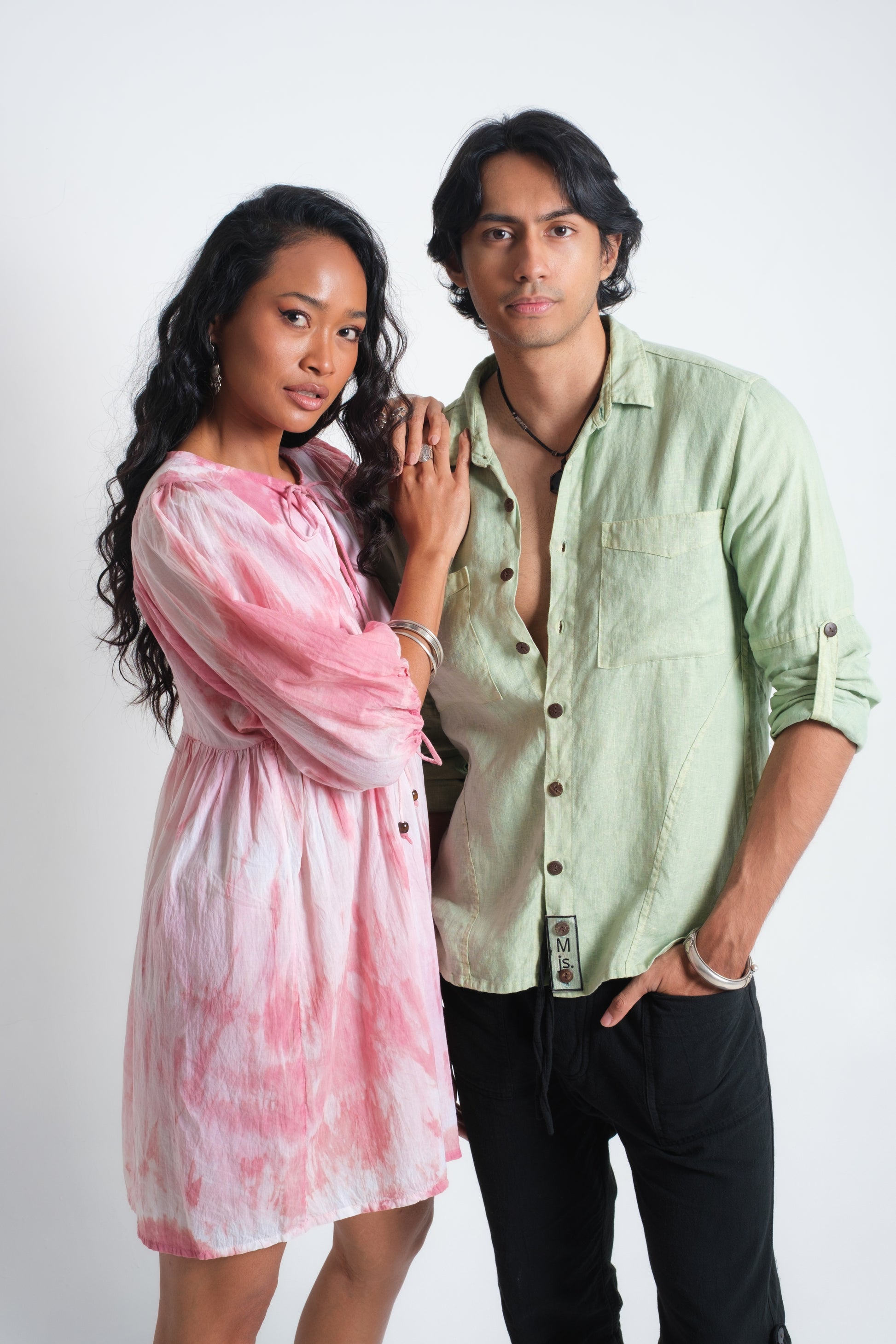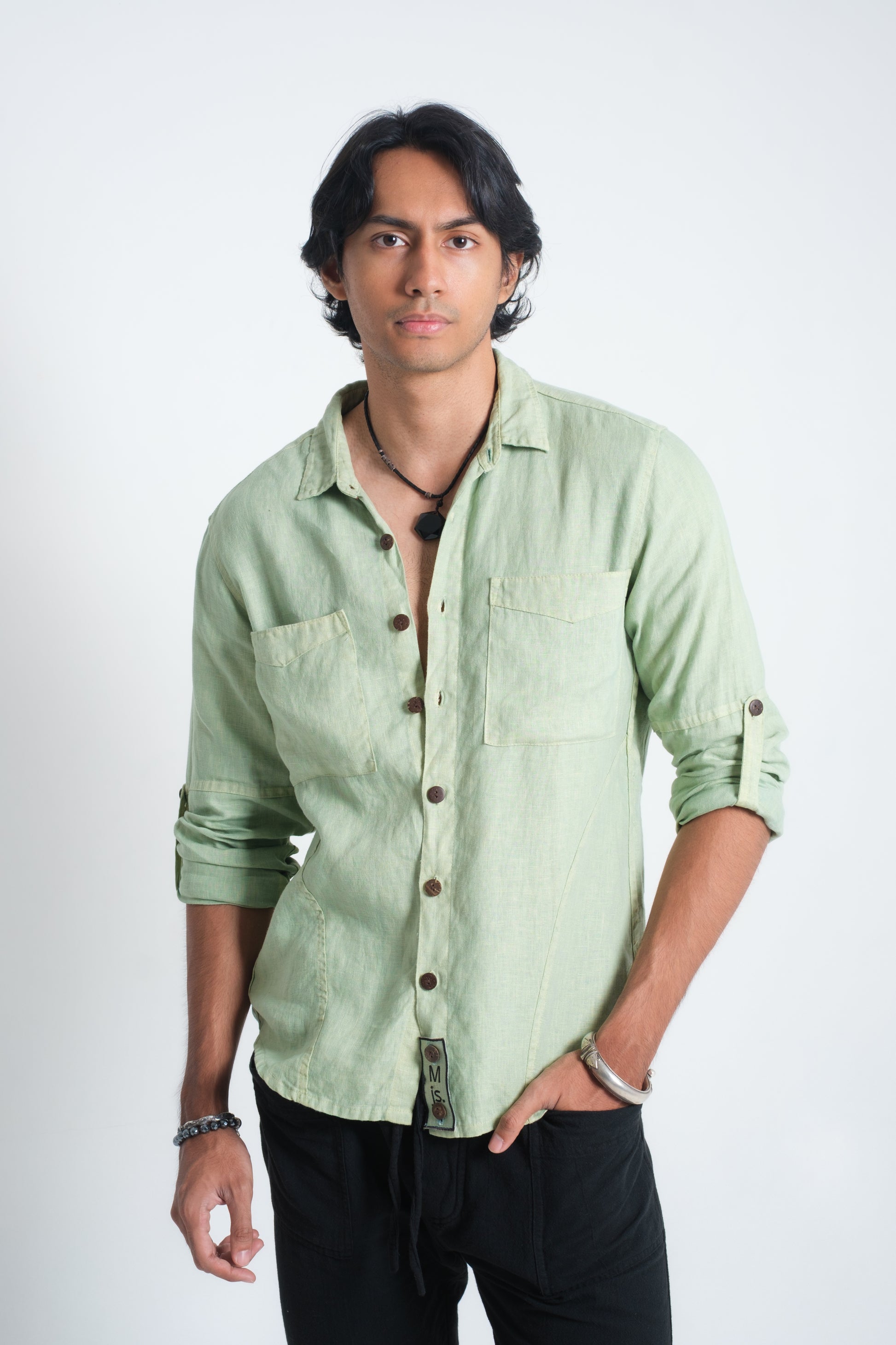 The SAYAN Shirt brings a clean, masculine attitude to French linen. A panelled construction runs through the torso and sleeves for structure and ease of movement, finished with a classic point collar and a straight, slightly curved hem. Two neatly proportioned chest pockets anchor the front, with coconut buttons along the placket and cuffs. Sleeves roll and secure with a button tab for warm-weather versatility, and the signature removable Muda js. badge sits at the lower placket as a subtle mark of identity. Wear it fastened to the top for a sharp, contemporary look, or loosen a few buttons for a relaxed island feel. Colours: Olive, Diopside, and Apache.