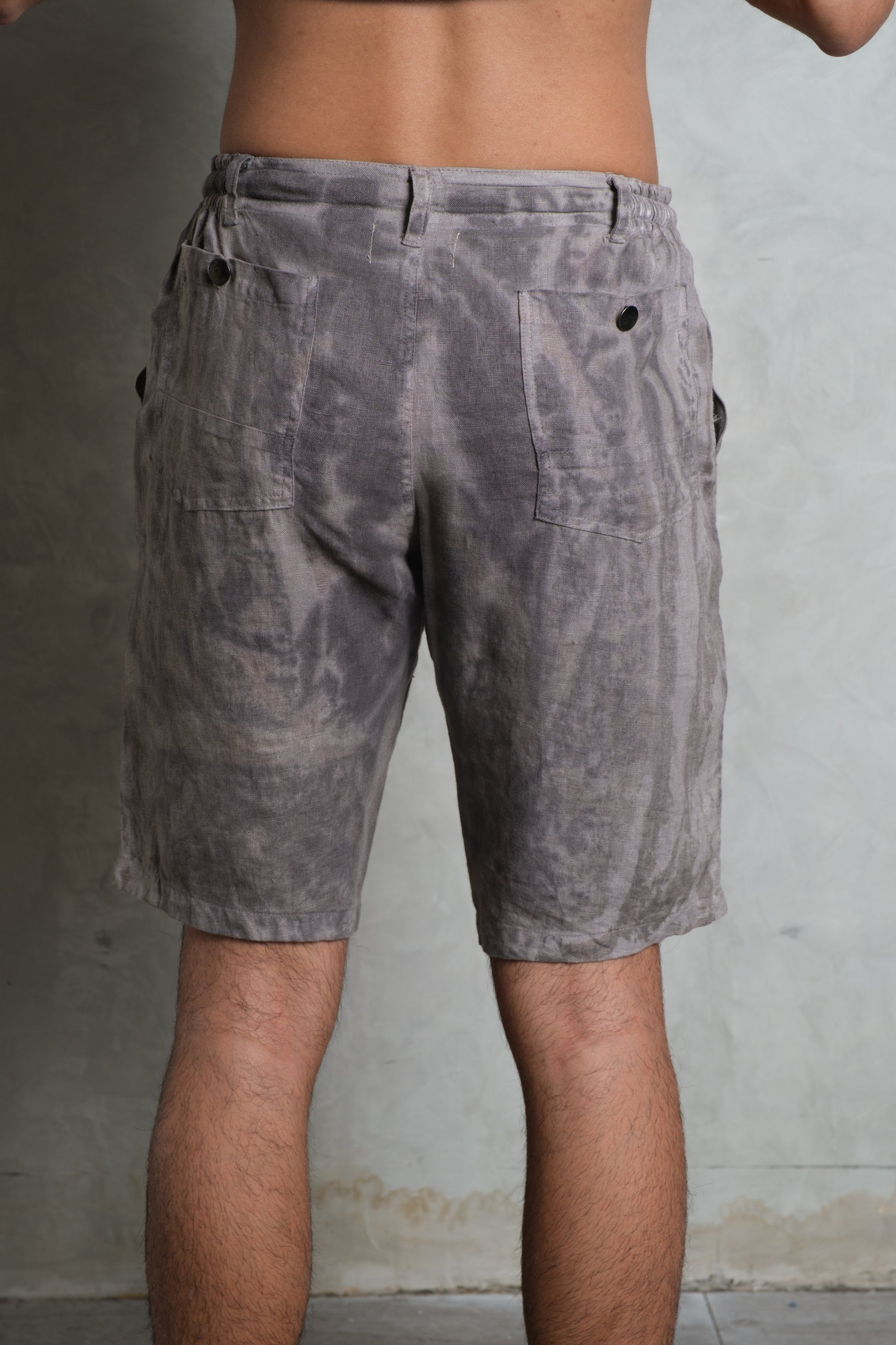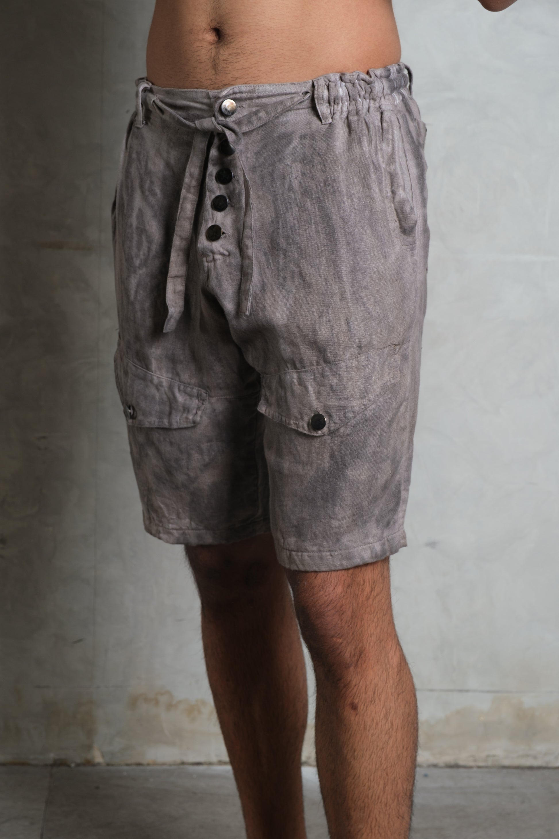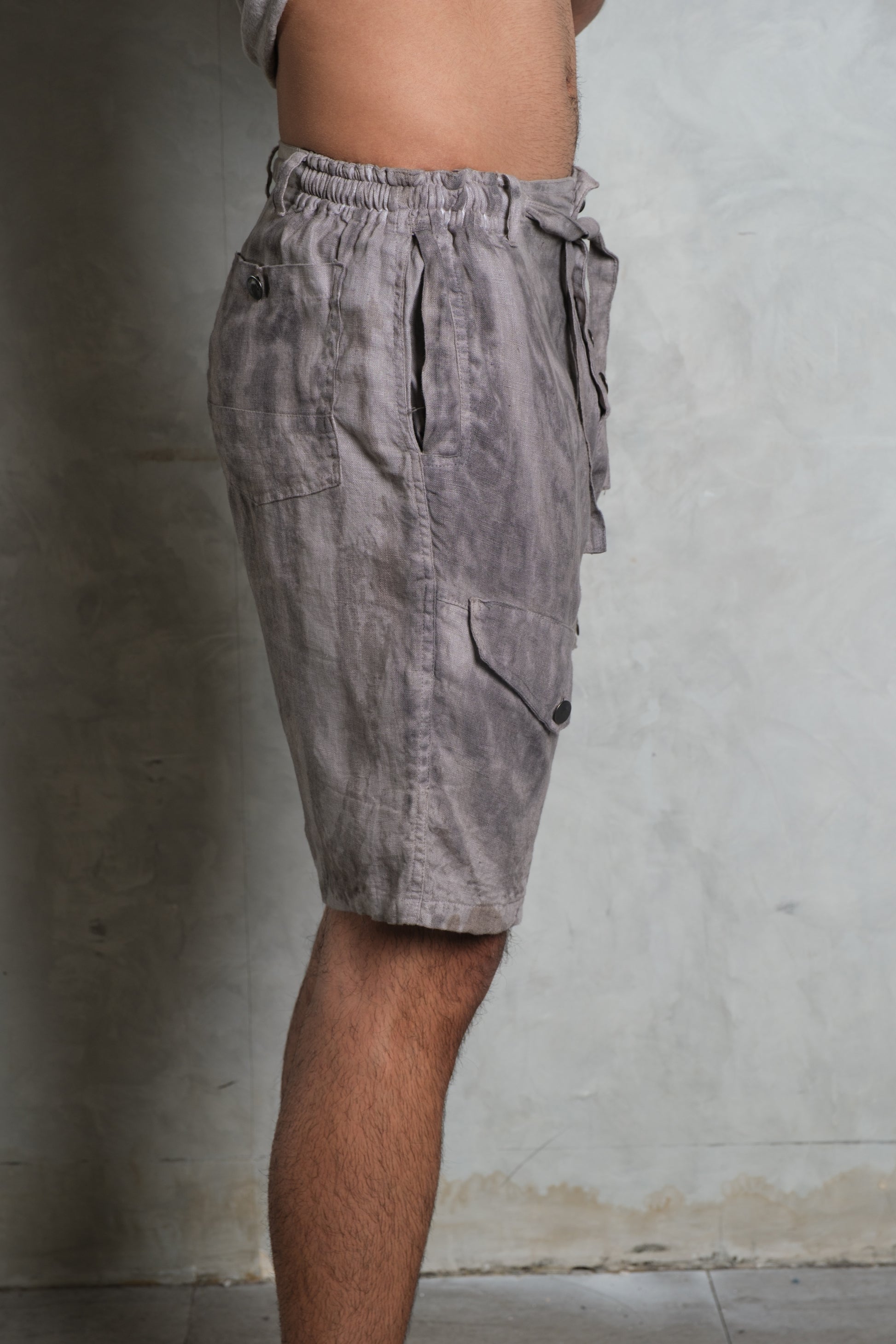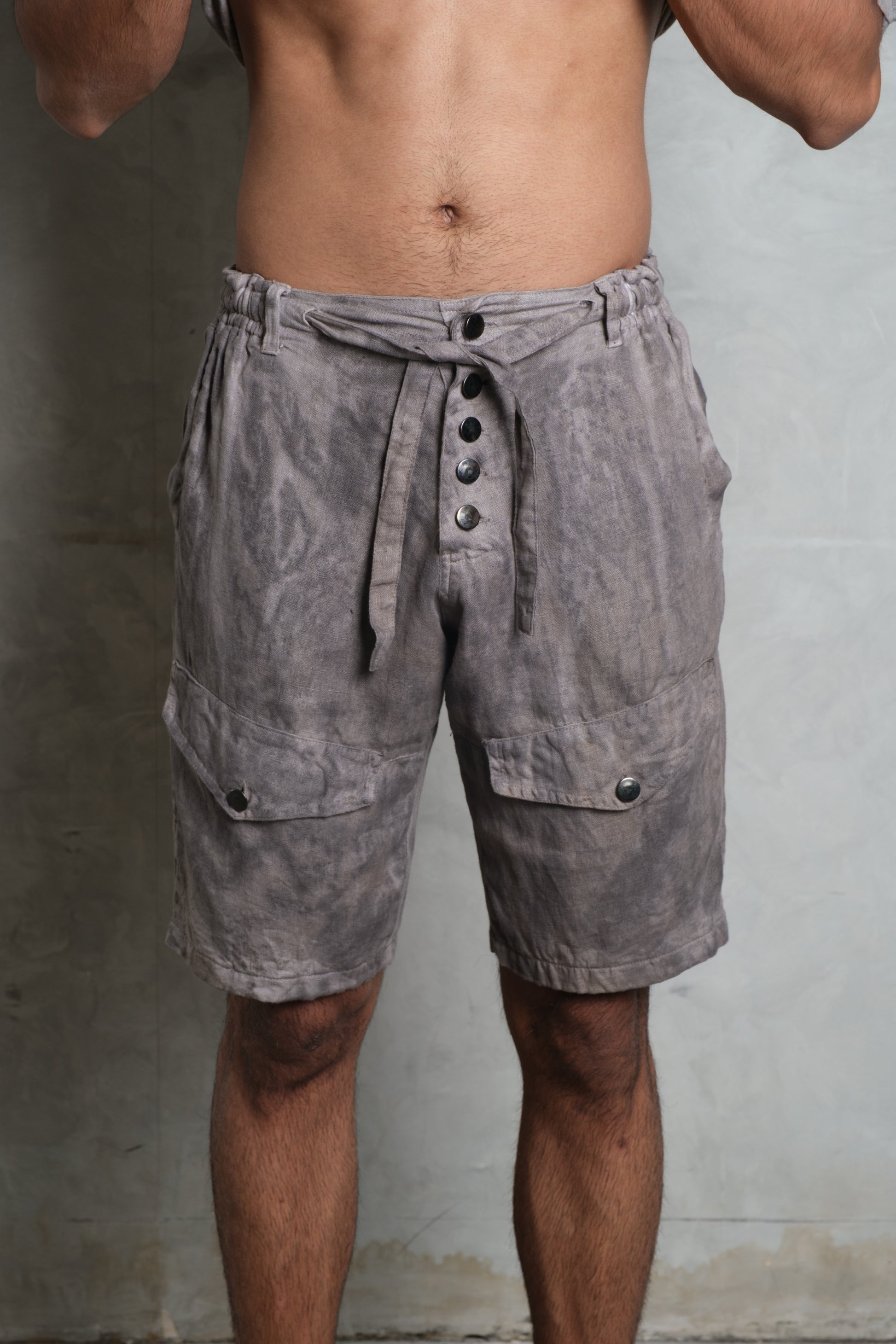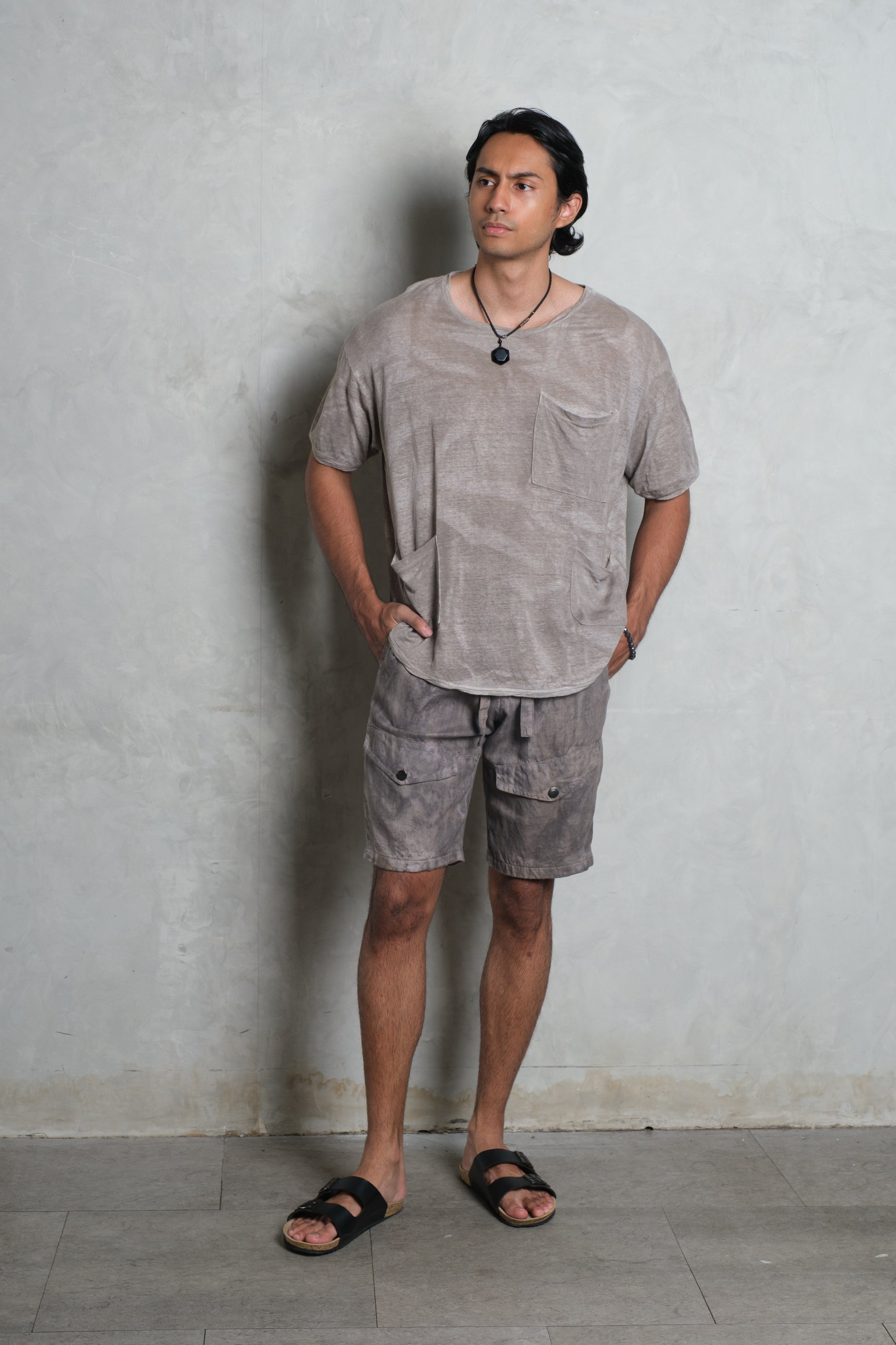 The SI Shorts reimagine the cargo silhouette with a contemporary edge. Cut from French linen, they are naturally breathable yet strong, designed for effortless movement and daily wear. Each pair is individually pigment-dyed in Smoke, Apache, or Olive — a natural process that creates subtle distressed finishes, ensuring no two are ever alike. Front and back pockets bring utility, while the addition of side cargo pockets adds structure and function. Finished with industrial-style metal buttons and a relaxed tie-front closure, the SI Shorts embody understated strength and modern sprezzatura — an essential piece for the Muda js. MAN.