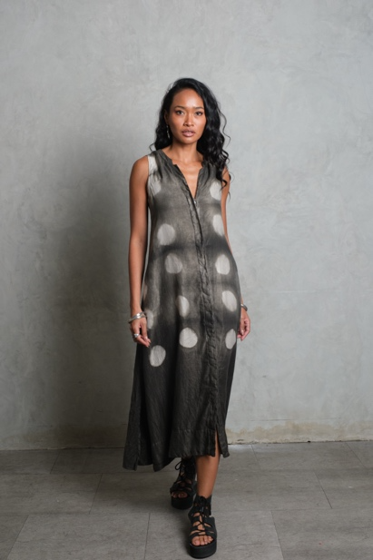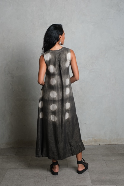 The SURYA Dress is a statement in effortless elegance, cut from luxurious French linen that drapes with natural ease. Its sleeveless silhouette flows into a full-length skirt with hidden side pockets, balancing practicality with refined design. The fabric is tie-dyed by hand using natural plant pigments in a smoke-grey palette, inspired by traditional South Indian patterns. Subtle variations in tone and pattern make each dress unique, embodying the spirit of imperfection and individuality — a true expression of Sprezzatura.