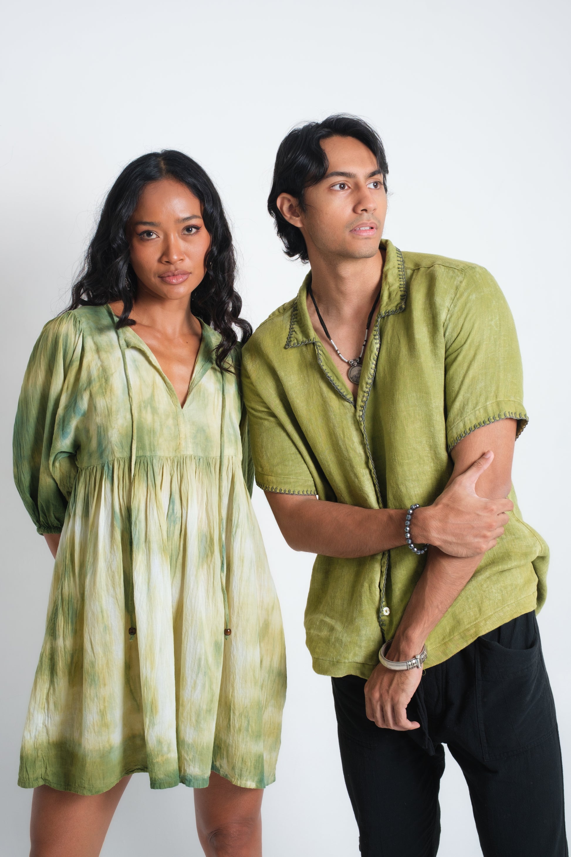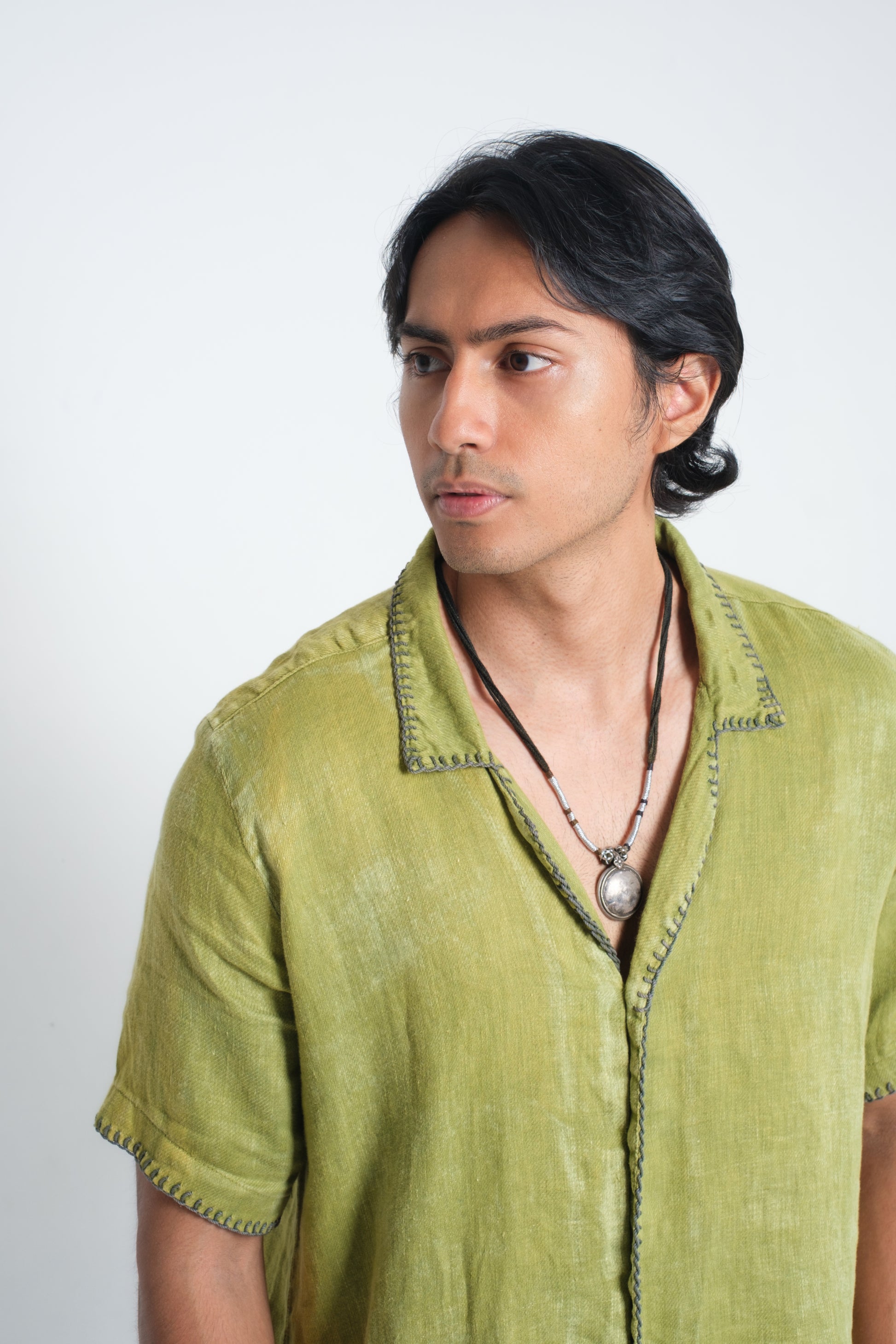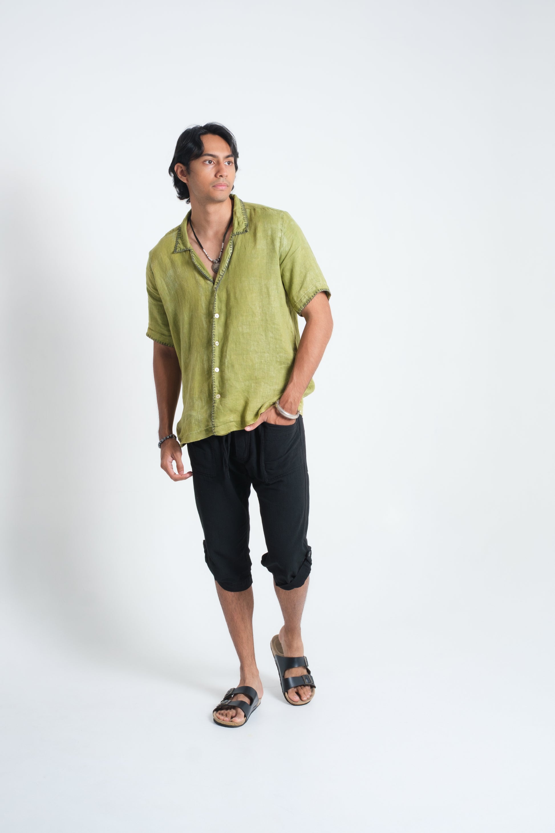The SYDNEY Shirt is made from French linen, chosen for its natural breathability and texture. Each shirt is cut, sewn, and hand-finished by artisans in Bali, where traditional weaving techniques are used to detail the collar, sleeves, and button line. The Ice White option is left pure, while the Diopside Green is naturally dyed with plant pigments in a distressed effect, making every piece individual. A true meeting of artisanal craft and modern resort style, created in the Land of the Gods.